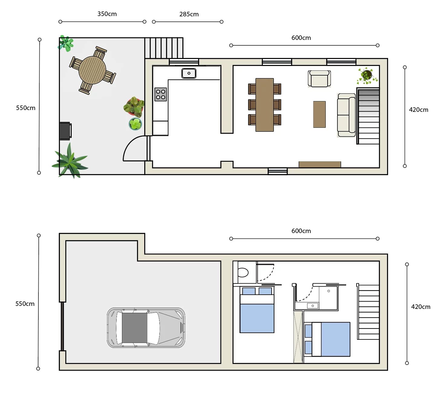 - Une seconde maison de plain-pied de 45 m², avec la possibilité d’aménager les combles pour gagner en surface.