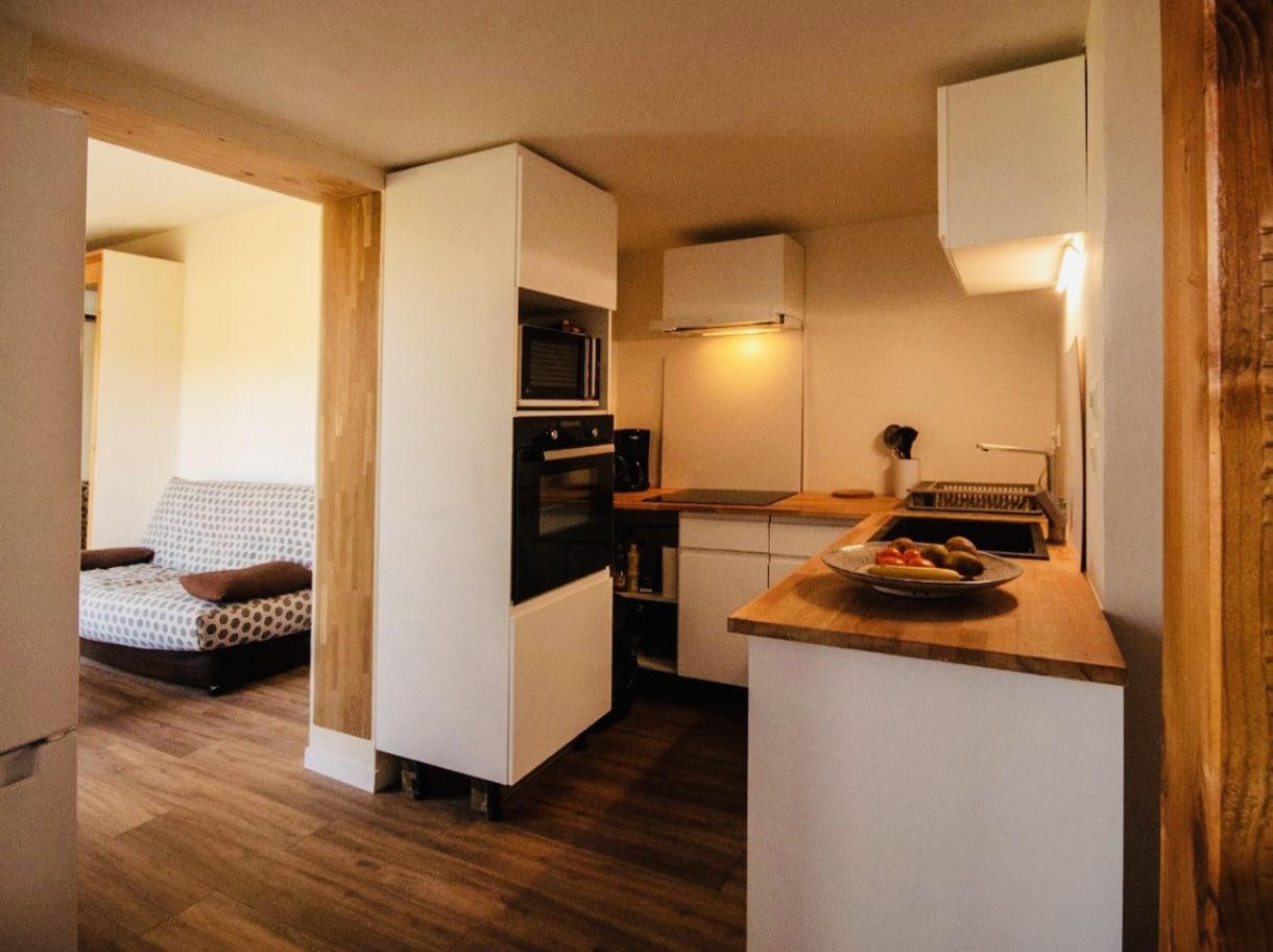 Elle se compose d'un séjour avec cuisine équipée ouverte de 21 m², d'une chambre avec placard de 12 m², d'une salle de bains avec WC, ainsi que d'une chambre en mezzanine avec placard de 9 m² et des rangements à l'étage.