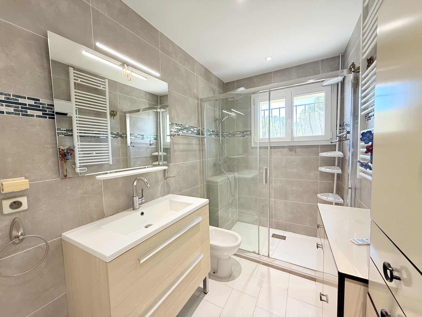 À létage, la villa propose quatre chambres confortables, toutes dotées de placards intégrés, une seconde salle deau avec sèche-serviettes, et un WC indépendant.