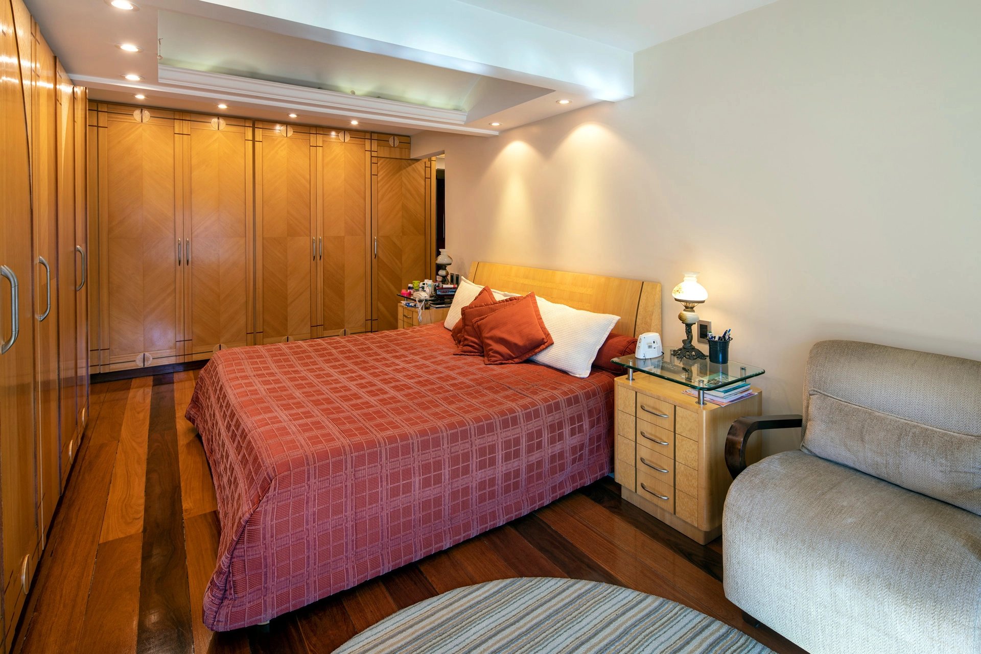 Enfin le style général de l’appartement est traditionnel décoré avec du bois noble.