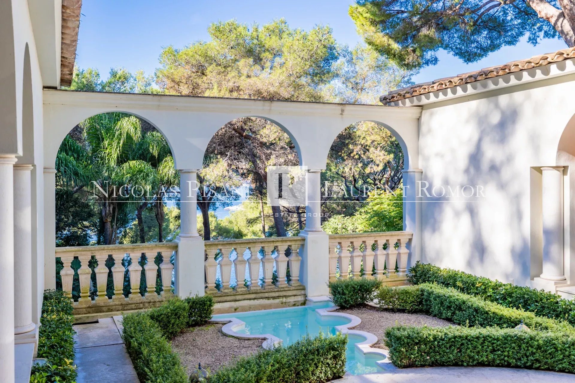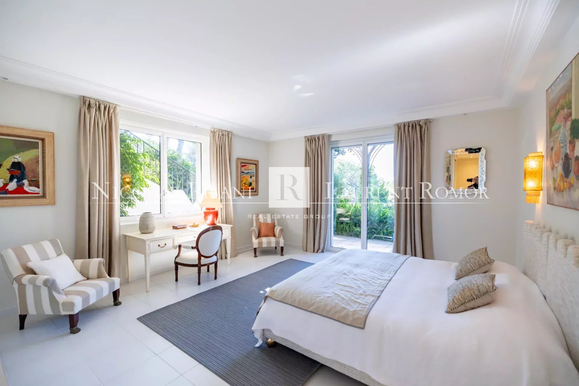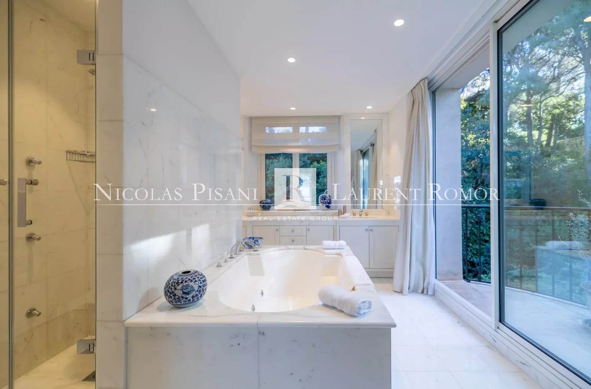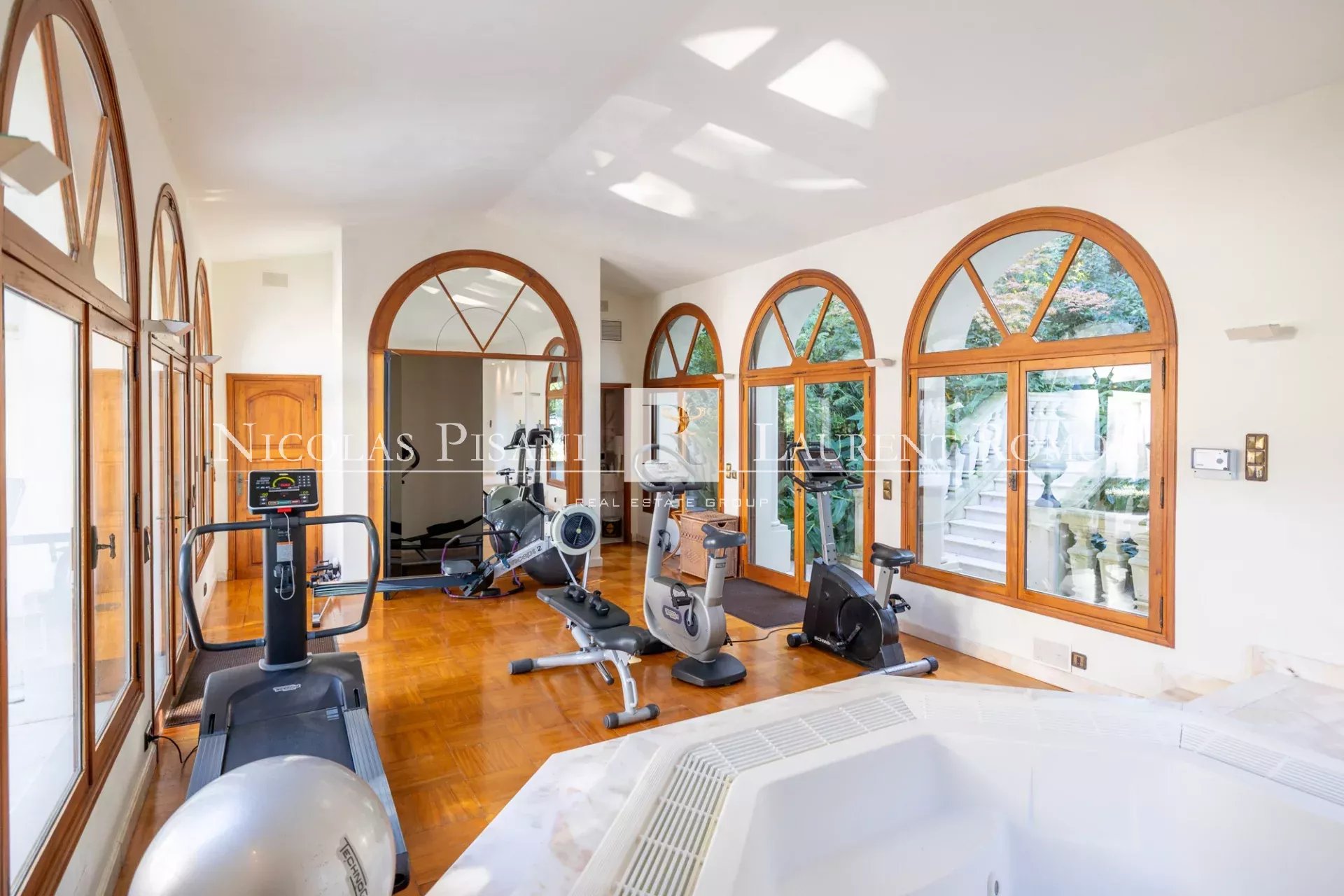 La proprietà dispone di una villa principale, di stile borghese romantico, costruita su tre livelli, con un ampio ingresso, un doppio soggiorno con camino, una sala da pranzo che si affaccia su una grande terrazza e una vista panoramica sul mare verso la Baia degli Angeli, una cucina indipendente attrezzata e in totale sei camere da letto, ognuna con cabina armadio, bagno o doccia.