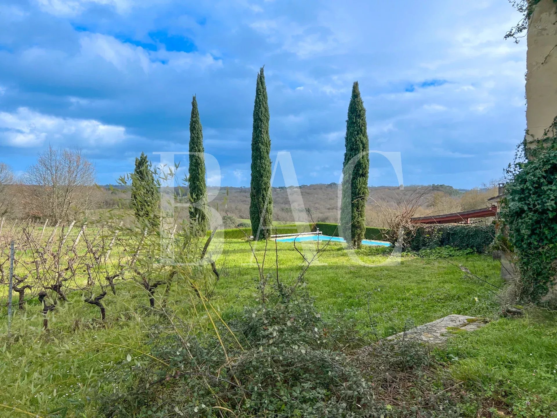 Distribuita su una proprietà di 10 ettari con vista panoramica, esternamente quest'ultima è composta da un terrazzo con piscina 7x12m, un verde boschetto, 2 ettari di giardino, oltre a 6,5 ettari di vigneto di Merlot e Cabernet Sauvignon.