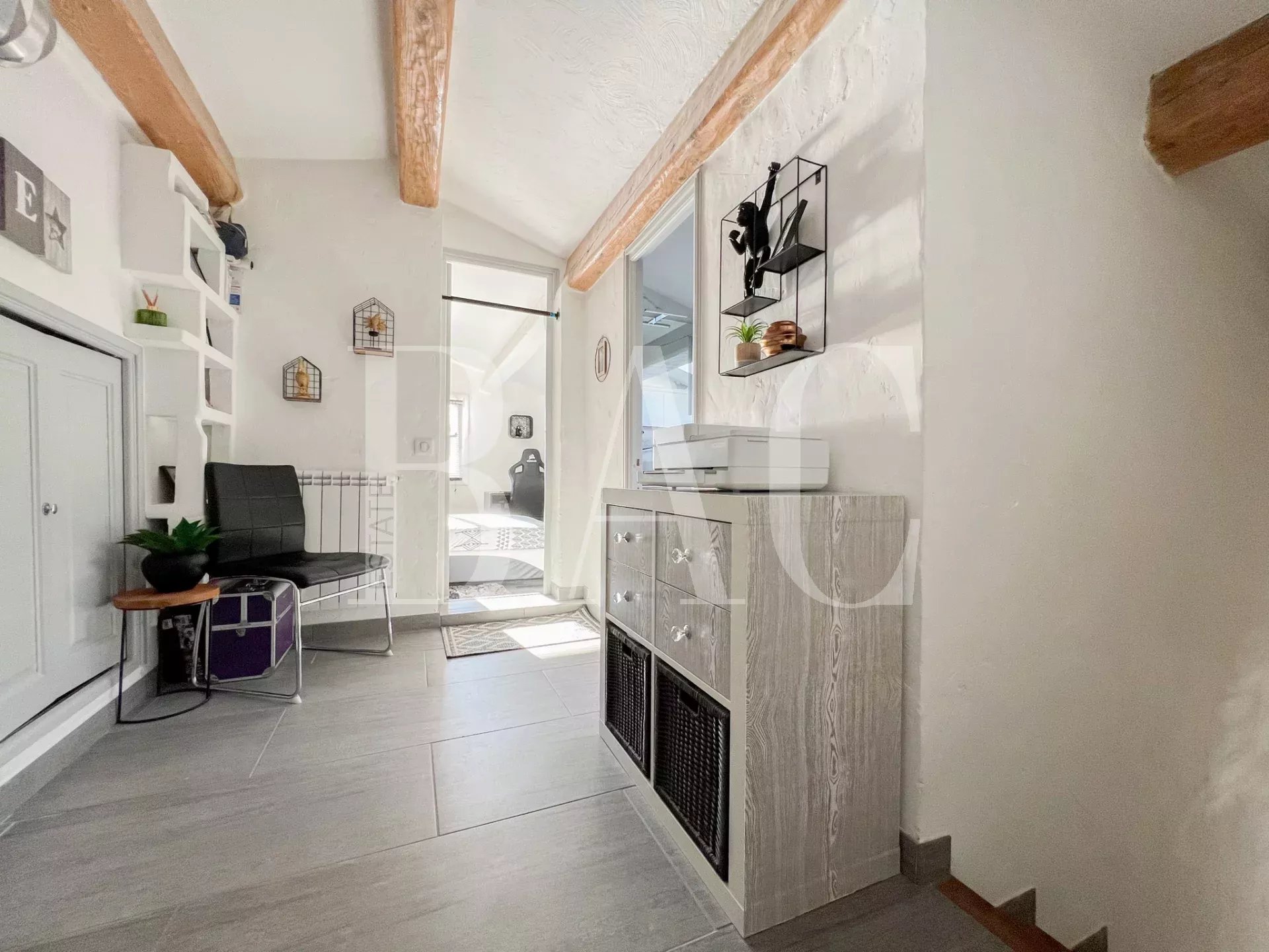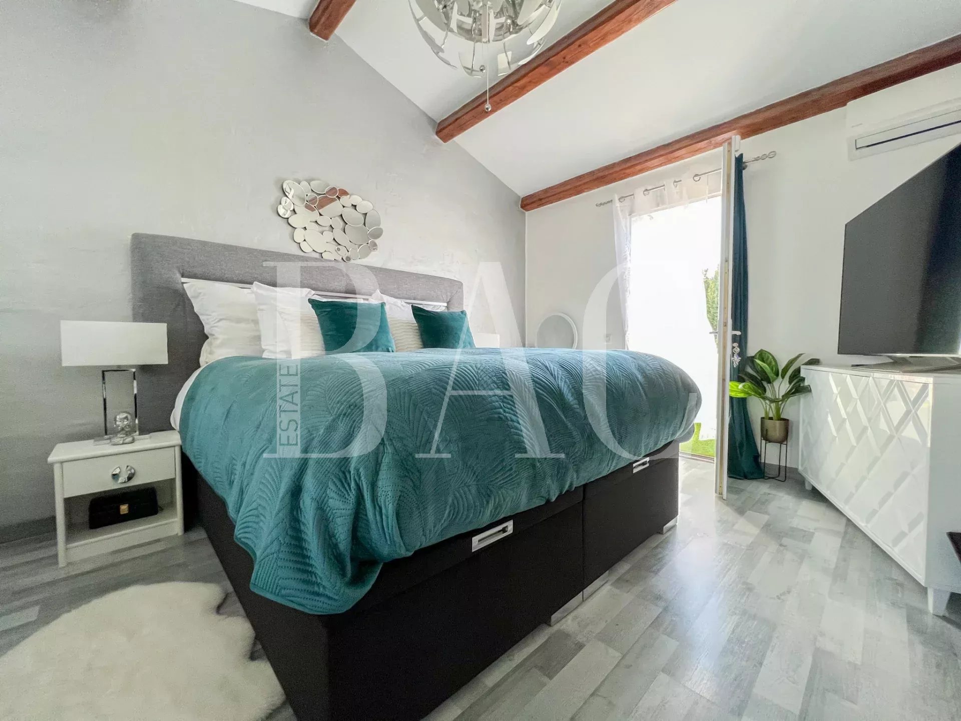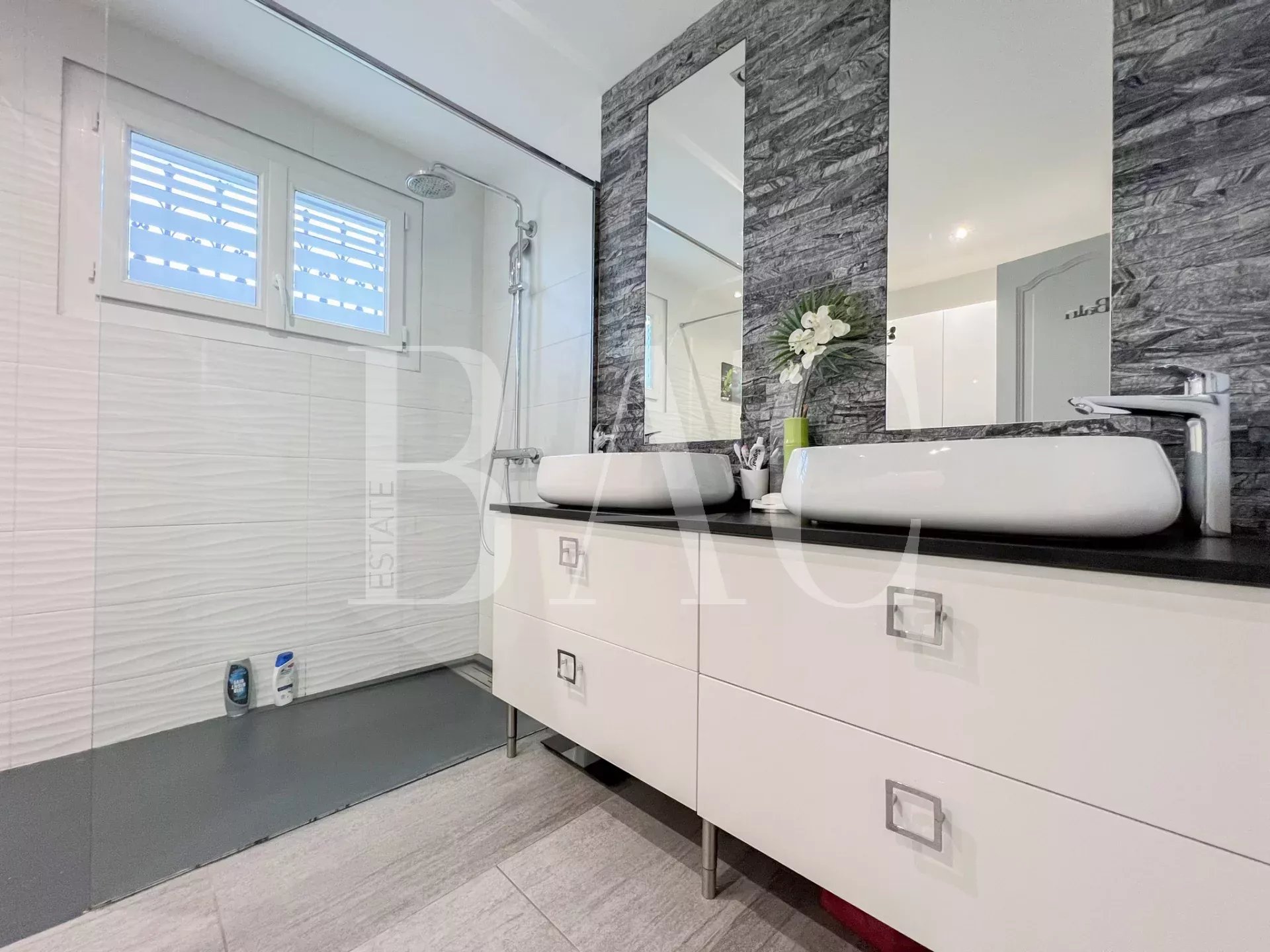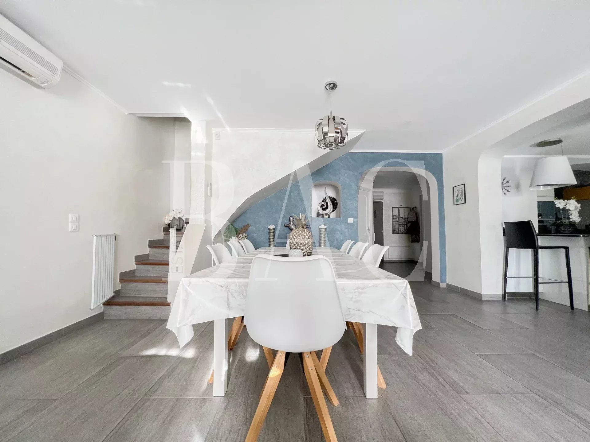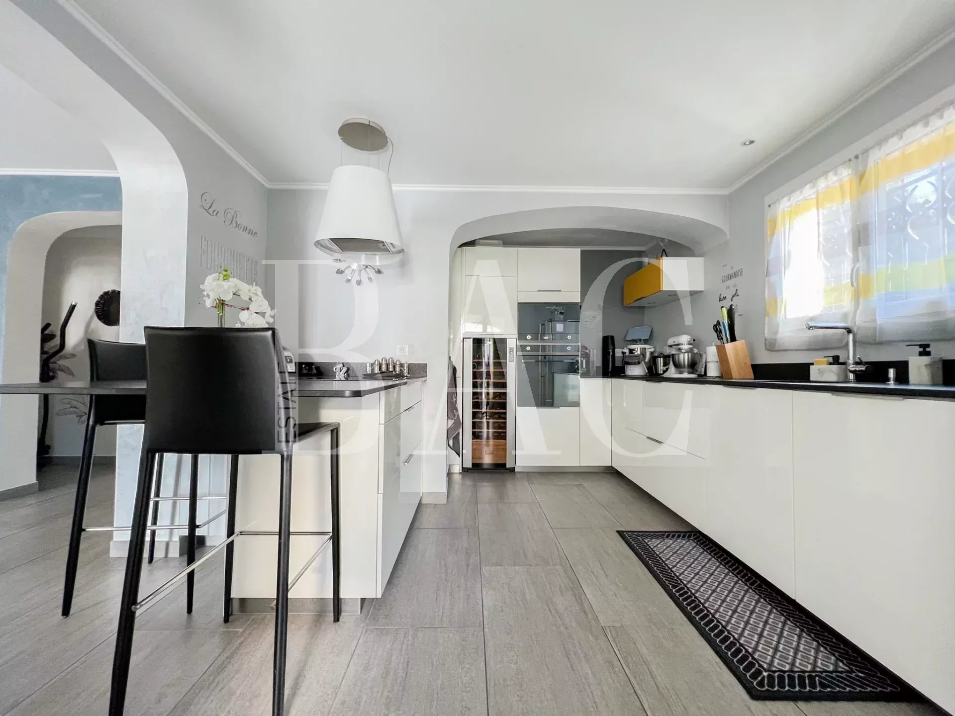 Située dans un environnement très calme, à deux pas des commodités, cette belle villa de 180m2 entièrement rénovée avec modernité et prestations de qualité profite d'une vue exceptionnelle sur le rocher de Roquebrune.