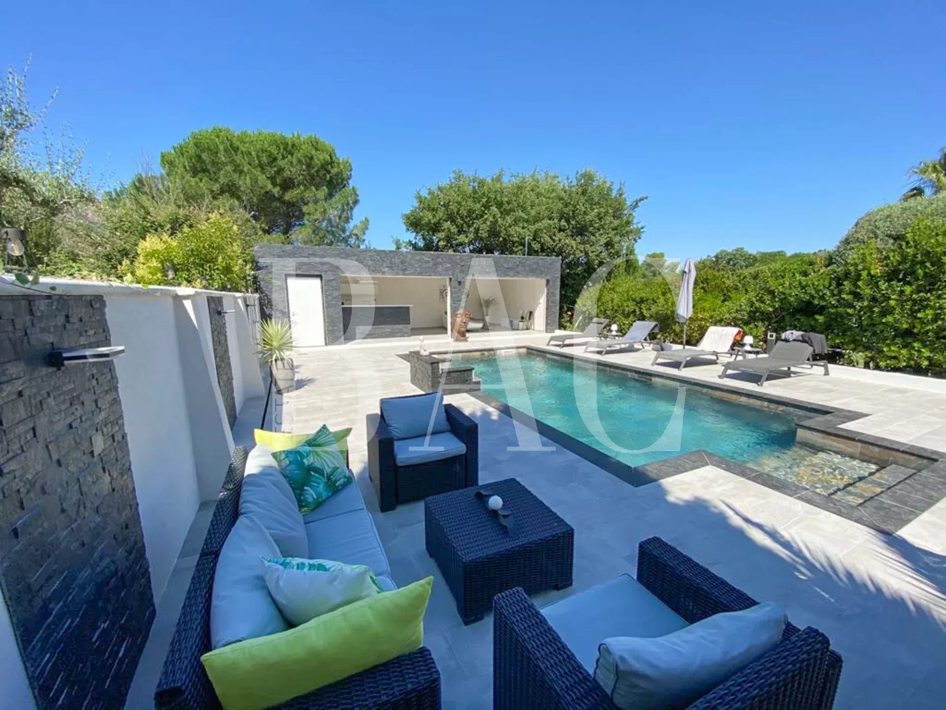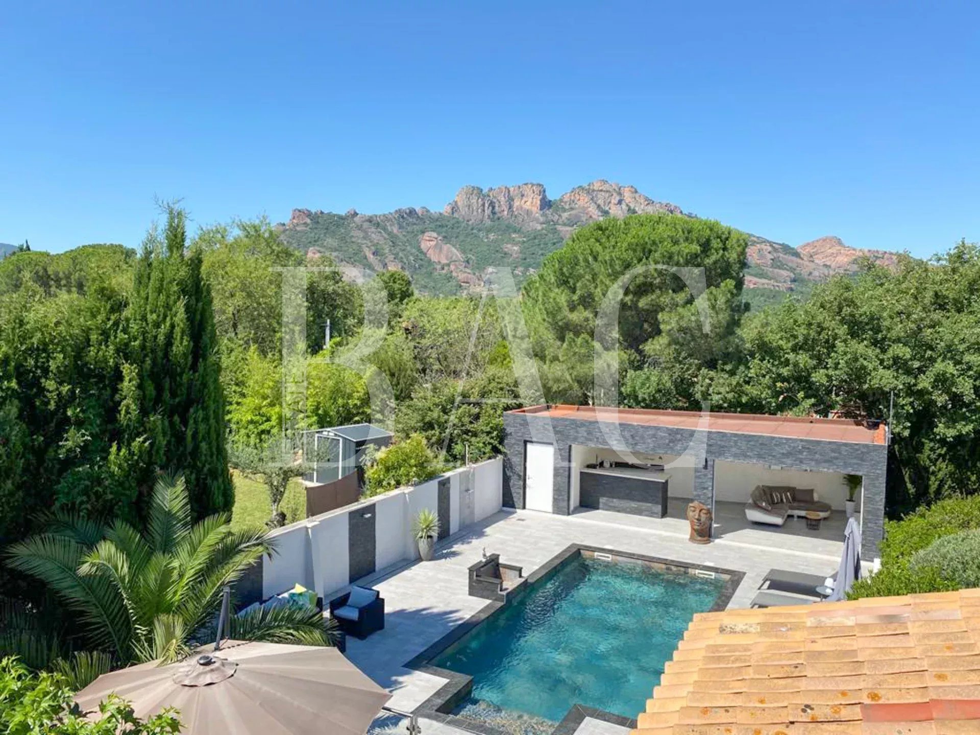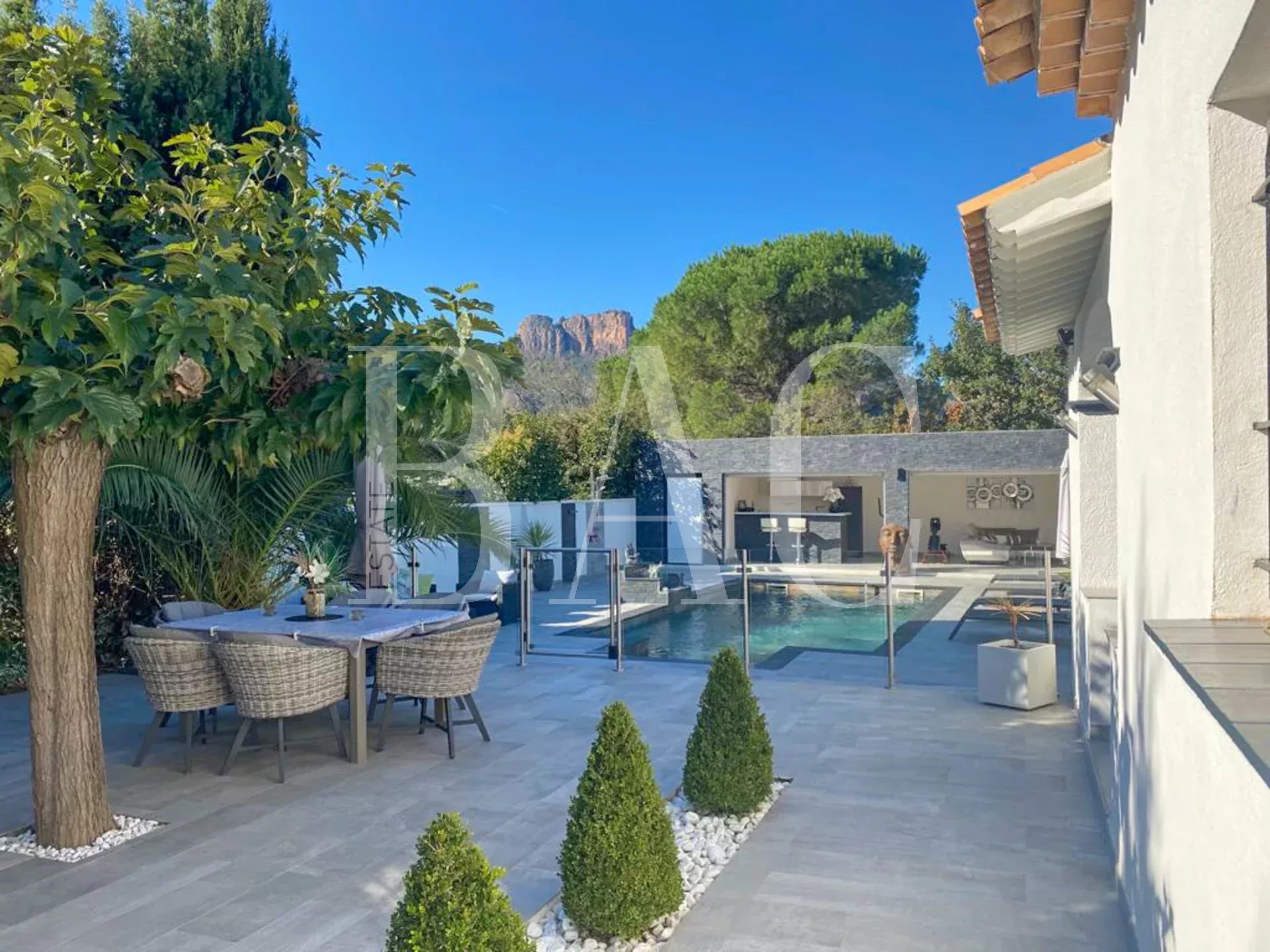 Coté extérieur la villa profite d'un bel espace piscine avec pool house entièrement aménagé, d'une cuisine extérieure entièrement équipée et de plusieurs espaces de rangement.