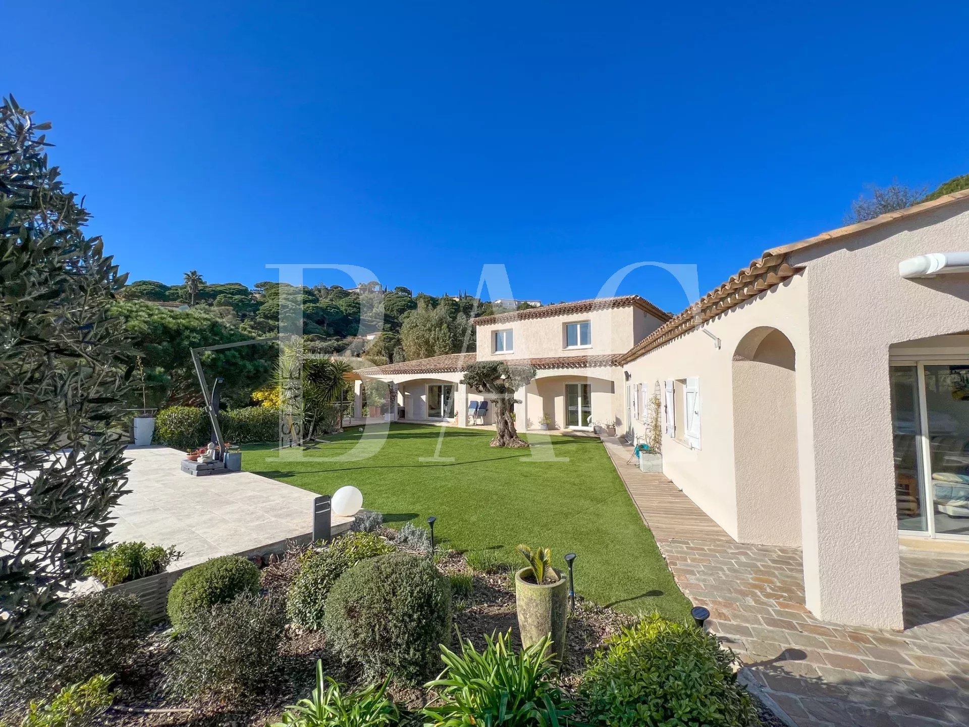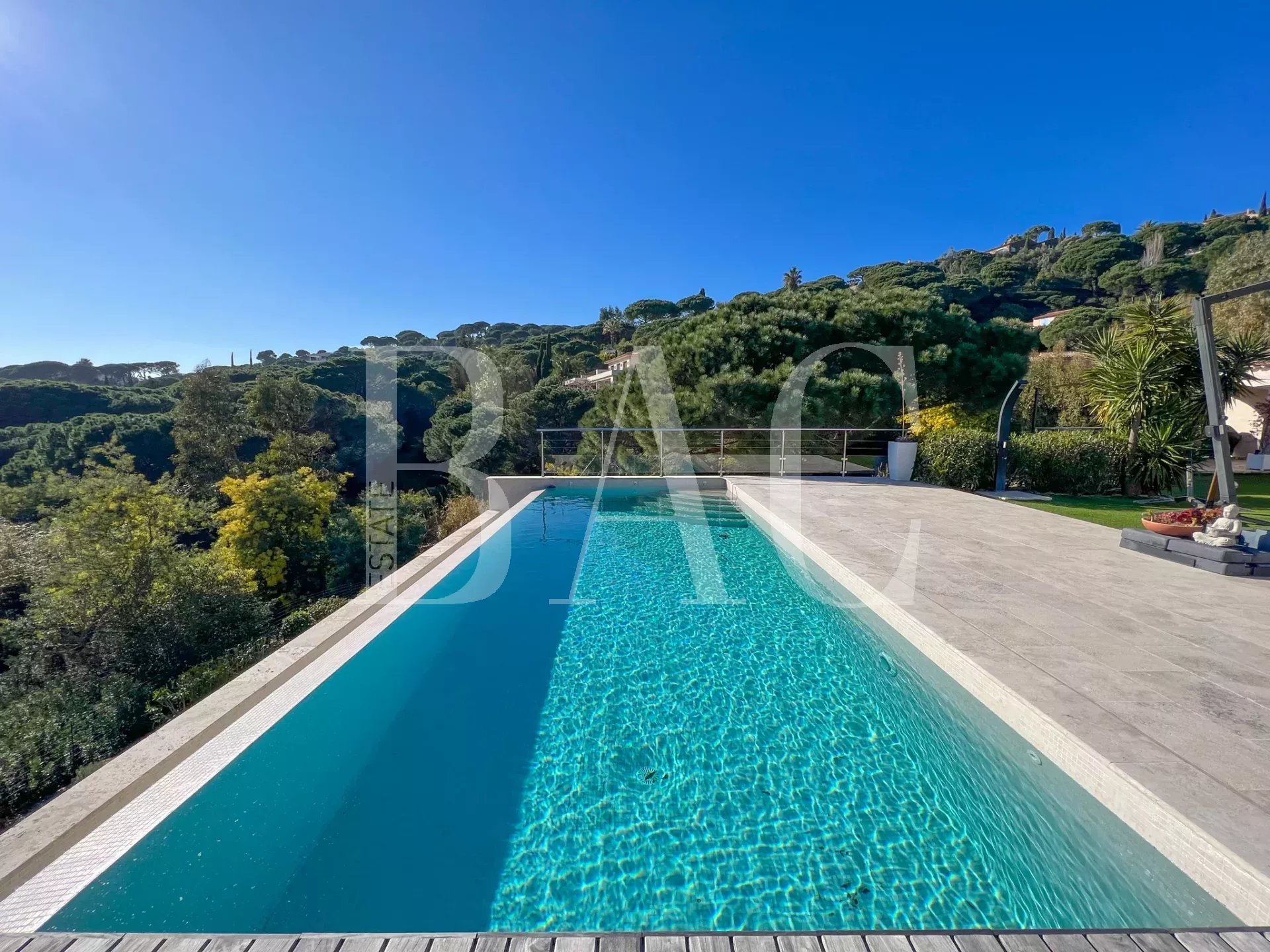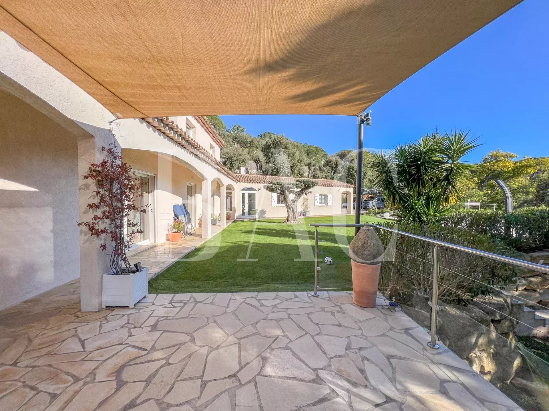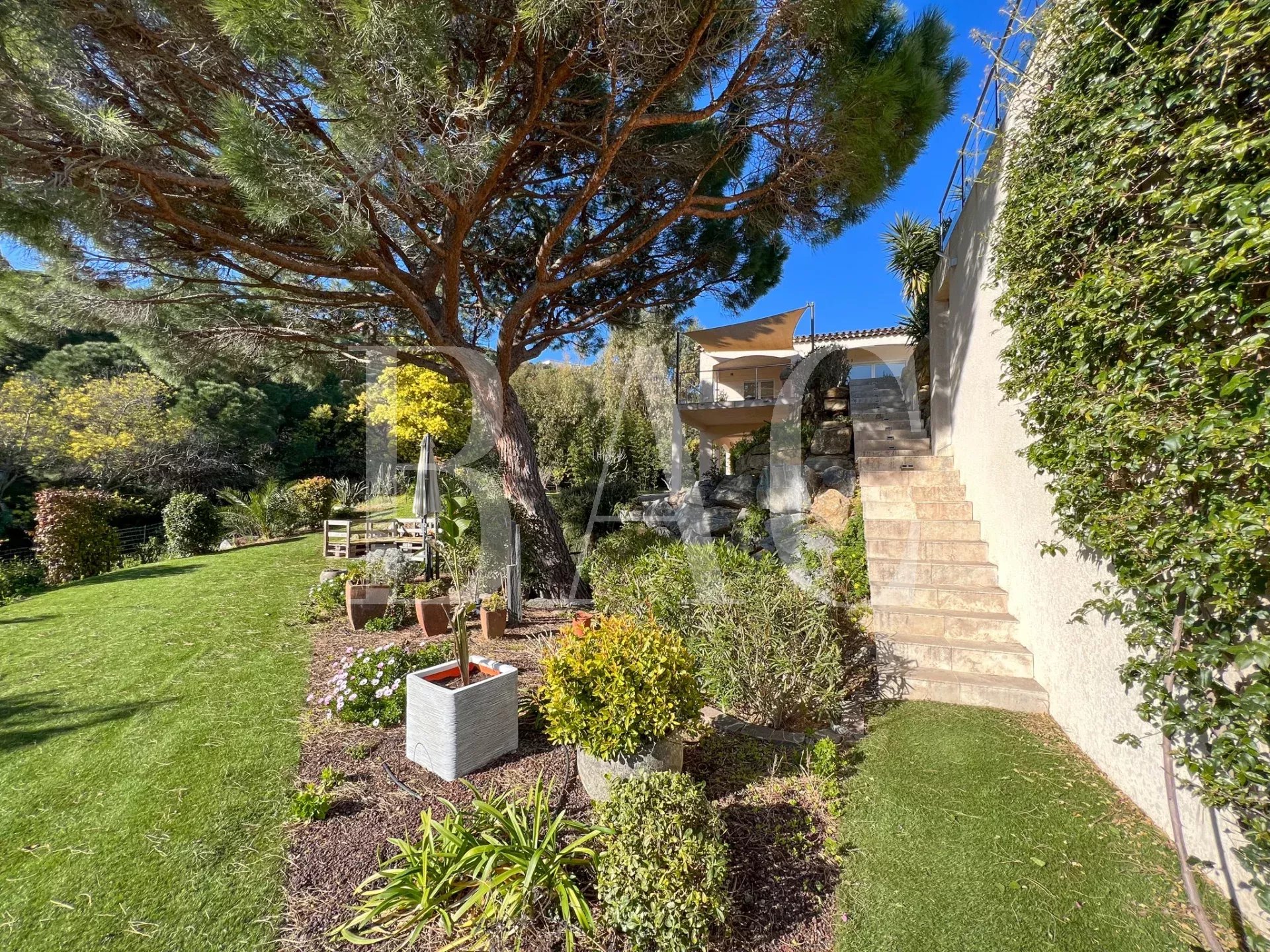 Située à seulement 1.5km des plages, dans le domaine recherché de la Nartelle, cette magnifique villa de 280m2 est édifiée sur un beau terrain arboré et paysager de 2.800m2 avec piscine à débordement chauffée de 10 x 4m. Elle se compose au rez-de-chaussée d'une entrée, d'un séjour/salle à manger, d'une cuisine entièrement équipée avec cellier, d'une suite parentale avec salle de douche, grand bureau. A l'étage, deux chambres et une salle de bain avec baignoire balnéo. La propriété dispose également d'un appartement T2 avec entrée indépendante. Une salle de cinéma, une salle de jeu ainsi qu'un careport avec panneaux solaires pouvant accueillir 2 véhicules viennent compléter ce bien.