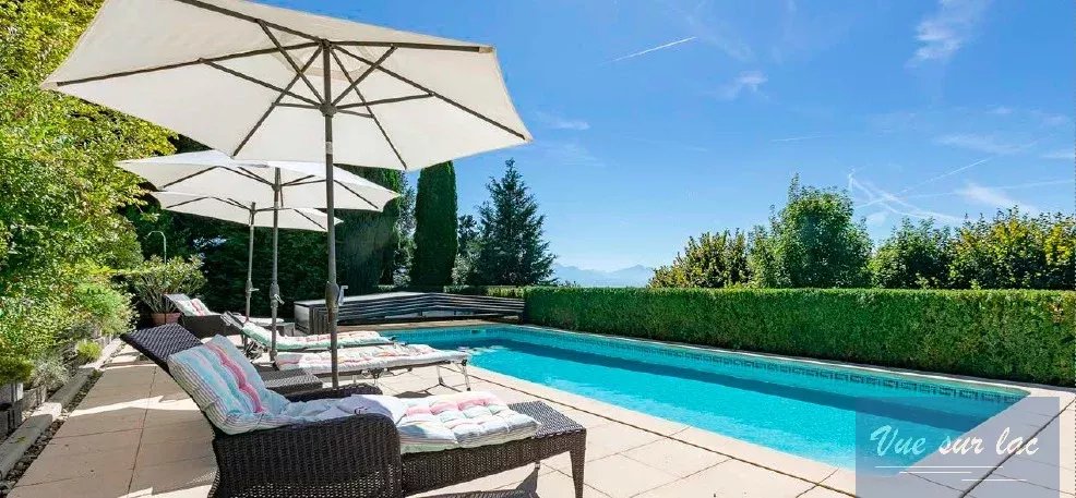 Les espaces de vie sont vastes, élégants et lumineux et donnent accès à de belles terrasses, un jardin joliment arboré avec piscine extérieure chauffée et tous profite d’une vue panoramique impressionnante sur le lac et les montagnes.