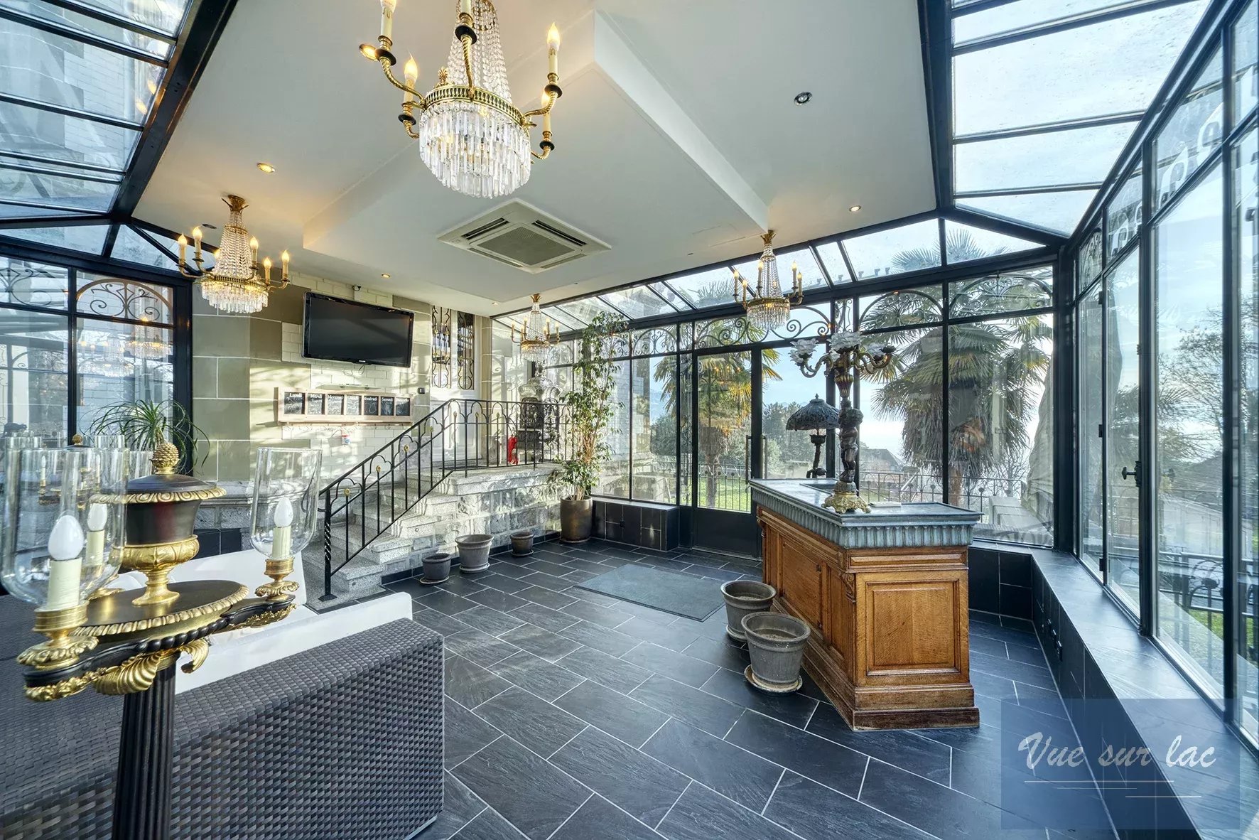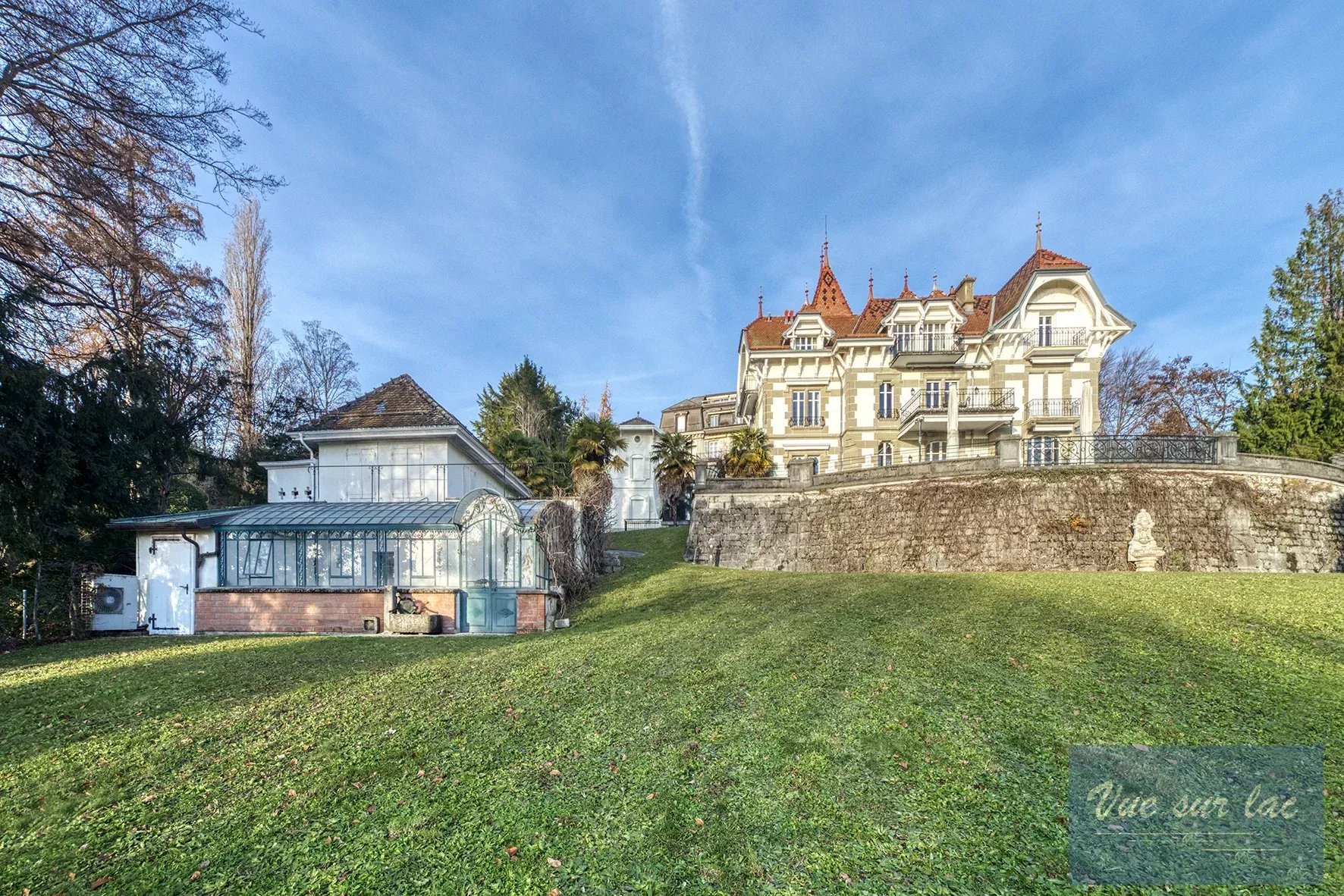 A l’ouest, dans le parc, une annexe avec encore une belle verrière abrite un autre appartement de 2,5 pièces, une cave à vin et des locaux de rangement.