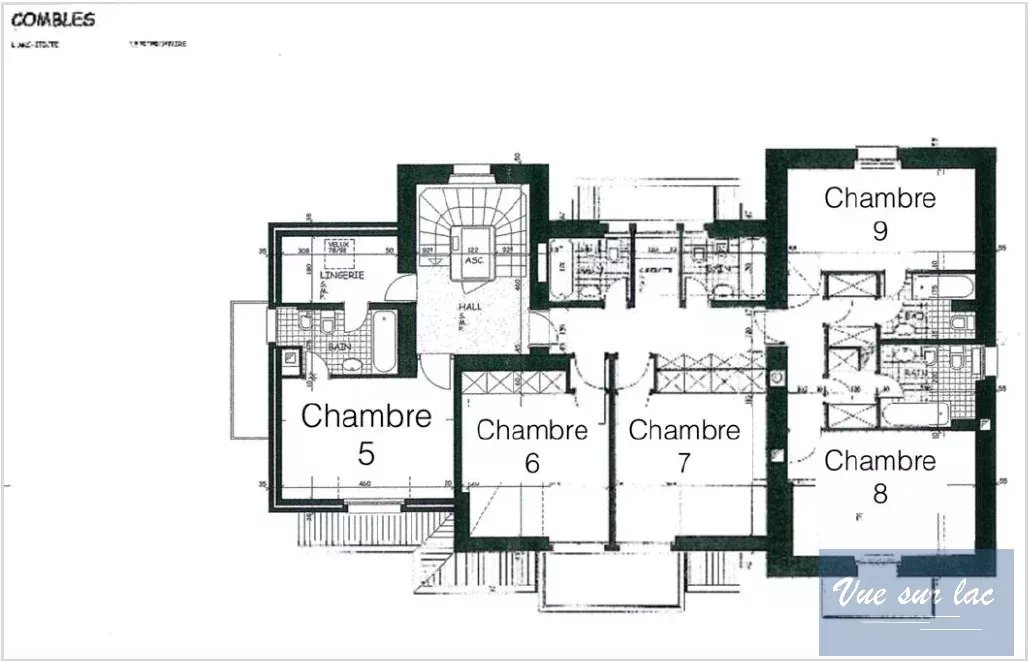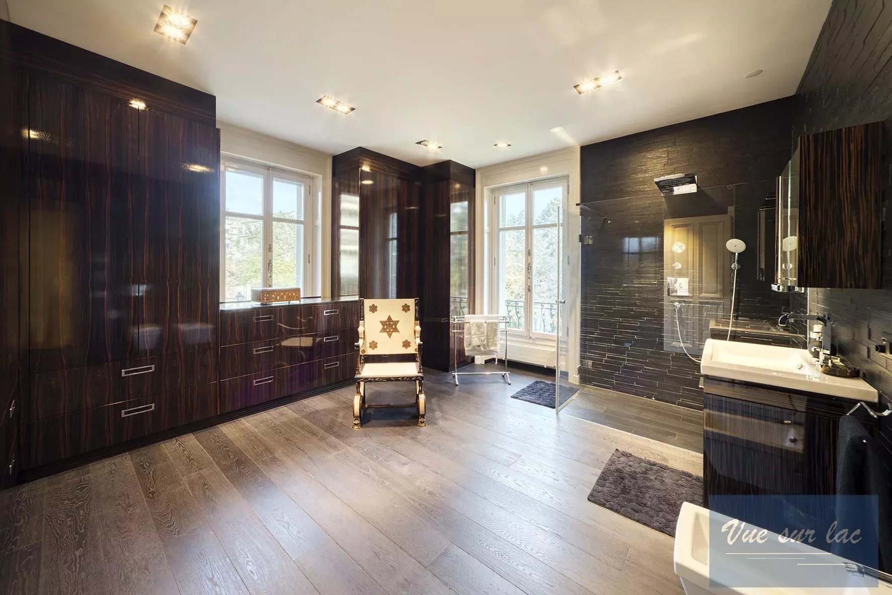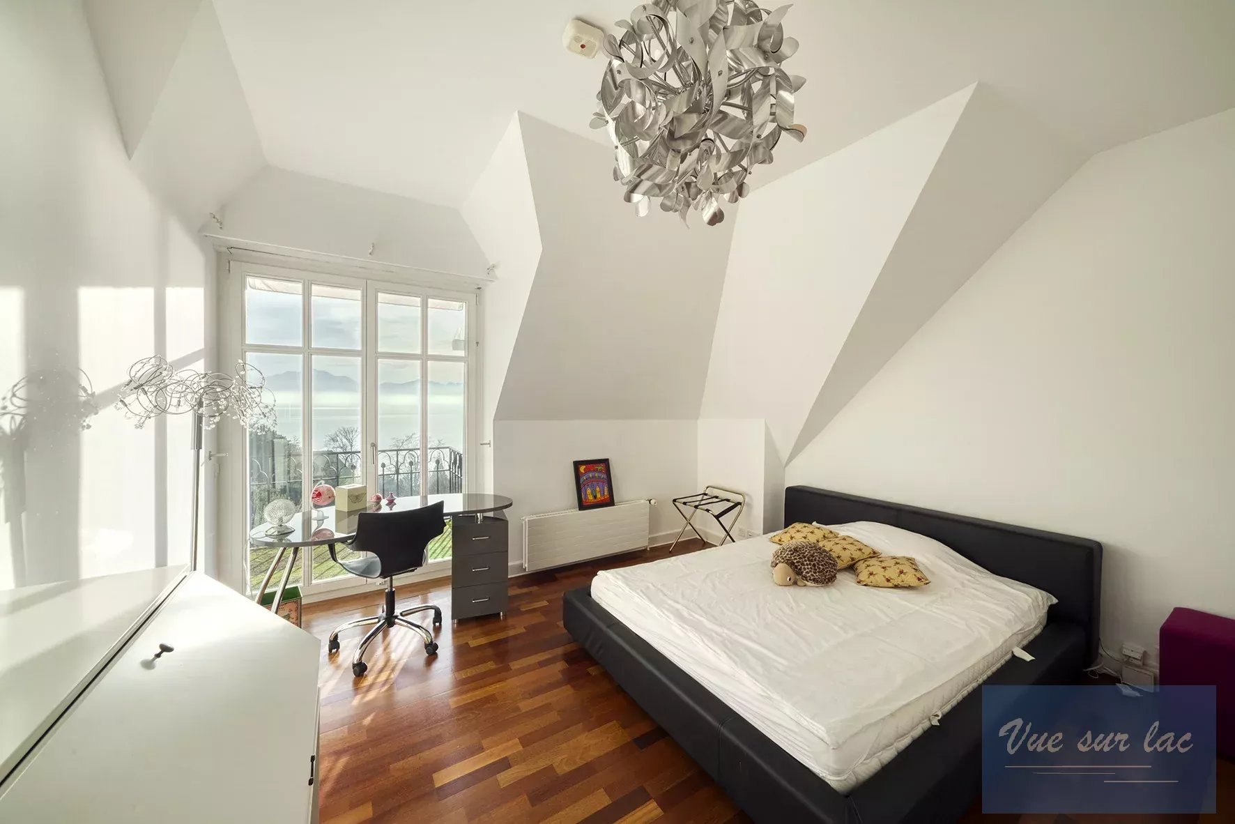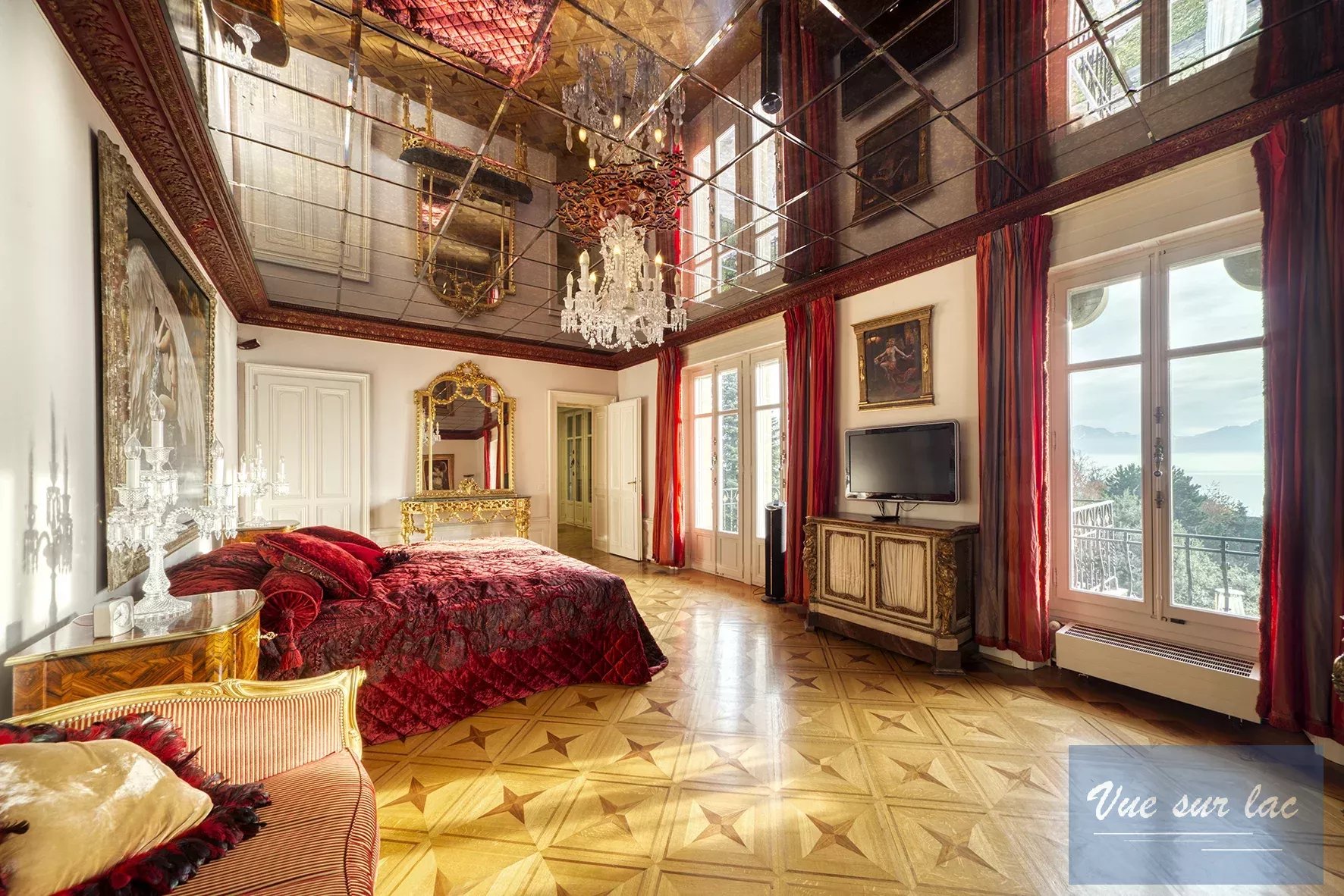 Les 7 chambres et le grand bureau sont répartis sur 2 étages et bénéficient pour certains d'une terrasse donnant sur le jardin, le lac et les montagnes. Au rez inférieur se trouvent une salle de cinéma, une chambre de service, les locaux techniques, une buanderie, une cave et une chambre forte. Un ascenseur intérieur dessert les quatre étages que compte cette maison. Toutes les pièces de la maison sont climatisées.