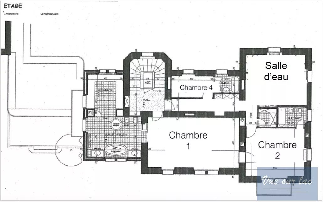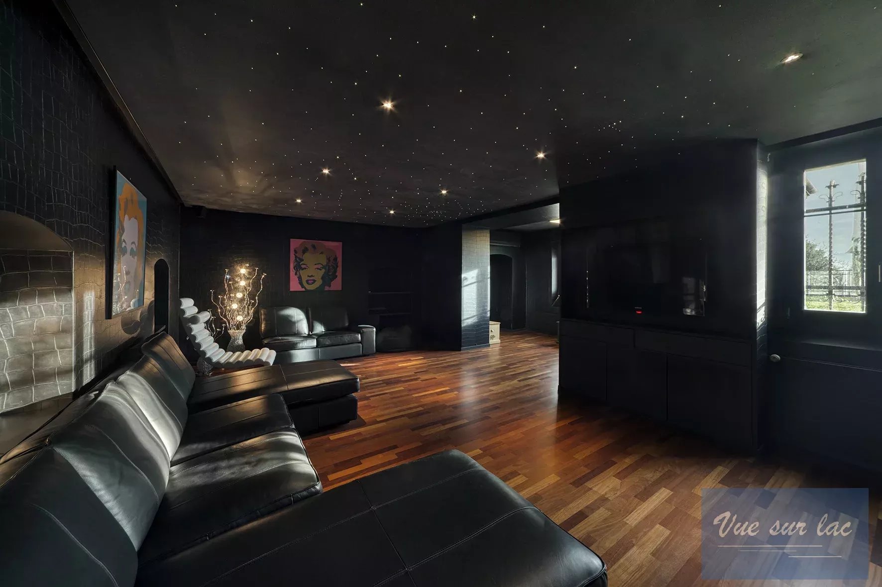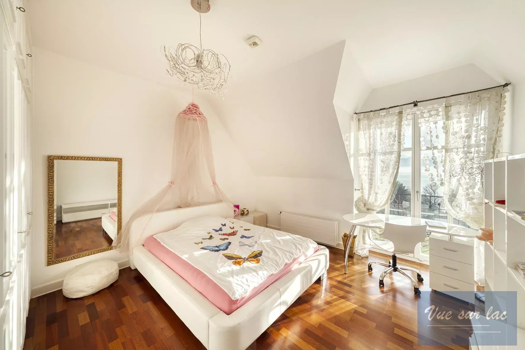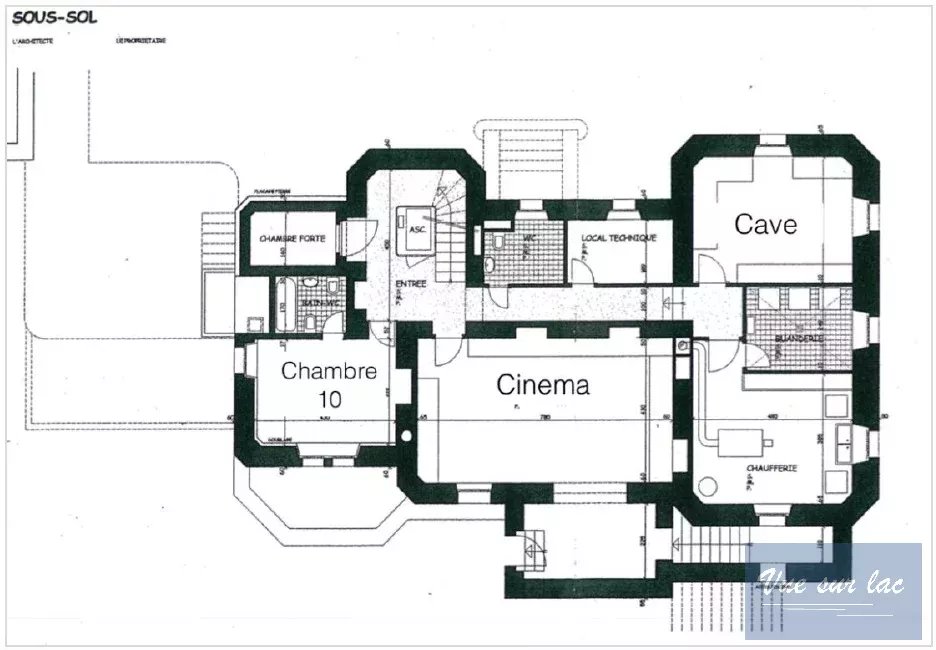 Les 7 chambres et le grand bureau sont répartis sur 2 étages et bénéficient pour certains d'une terrasse donnant sur le jardin, le lac et les montagnes. Au rez inférieur se trouvent une salle de cinéma, une chambre de service, les locaux techniques, une buanderie, une cave et une chambre forte. Un ascenseur intérieur dessert les quatre étages que compte cette maison. Toutes les pièces de la maison sont climatisées.