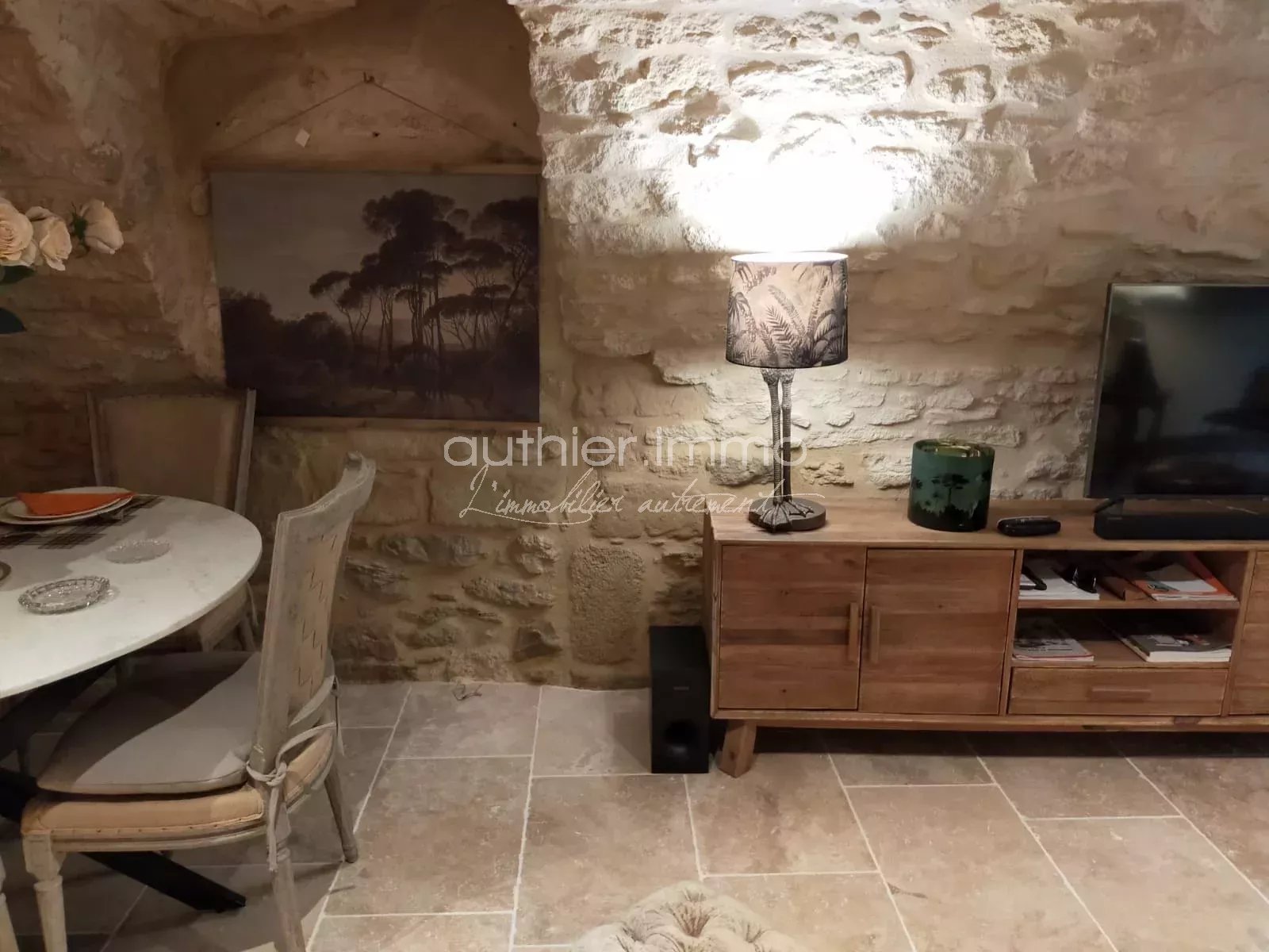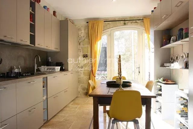 Le rez-de-chaussée a été investi par deux beaux espaces de vie : une très agréable cuisine dinatoire (15,6 m2), dont les lignes contemporaines se marient avec bonheur avec la chaleur de la pierre, et un superbe salon voûté (32 m2) complètement ouvert sur un insoupçonnable patio (20 m2), végétalisé et entouré de murs en pierres sèches.