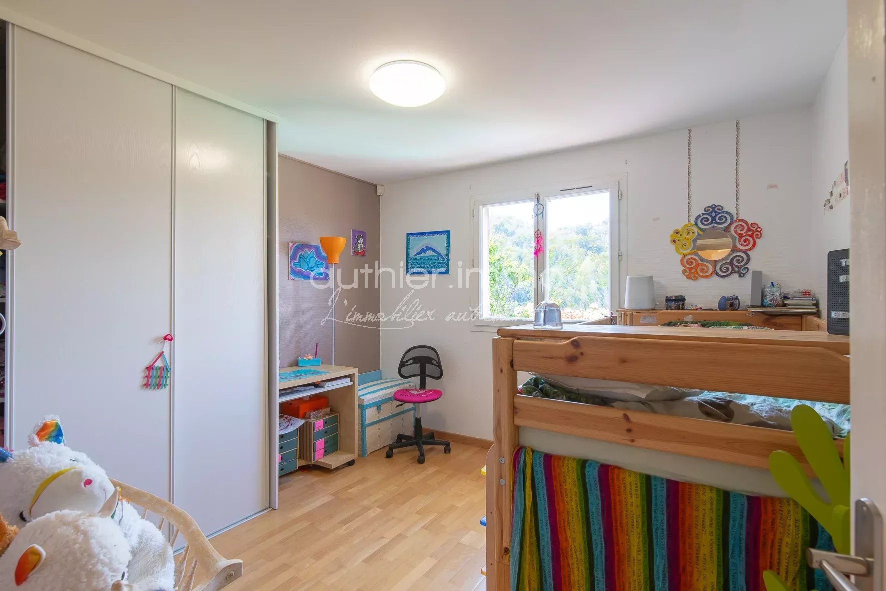 Sur le 2ème niveau de la maison qui est dédié aux espaces des enfants, un couloir distribue successivement trois chambres et une salle de bains avec WC.