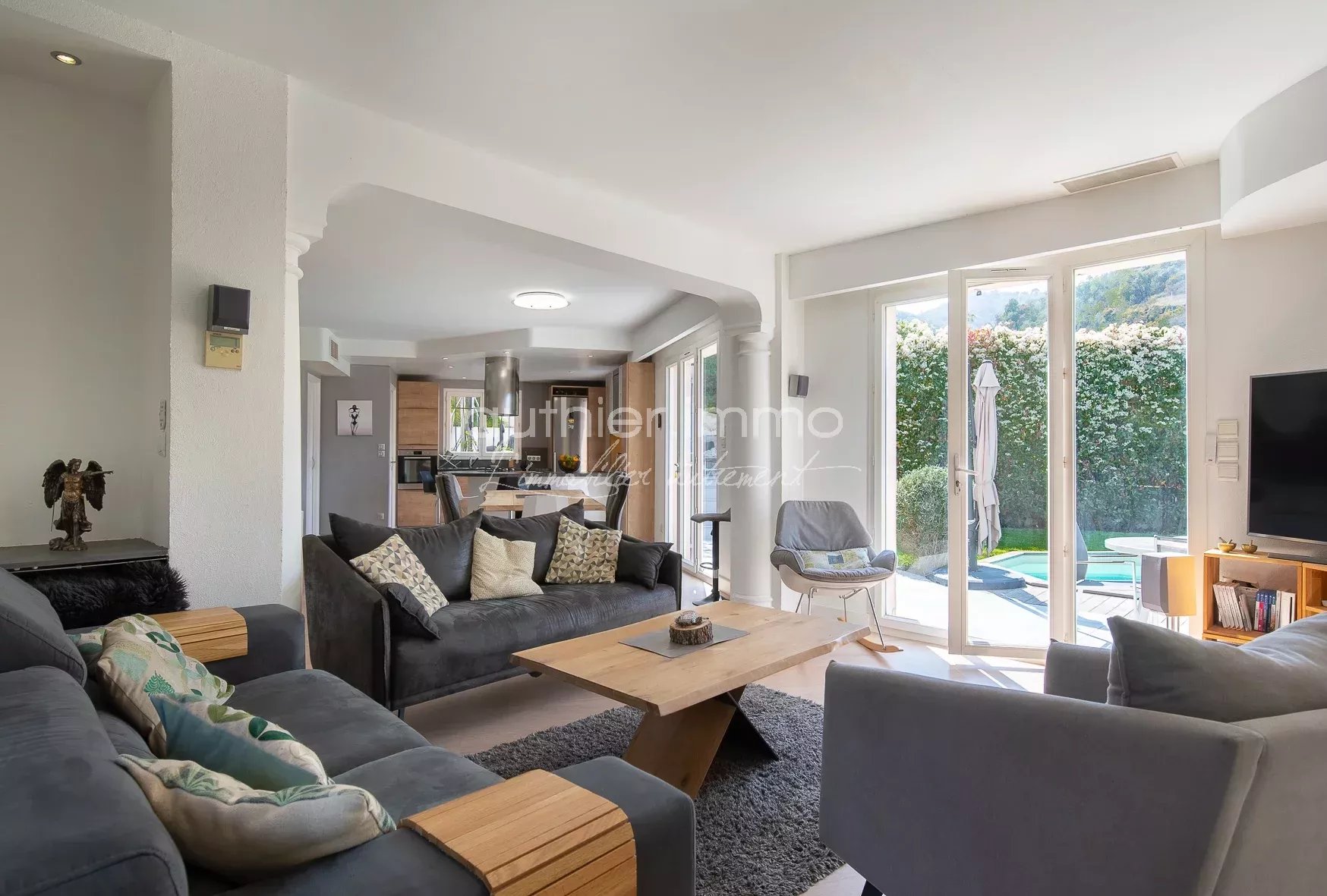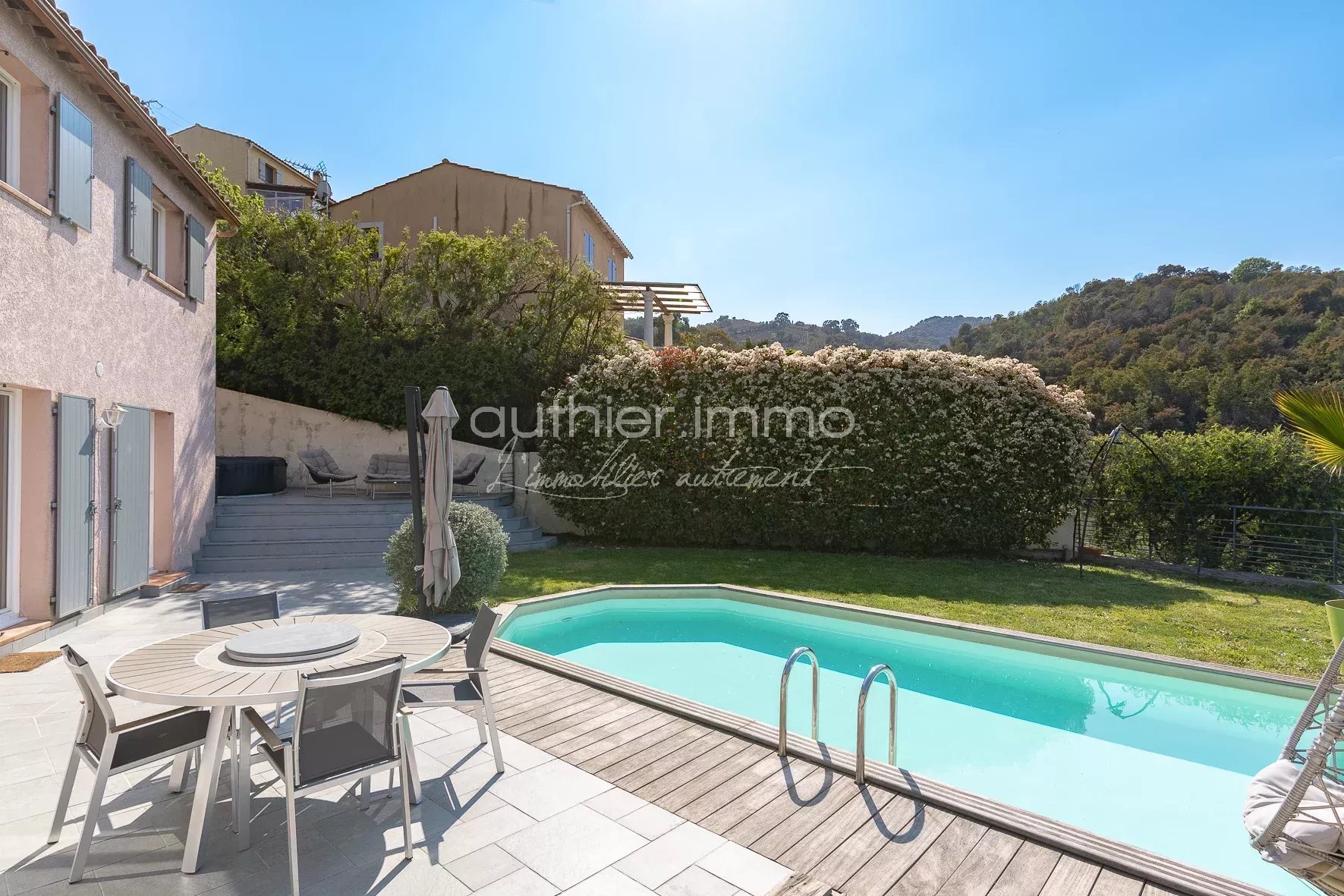 EXCLUSIVITÉ - VENDUE - Sur les Hauteurs de PEGOMAS, Cette villa néo-classique avec piscine développe ses 172 m² (121m² Loi Carrez) sur deux niveaux et est entourée d’un jardin de 800 m² avec une vue imprenable sur la nature environnante.