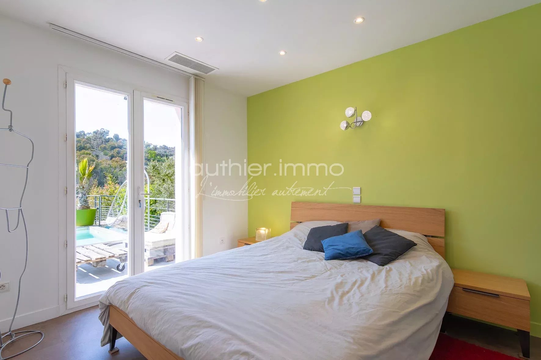 Les espaces de vie situés au 1er niveau ont été aménagés de manière à être en parfaite harmonie avec l’extérieur grâce notamment à ses ouvertures et sa terrasse permettant ainsi l’accès à la piscine. La cuisine est ouverte sur l’espace dinatoire et le salon, une chambre avec salle d'eau trouve sa place près du jardin.