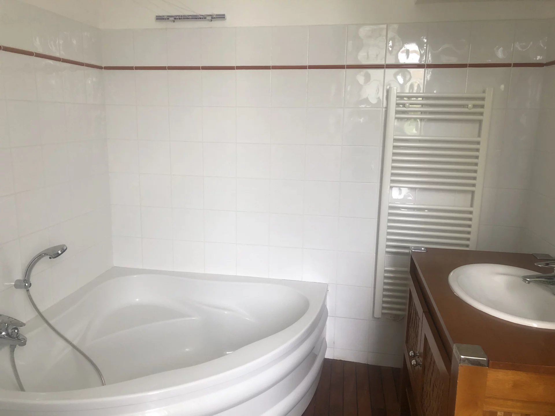 Appartement 3 pièces composé d'un séjour coin cuisine, salon, deux chambres, une salle de douche et une salle de bains
