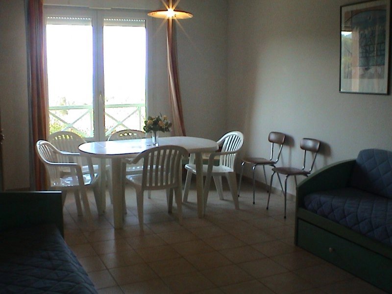 Dans une résidence avec piscine à 2km de Saint-florent et 300 m de la mer, un appartement composé d'un séjour avec 2 lits à une place, coin cuisine, une chambre, une salle d'eau et une terrasse vue mer