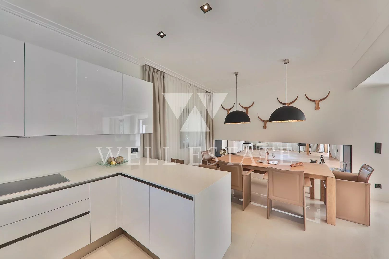 RDC : une éntrée, un double salon, une salle à manger avec une cuisine américaine entièrement équipée, WC invité.