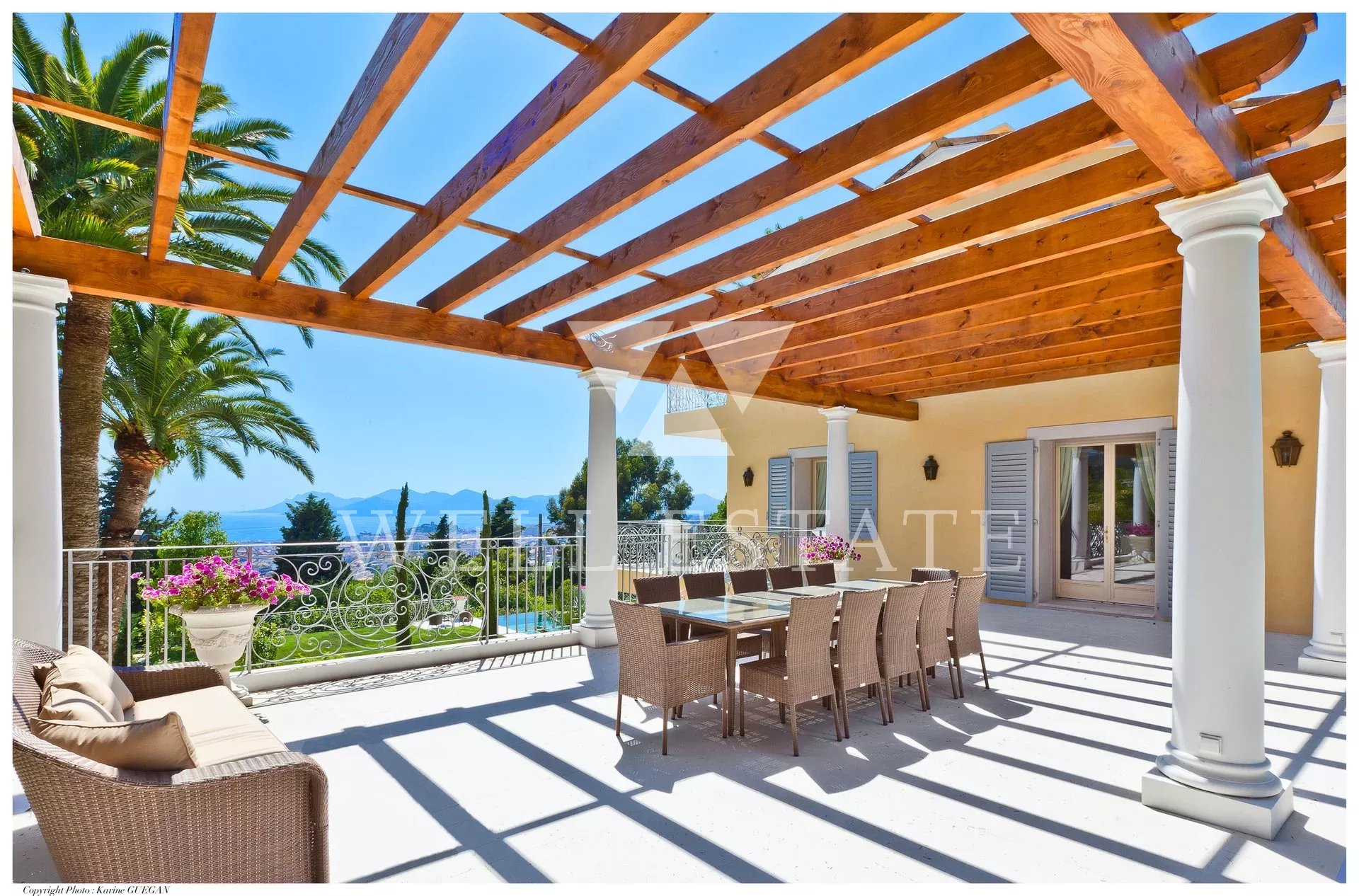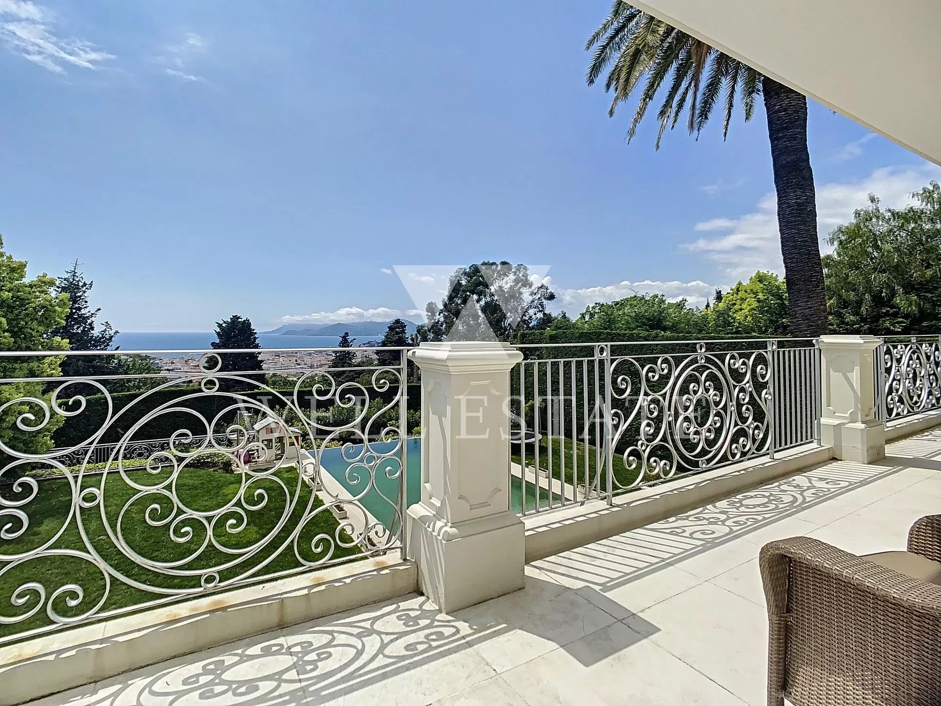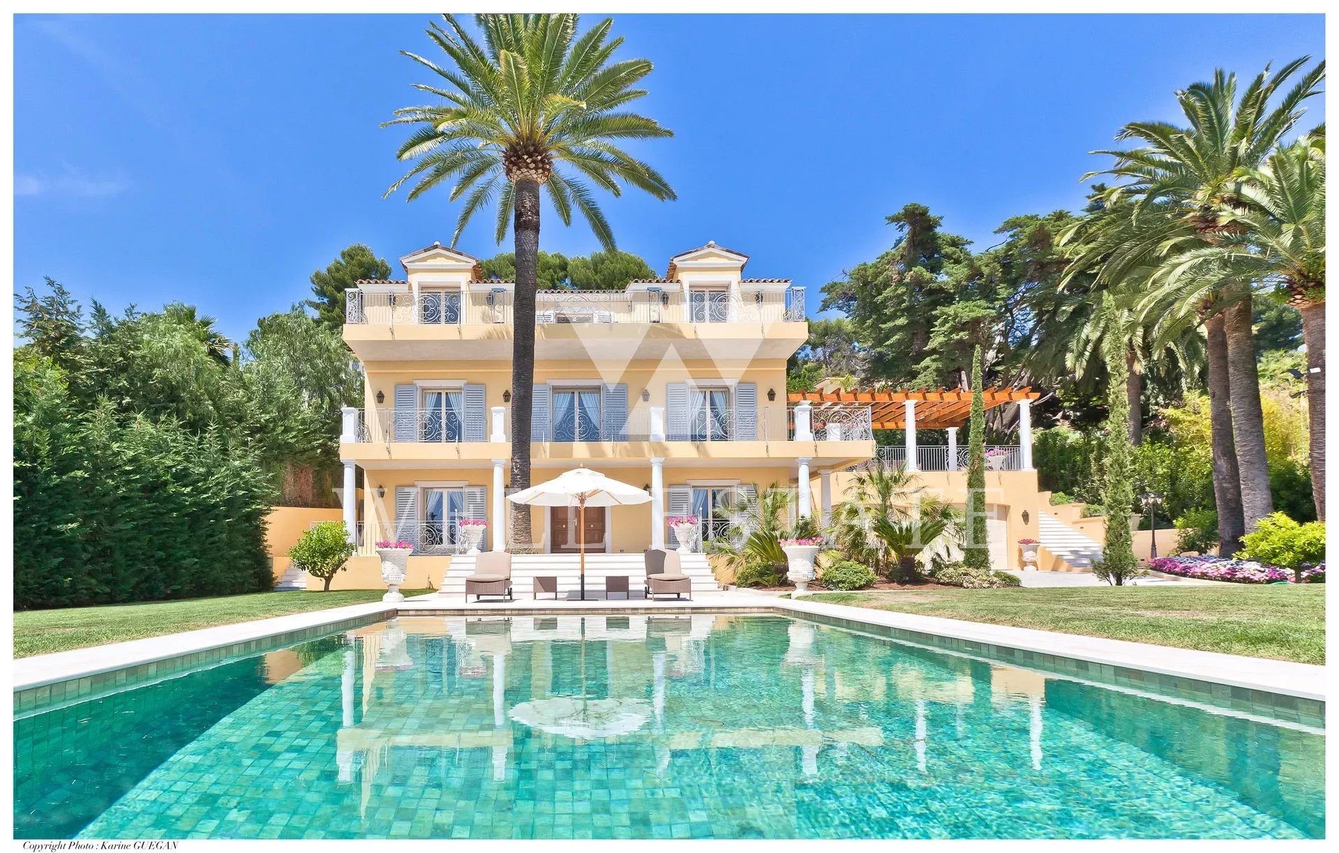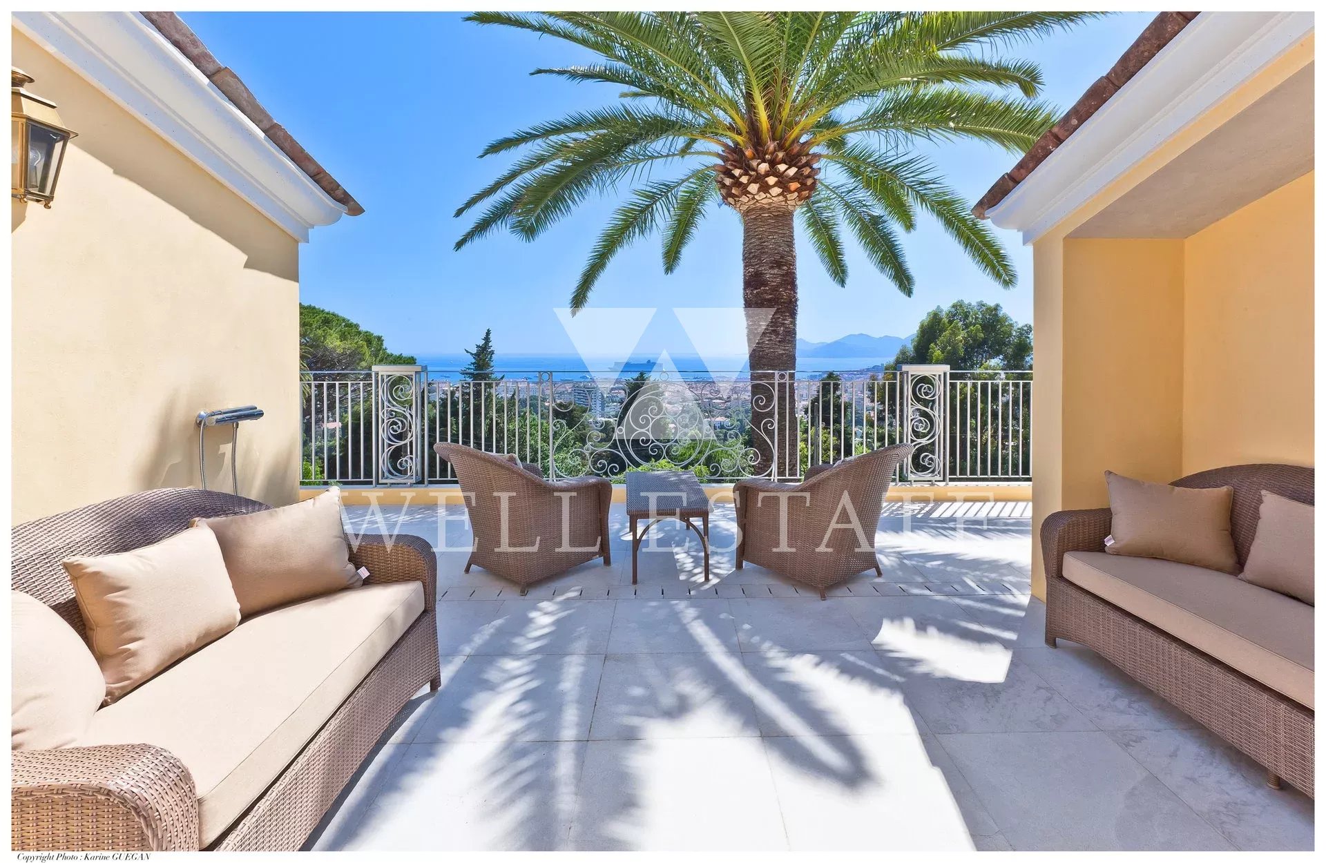 Magnifique villa en position dominante, bénéficiante d’une vue mer panoramique sur la baie de Cannes et l'Estérel, avec un jardin de 1600 m2 au coeur du quartier calme et plus recherché de Cannes.