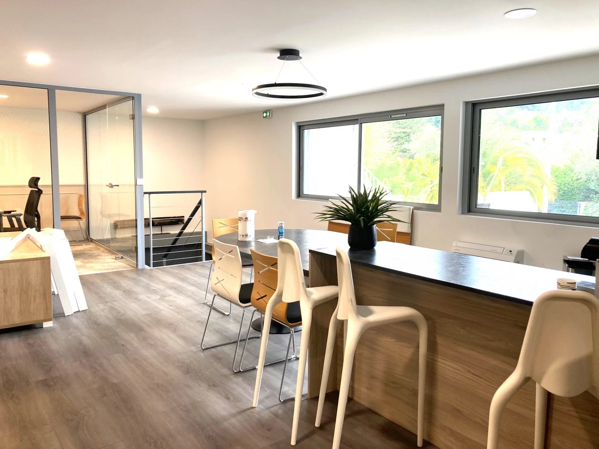 Très forte visibilité depuis plusieurs axes pour cet élégant local commercial en duplex bénéficiant de très belles prestations d'une superficie totale de 328m² environ situé dans un batiment récemment ravalé .La superficie au rez-de-chaussée est d'environ 160m² composé d'un espace commercial donnant sur vitrines ,un espace bureaux ,tous deux entièrement climatisés ,sanitaires avec douches ainsi qu'un espace stockage avec une hauteur sous plafond supèrieur à 3 m accessible aux poids lourds .Au 1er étage ,un plateau à usage de bureaux entièrement climatisés .avec cloisons entièrement vitrées ,avec,sanitaires homme et femme , espace détente,salle de réunion .