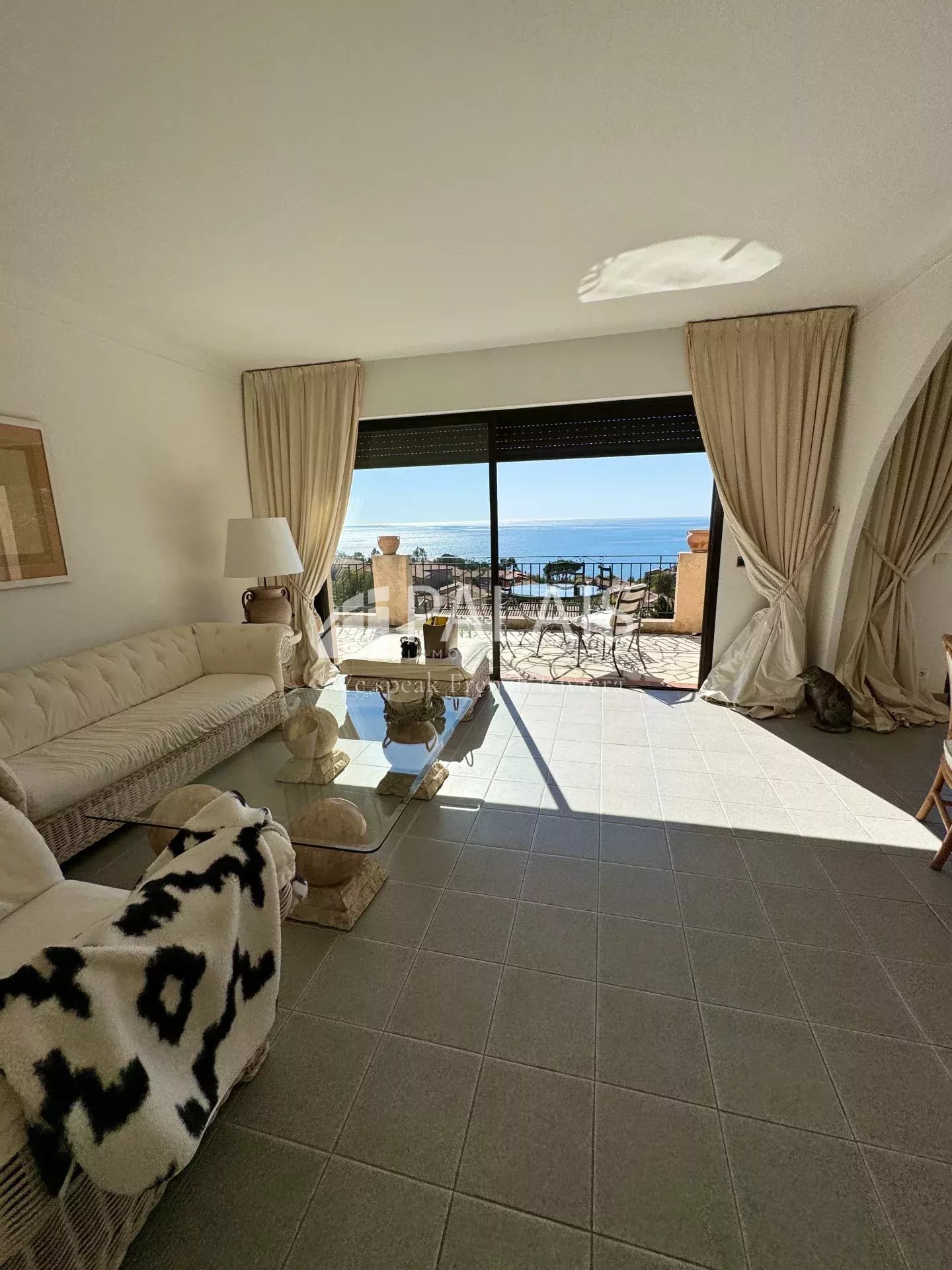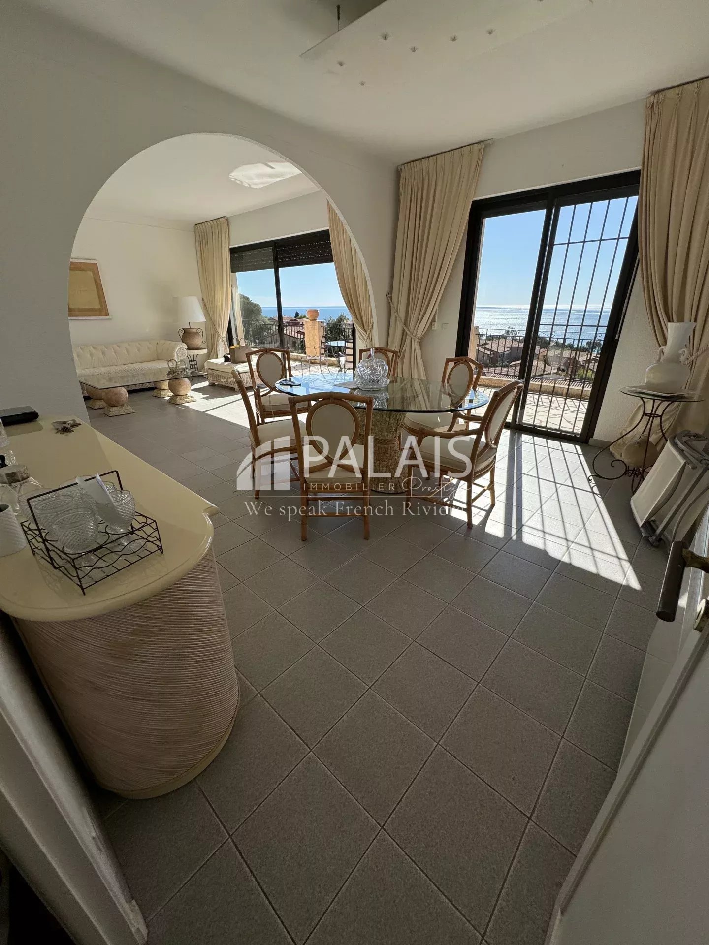 Depuis le hall d'entrée, nous entrons immédiatement dans le salon et la salle à manger avec une vue panoramique sur la mer et accès à une terrasse commune avec la chambre principale.