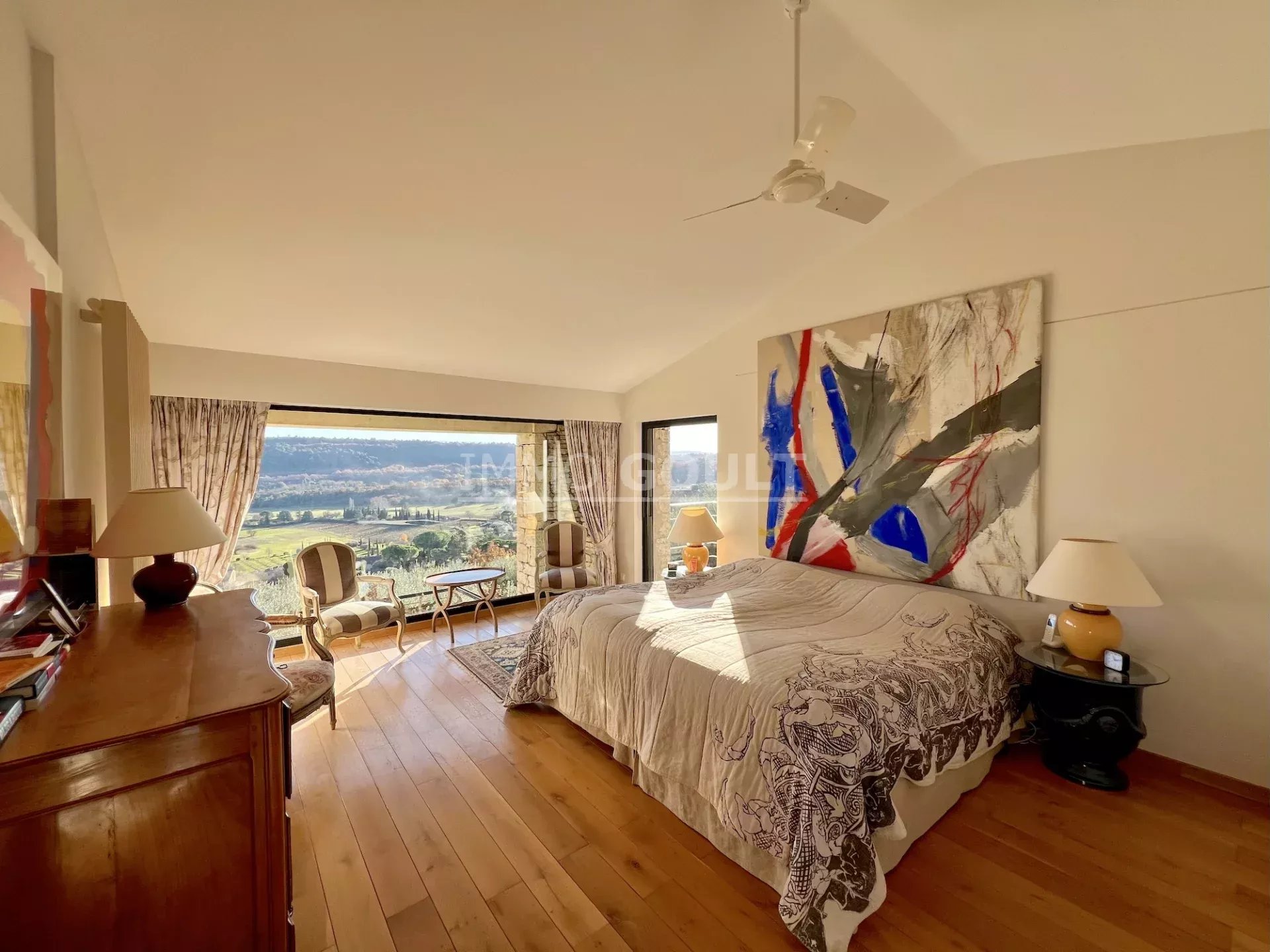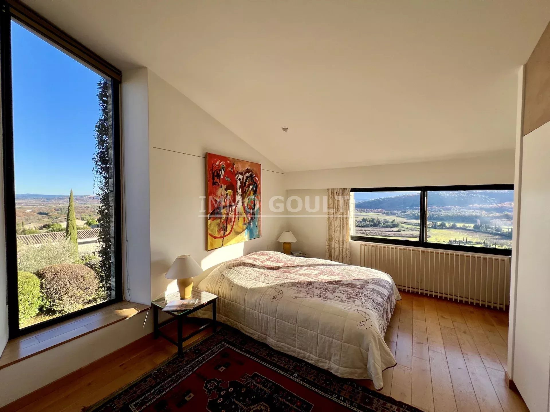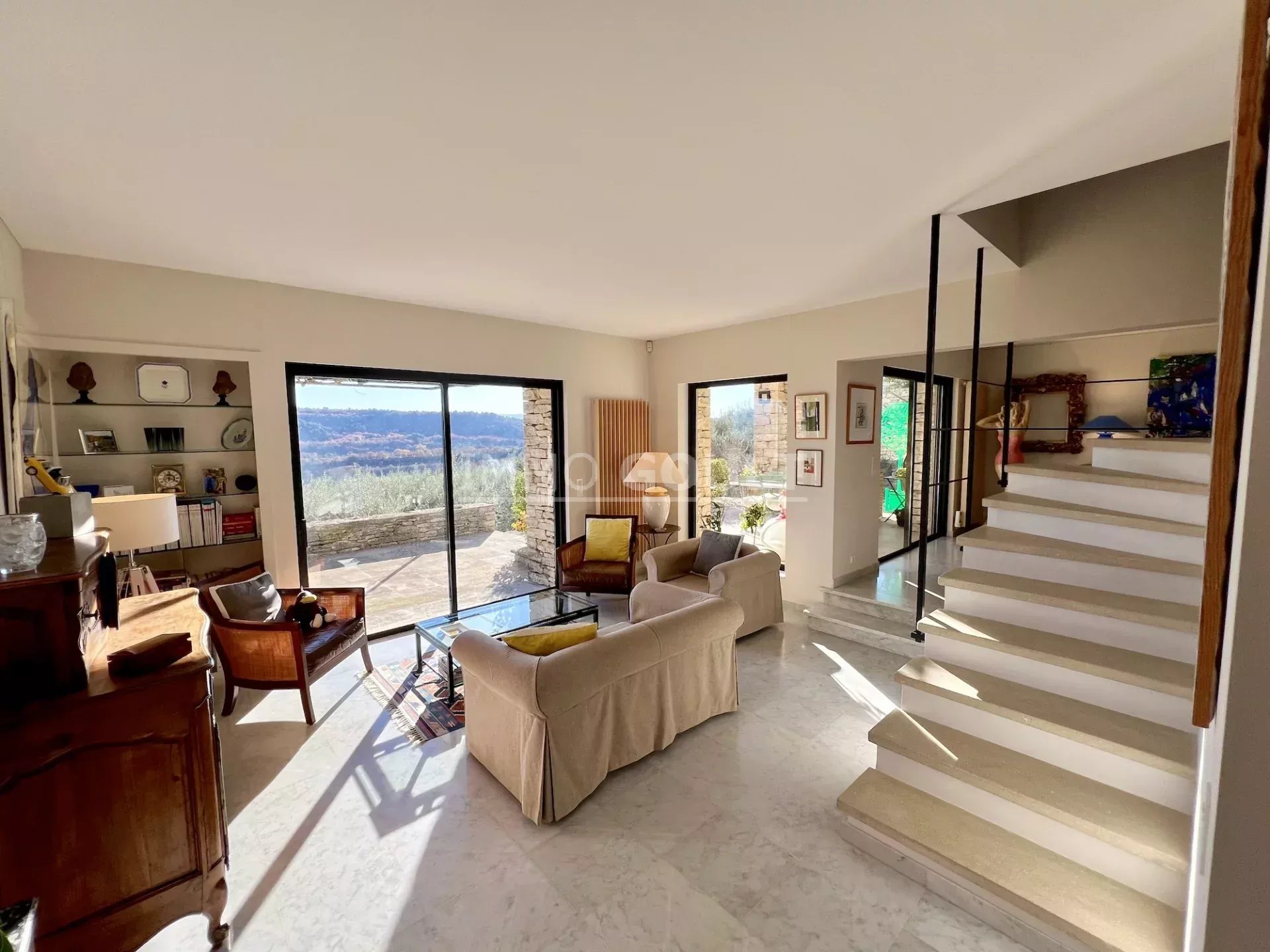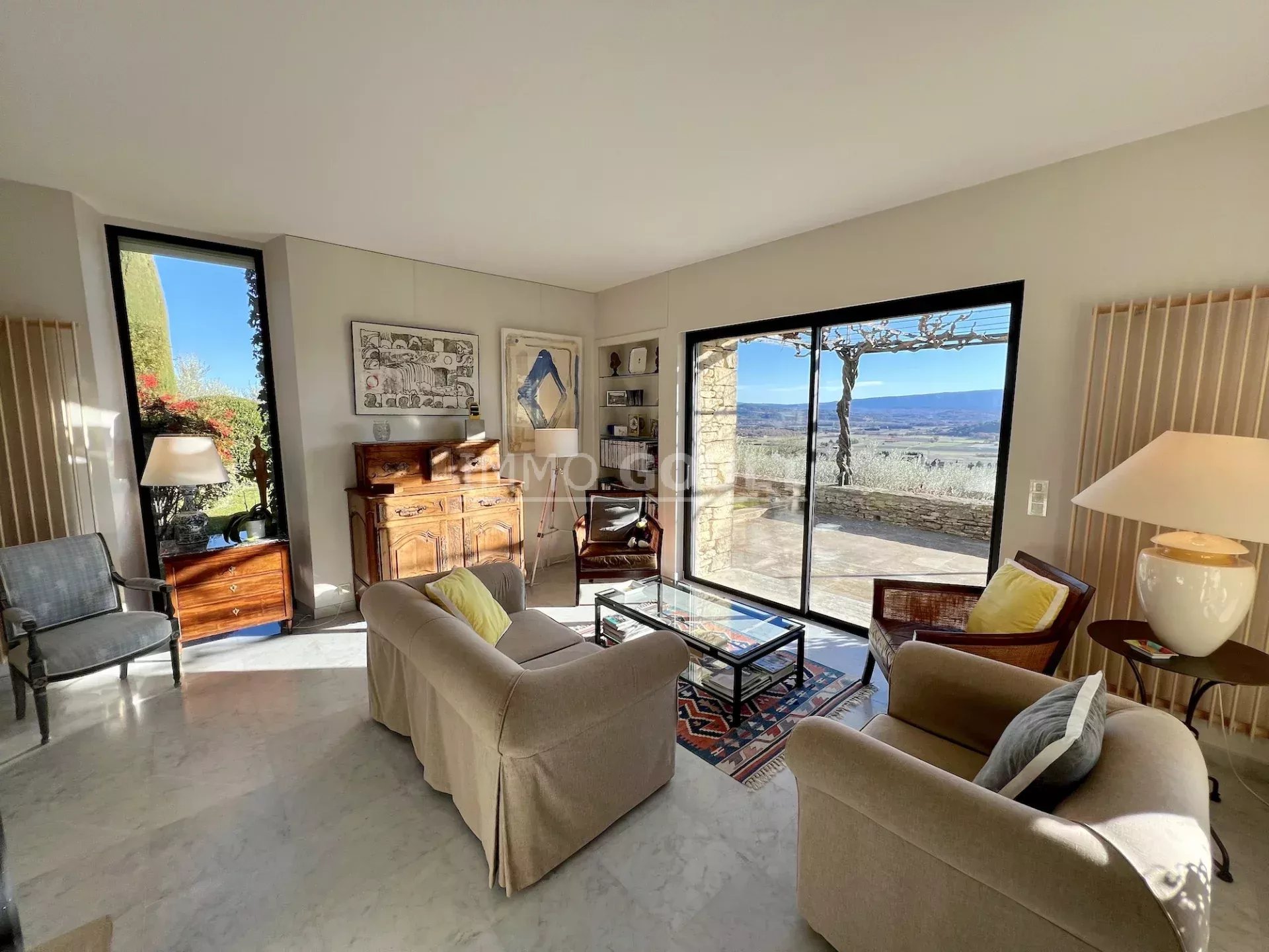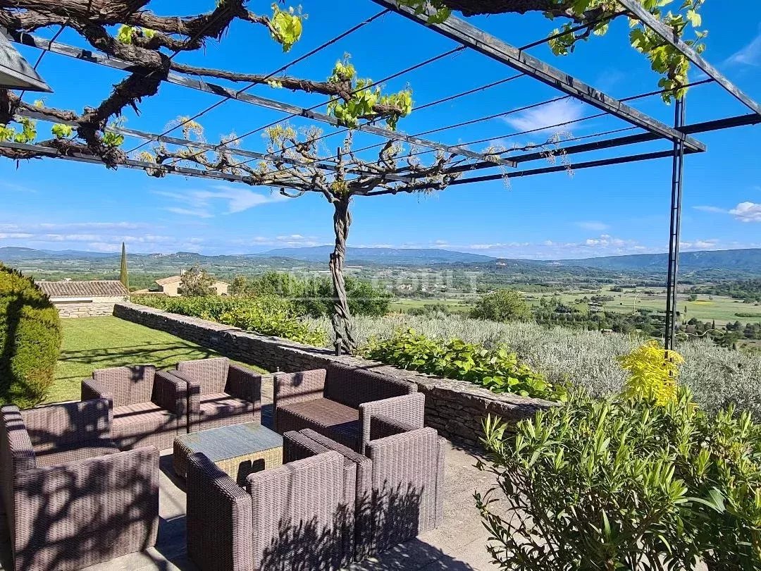 L'agence Immo Goult vous propose à la vente à l’orée du village de Gordes, bénéficiant de magnifiques vue sur le Luberon et ses villages, très belle propriété d’une surface habitable de 334m2 environ plus dépendances de 200m2 environ. Le parc de 5755m2 est planté d’essences provençales notamment d’une oliveraie (130 pieds), de fruitiers. De nombreuses terrasses, une piscine miroir de 12m x 6m avec son pool-house parfaitement équipée (cuisine, cheminée) agrémentent la propriété. Particulièrement lumineuse, de style contemporain, c’est une propriété très confortable aux prestations raffinées.