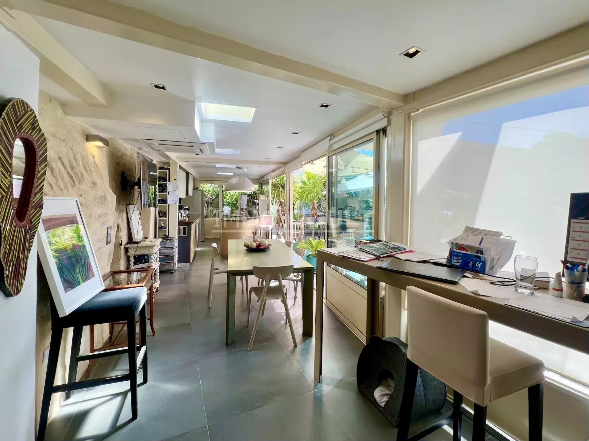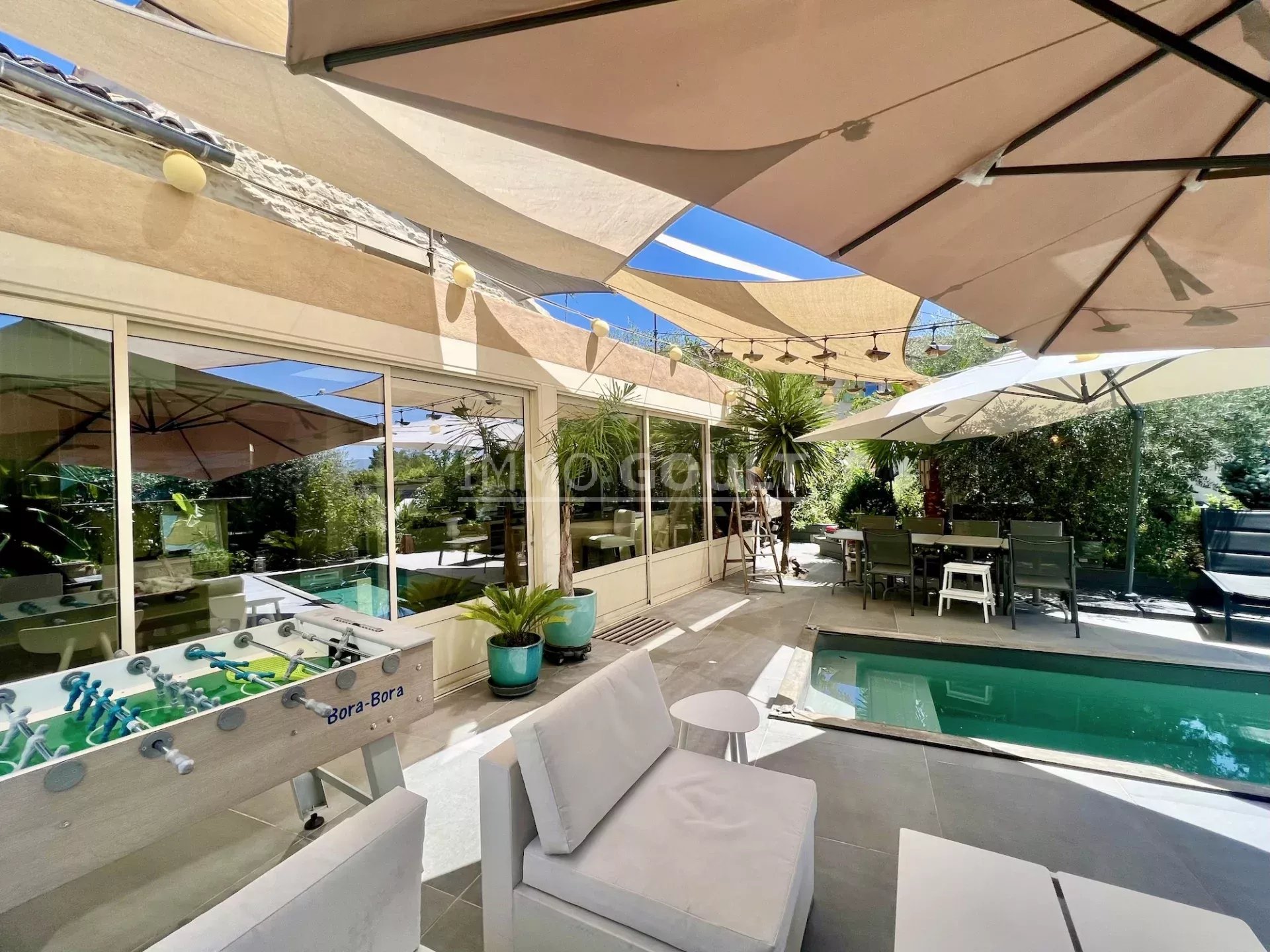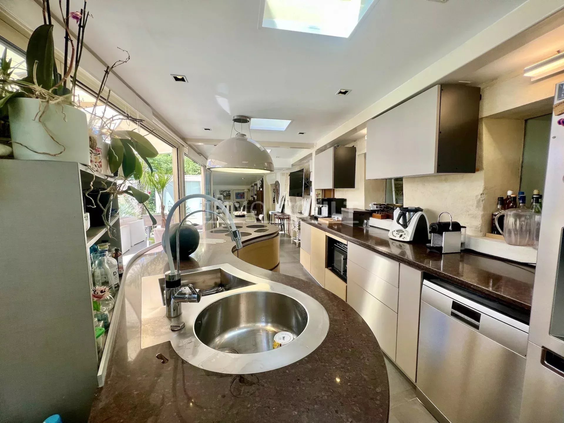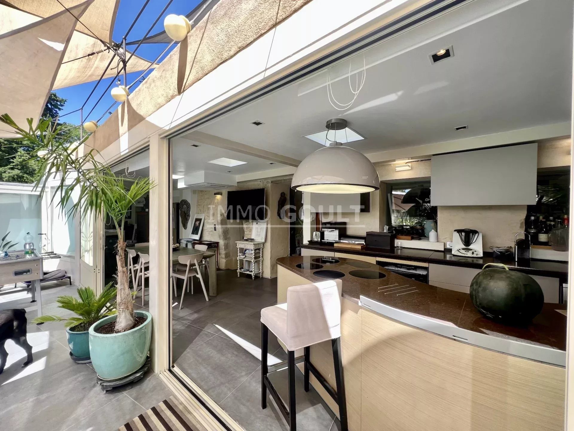 C’est une maison très confortable avec des prestations de qualité, sa restauration présente un doux mélange d’authenticité et de contemporain. La pièce maitresse étant le séjour qui donne cette sensation de vivre à l’extérieur en toute saison, au milieu de cet oasis de fraîcheur du fait de la luxuriance de la végétation. Le salon quant à lui présente un sentiment de « cocooning ». Maison définitivement pas classique mais qui dégage un sentiment de bien être.