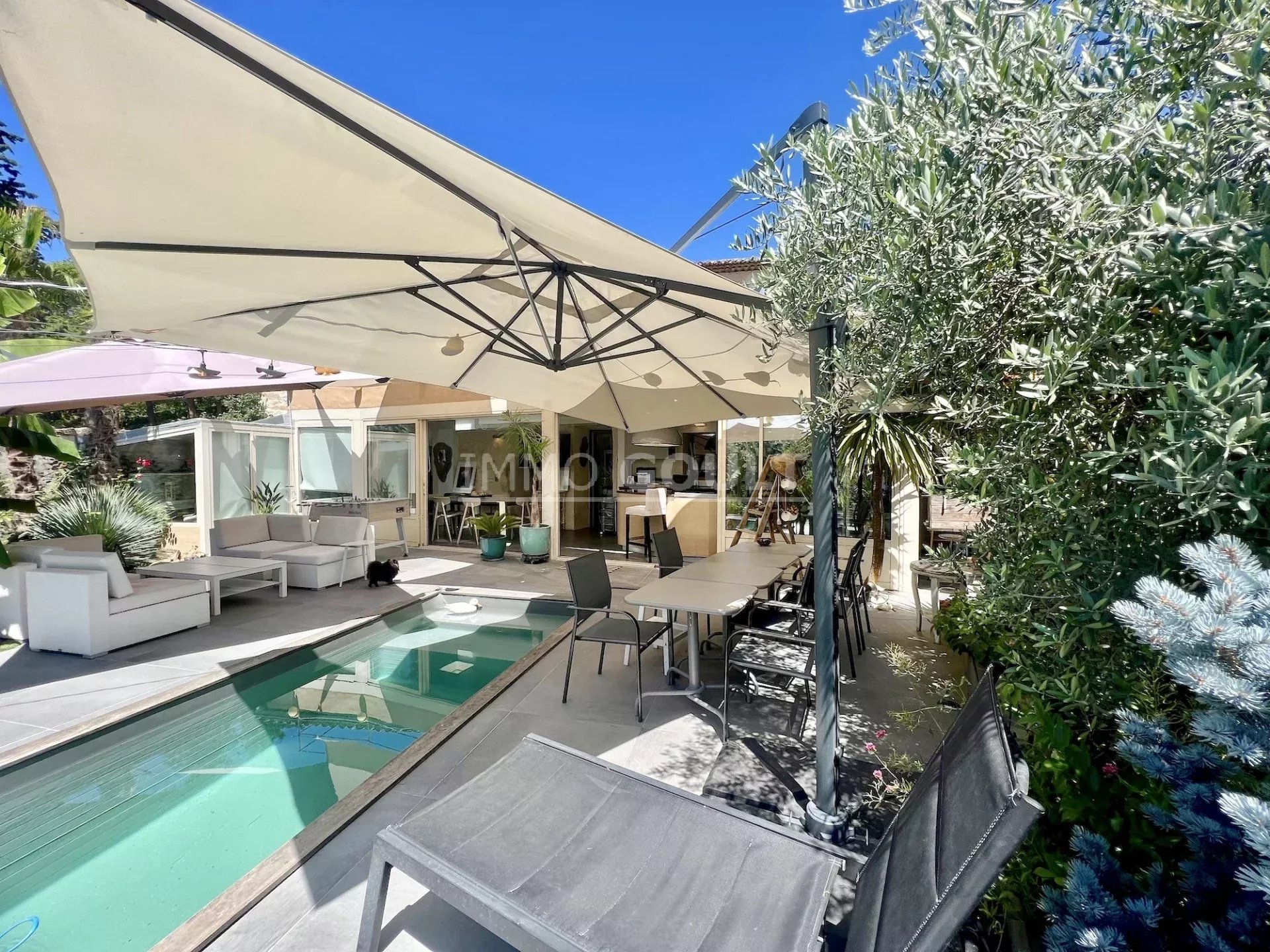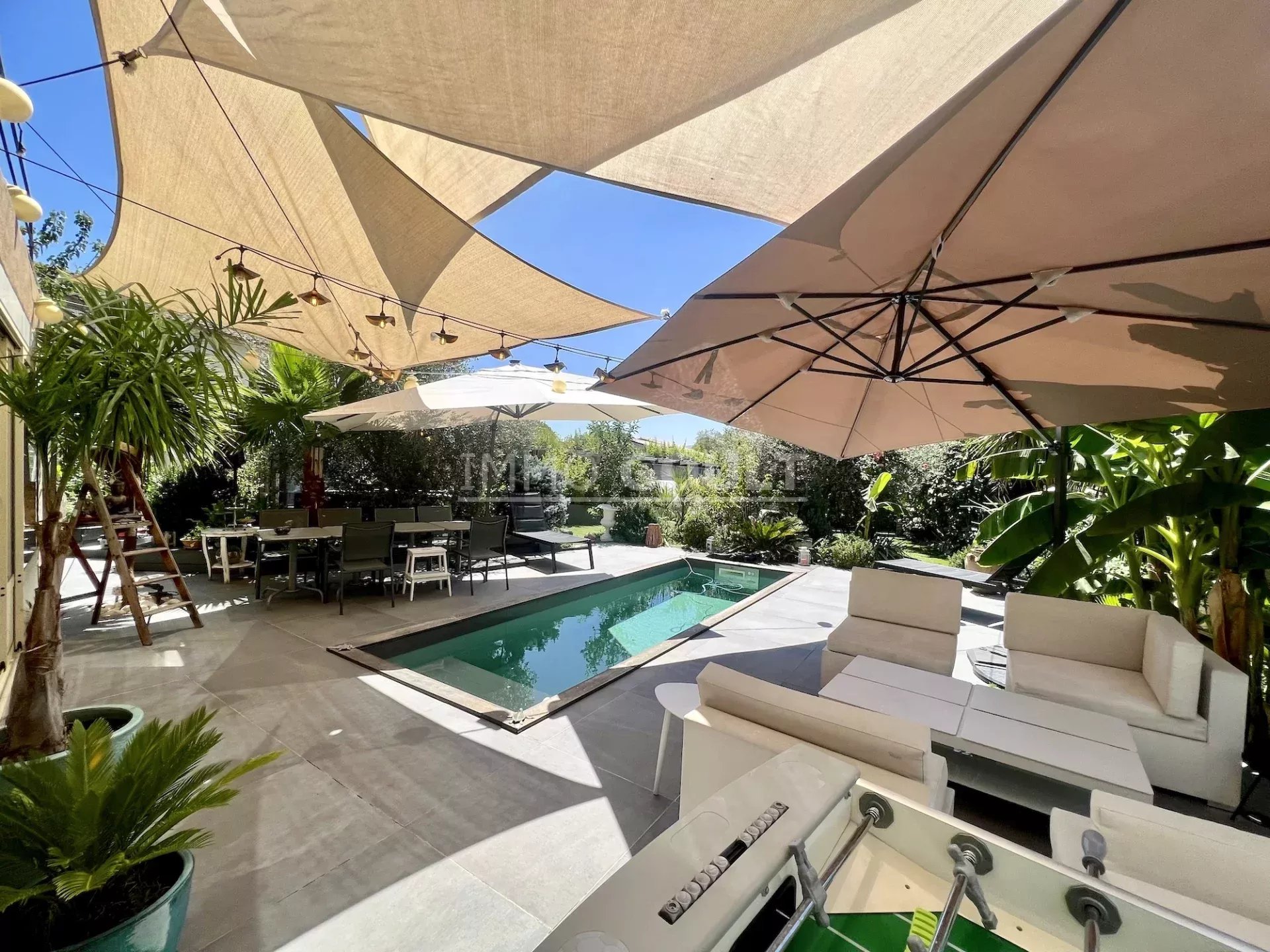 Le terrain clos de 400m2 environ est magnifiquement paysager. Plusieurs terrasses et un bassin avec nage à contre courant agrémentent la maison.