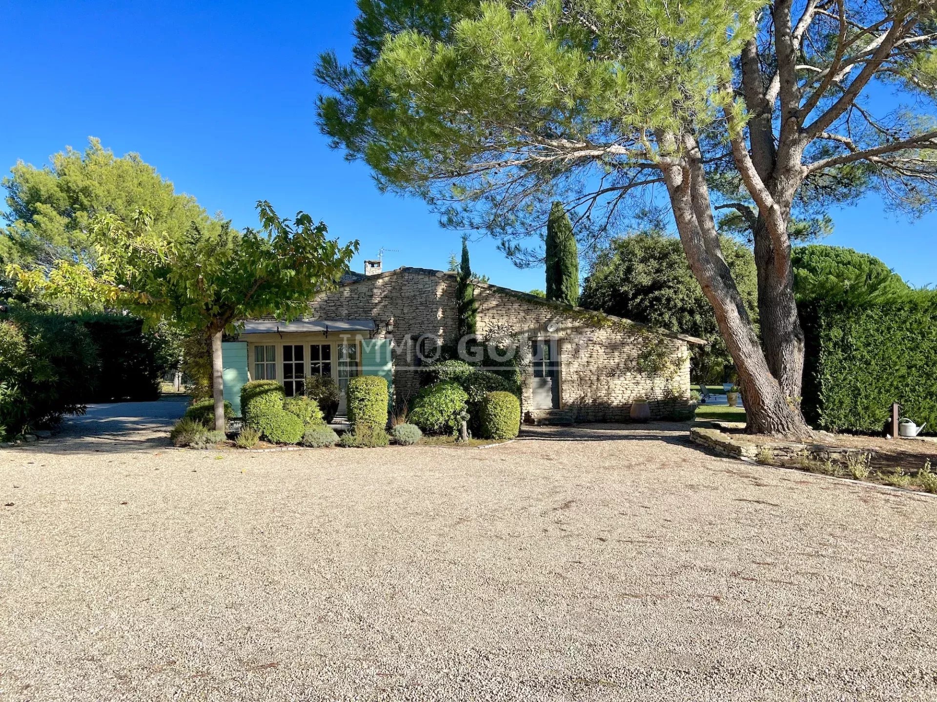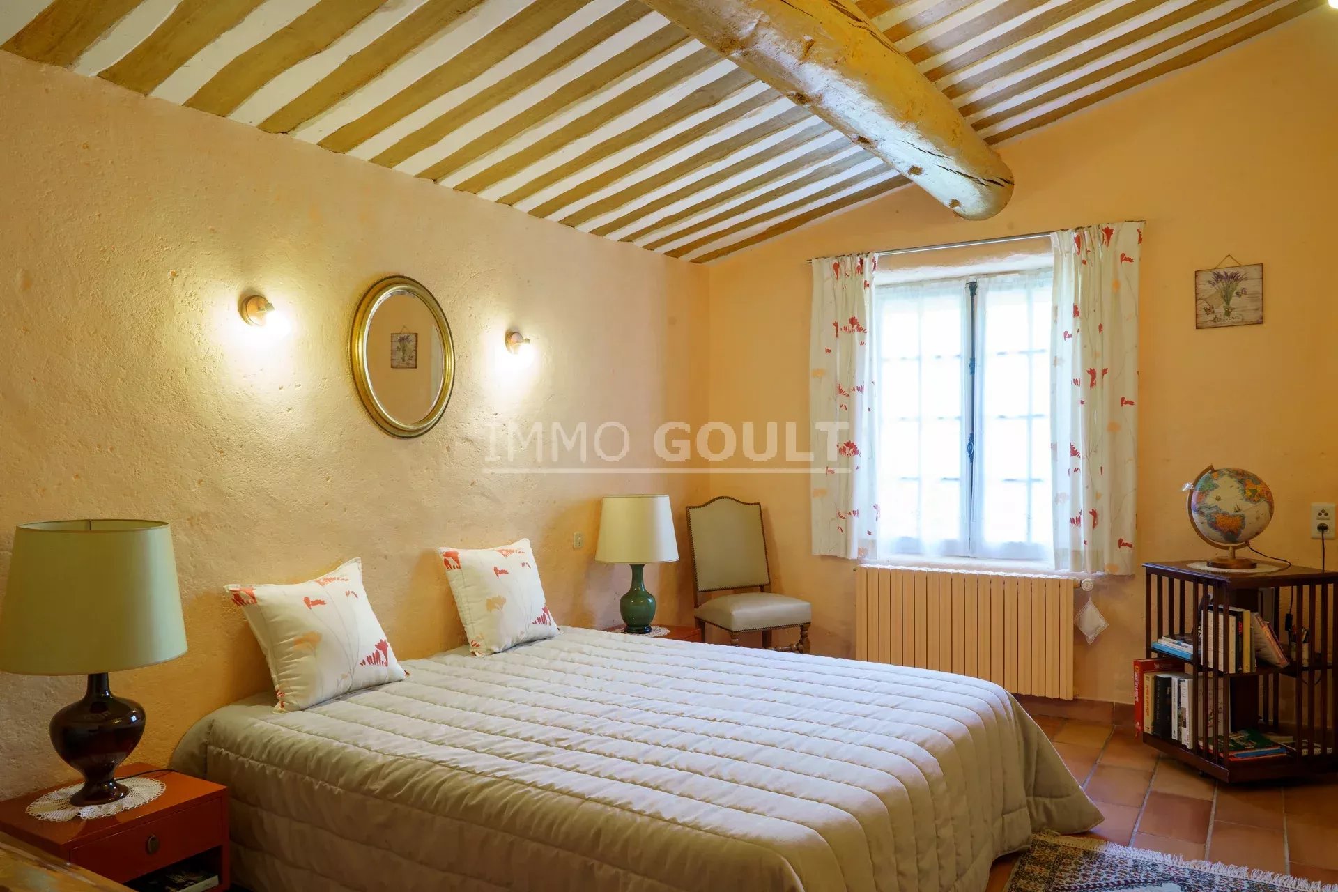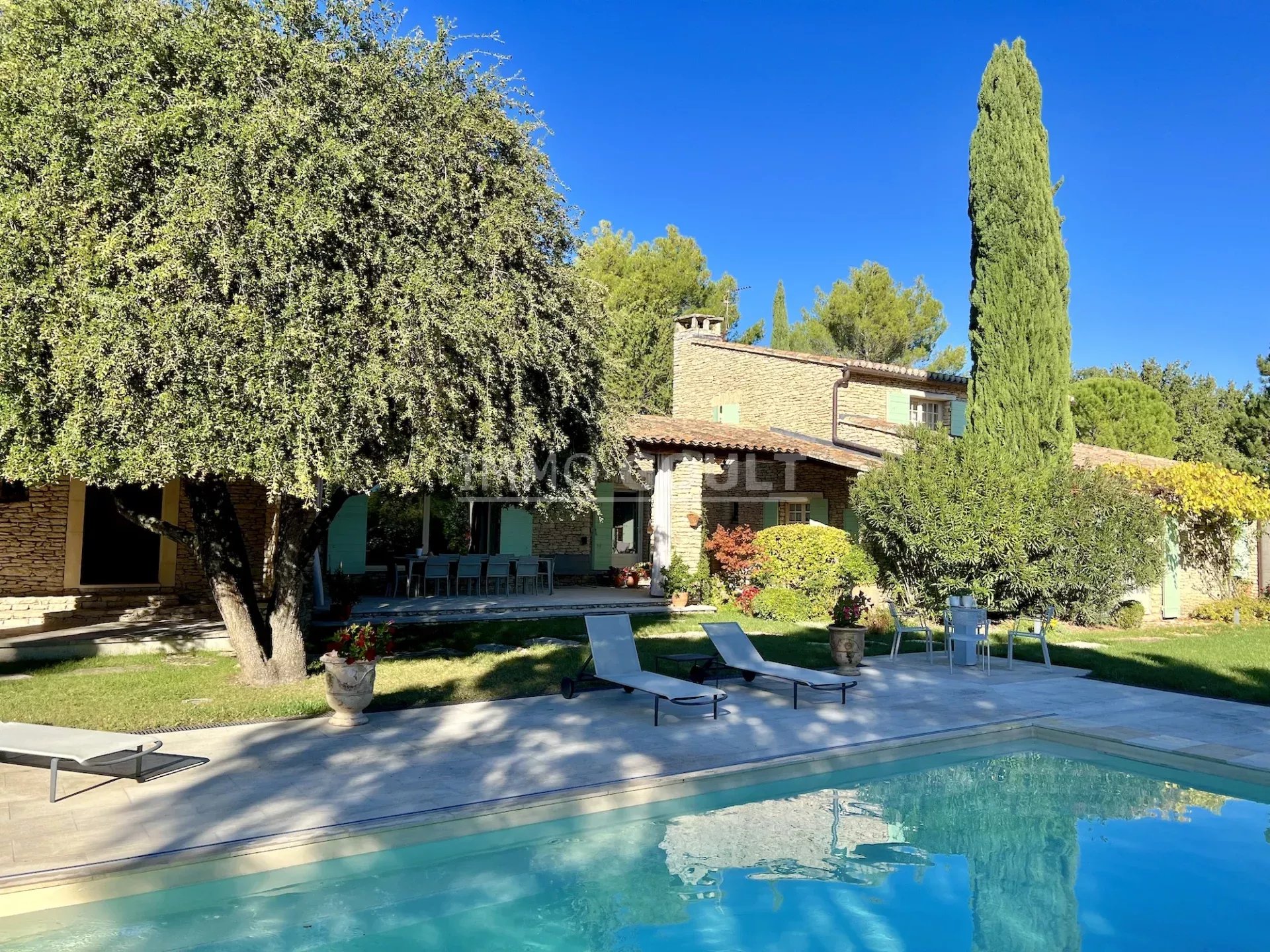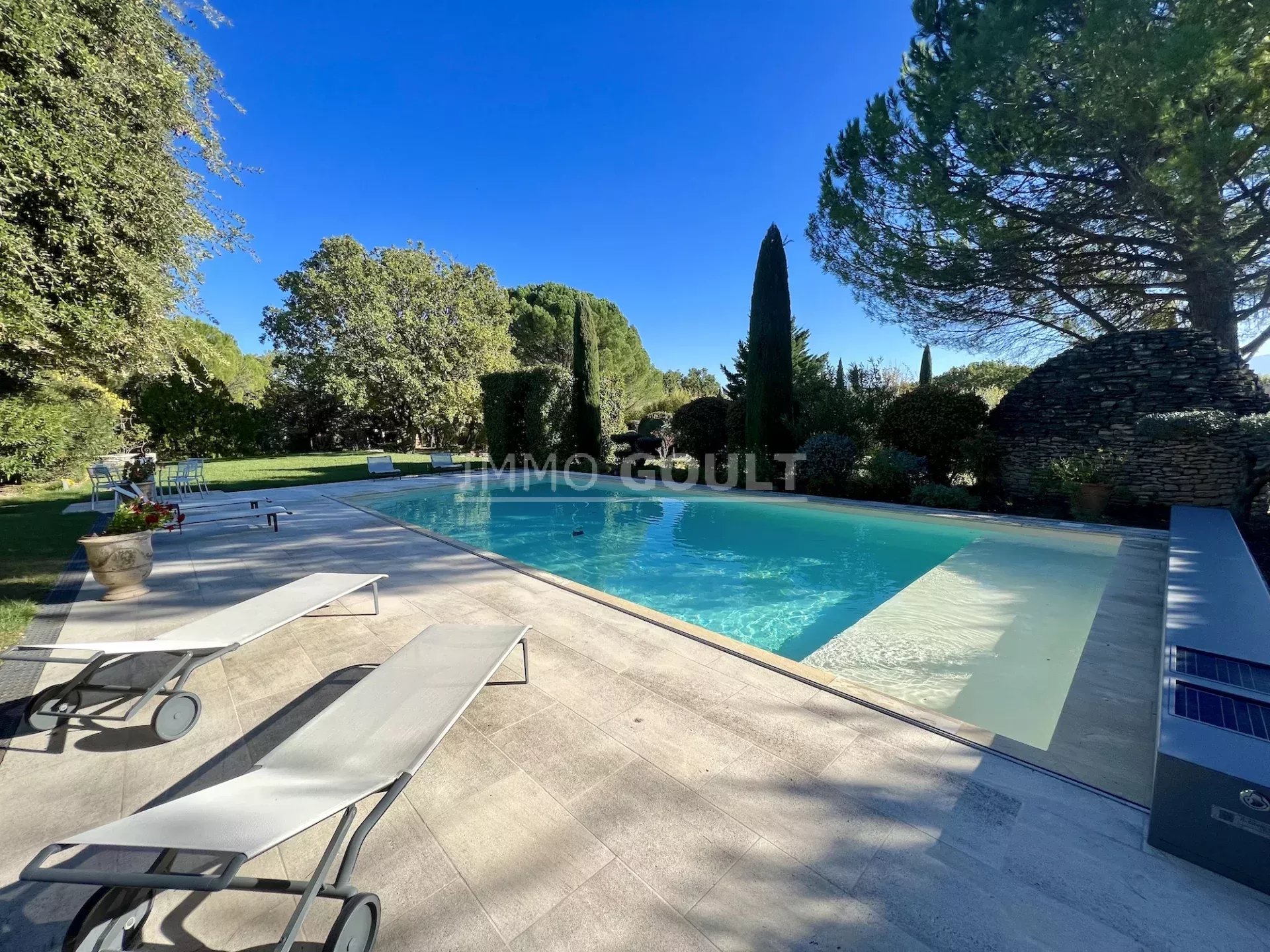 Immo Goult agence immobilière dans le parc du Luberon vous propose à la vente : Dans la campagne de Gordes, village classé, bénéficiant d'une vue sur le Luberon, très belle propriété composée d’une maison de 294m2 environ plus dépendance de 70m2 environ. Le parc clos de 7770m2 est paysager autour de la maison et planté d’une oliveraie (30 pieds), de cyprès de Florence et de fruitiers. Plusieurs terrasses dont une vaste couverte avec cheminée BBQ et une piscine sécurisée par un rideau agrémentent la maison. Au calme sans être isolée, c’est une propriété parfaitement entretenue, confortable, aux prestations techniques de qualité et qui offre de beaux volumes de réception. Idéale tant en résidence principale que secondaire.