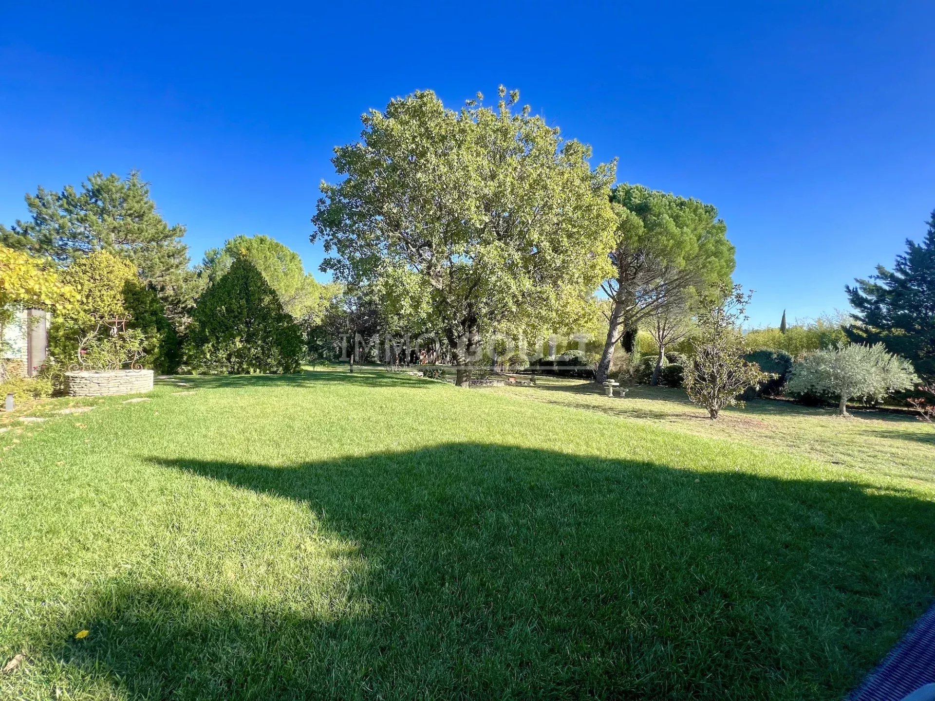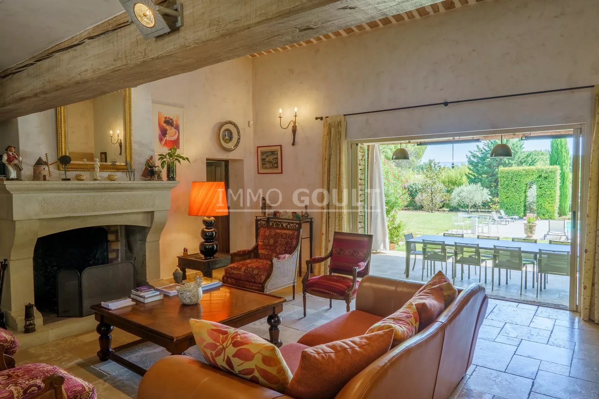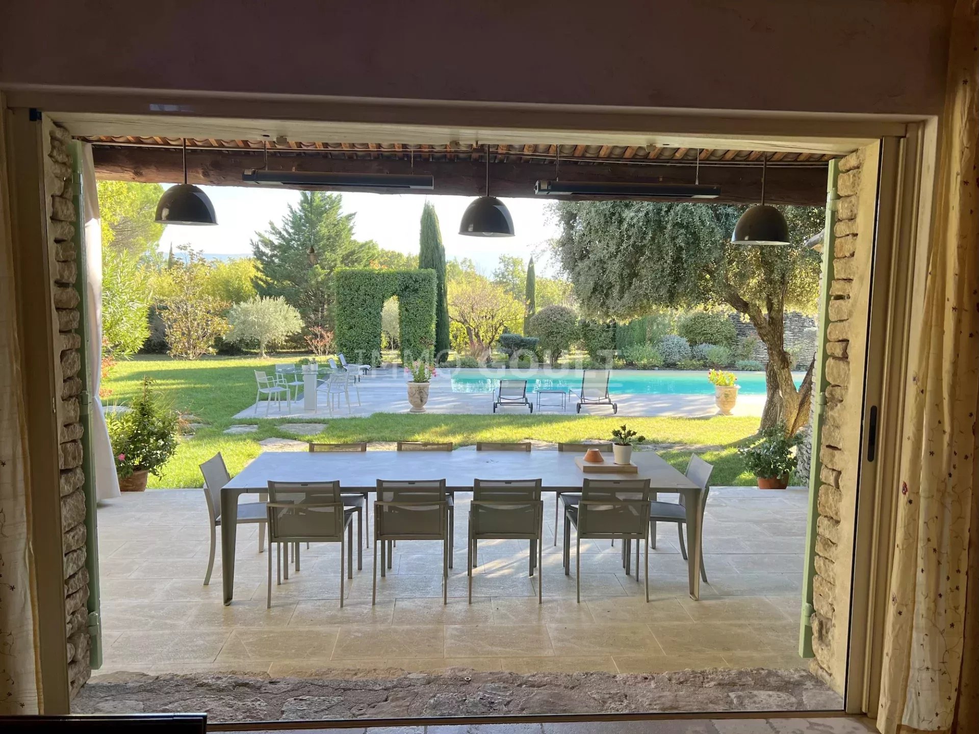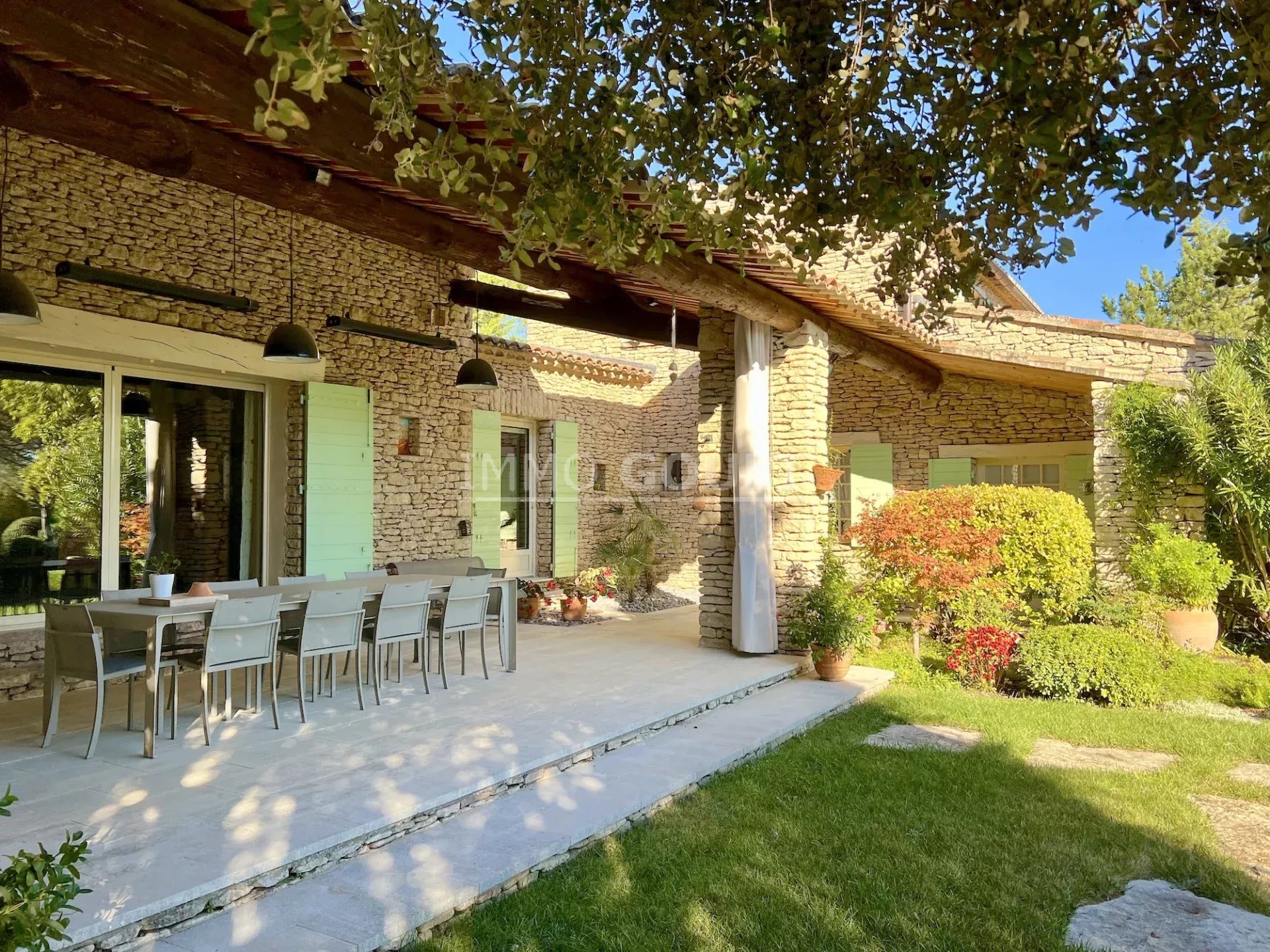 Immo Goult agence immobilière dans le parc du Luberon vous propose à la vente : Dans la campagne de Gordes, village classé, bénéficiant d'une vue sur le Luberon, très belle propriété composée d’une maison de 294m2 environ plus dépendance de 70m2 environ. Le parc clos de 7770m2 est paysager autour de la maison et planté d’une oliveraie (30 pieds), de cyprès de Florence et de fruitiers. Plusieurs terrasses dont une vaste couverte avec cheminée BBQ et une piscine sécurisée par un rideau agrémentent la maison. Au calme sans être isolée, c’est une propriété parfaitement entretenue, confortable, aux prestations techniques de qualité et qui offre de beaux volumes de réception. Idéale tant en résidence principale que secondaire.