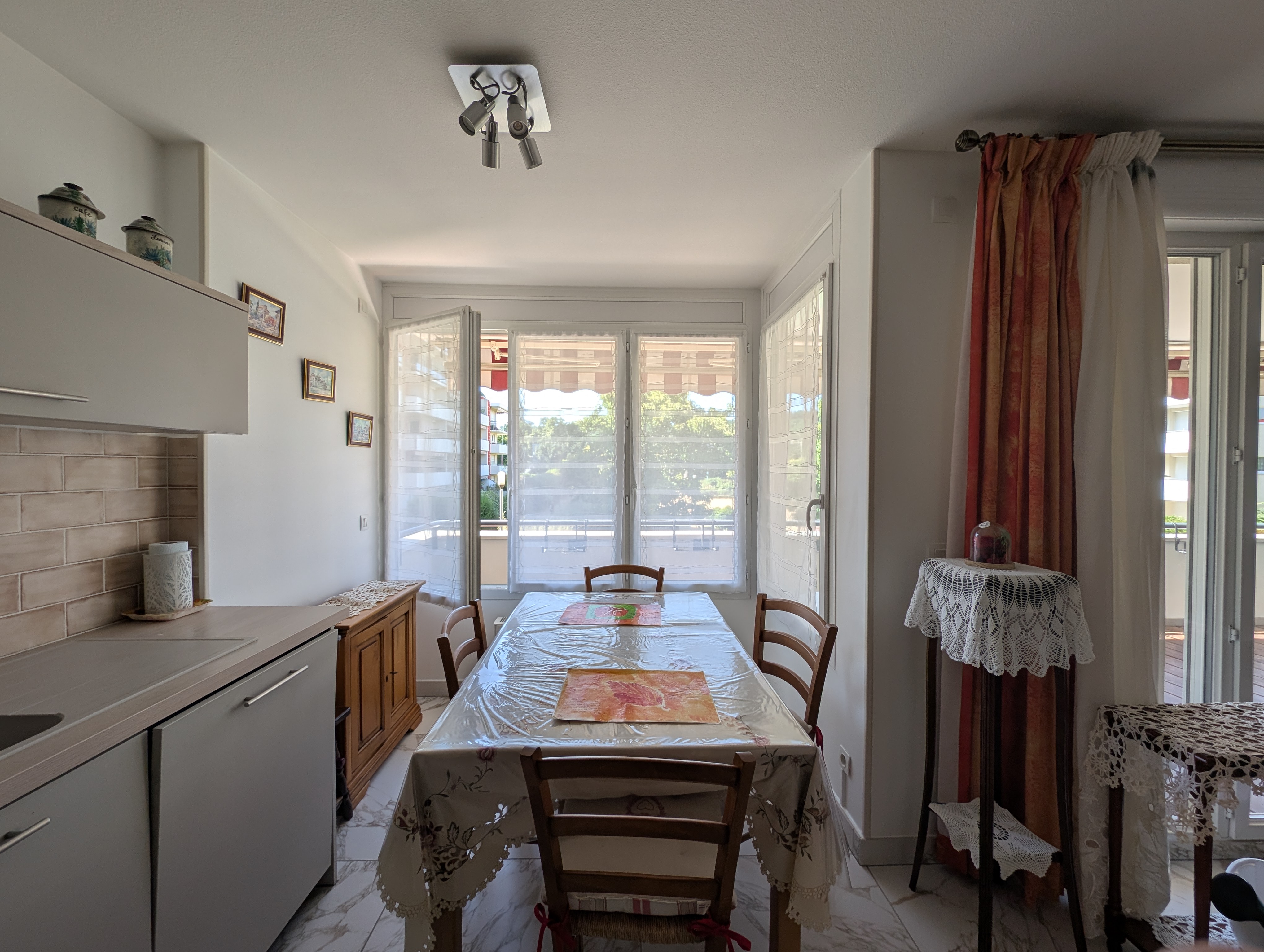 Cuisine semi-ouverte sur le salon de 15m2, salon SAM de 19m2, terrasse de 16m2, 2 chambres (20 et 10m2), salle d'eau de 4m2 et WC séparés.