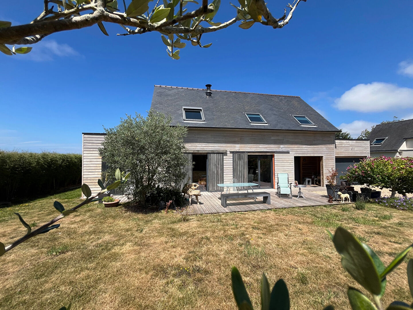 COMPROMIS EN COURS: Contemporaine bois de 2011 .Lumière, confort et calme à deux pas de la mer. Située dans un quartier paisible, à proximité immédiate des commerces et à moins de 10 minutes des plages, cette maison contemporaine en ossature bois séduit par son charme chaleureux, sa luminosité et ses prestations soignées. Le rez-de-chaussée accueille une spacieuse pièce de vie d'environ 50 m², baignée de lumière, avec cuisine équipée ouverte et poêle pour des soirées cocooning