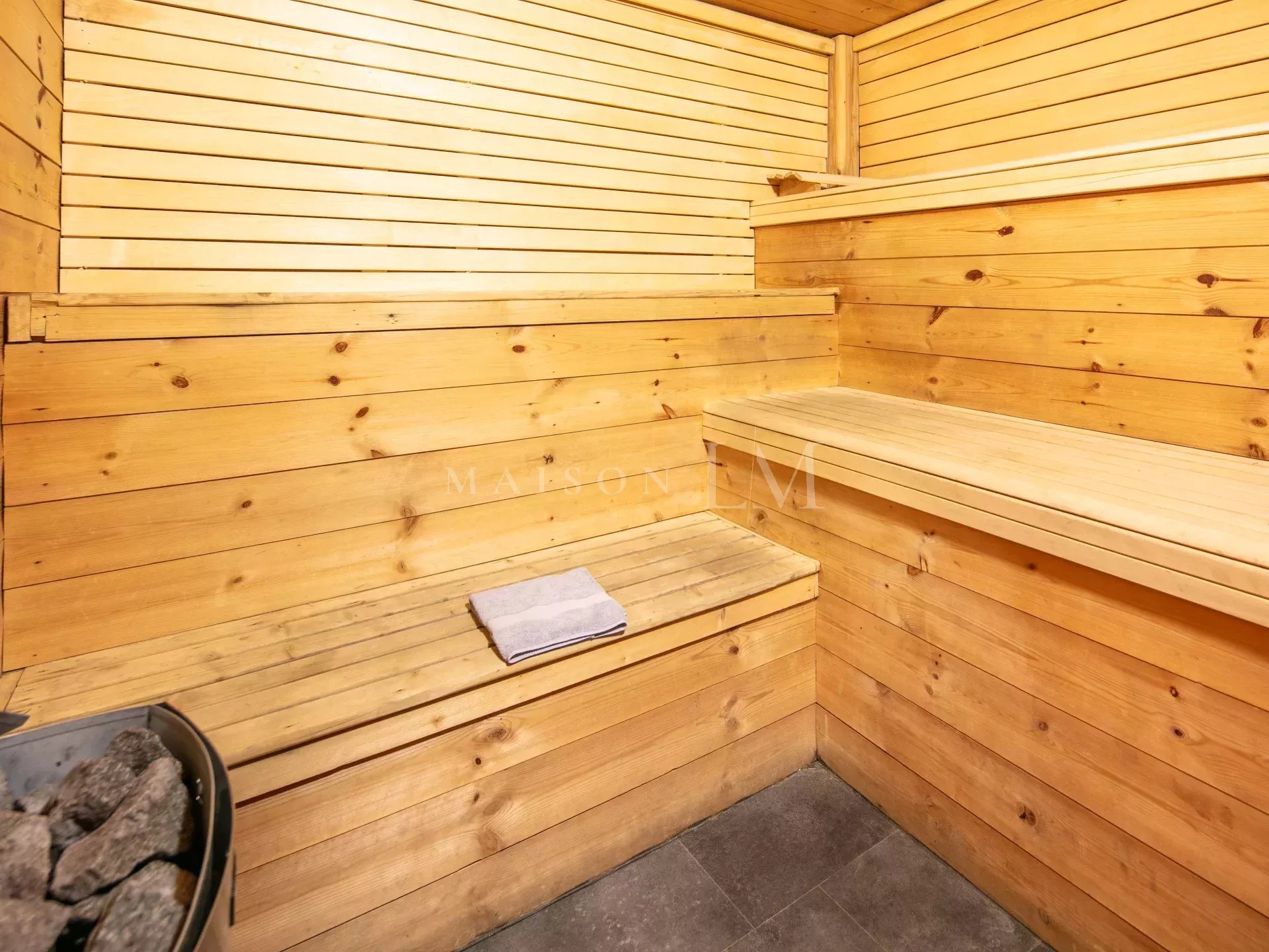 - une entrée, cinq chambres, un salon/salle à manger, une cuisine américaine, cinq salles de bains, un sauna, une piscine, une terrasse ainsi qu'un local à skis.