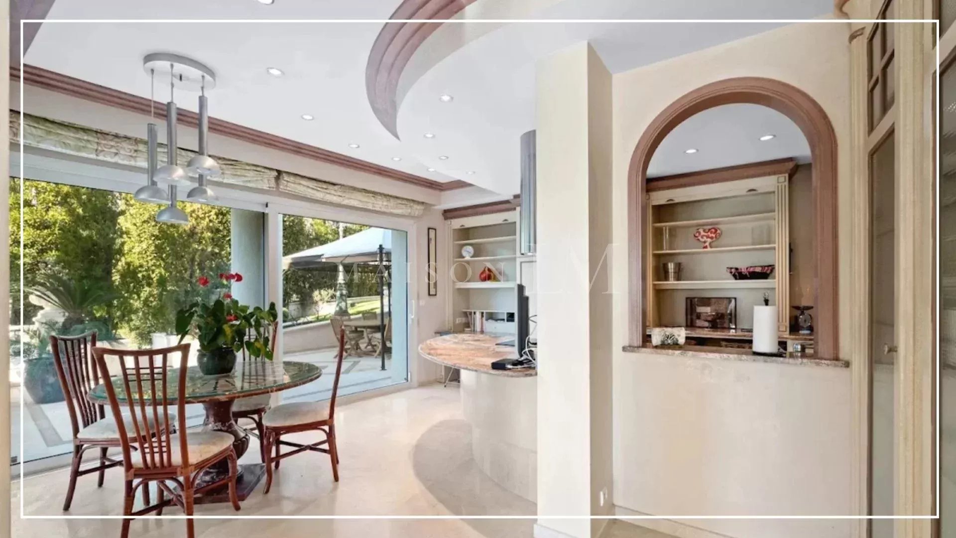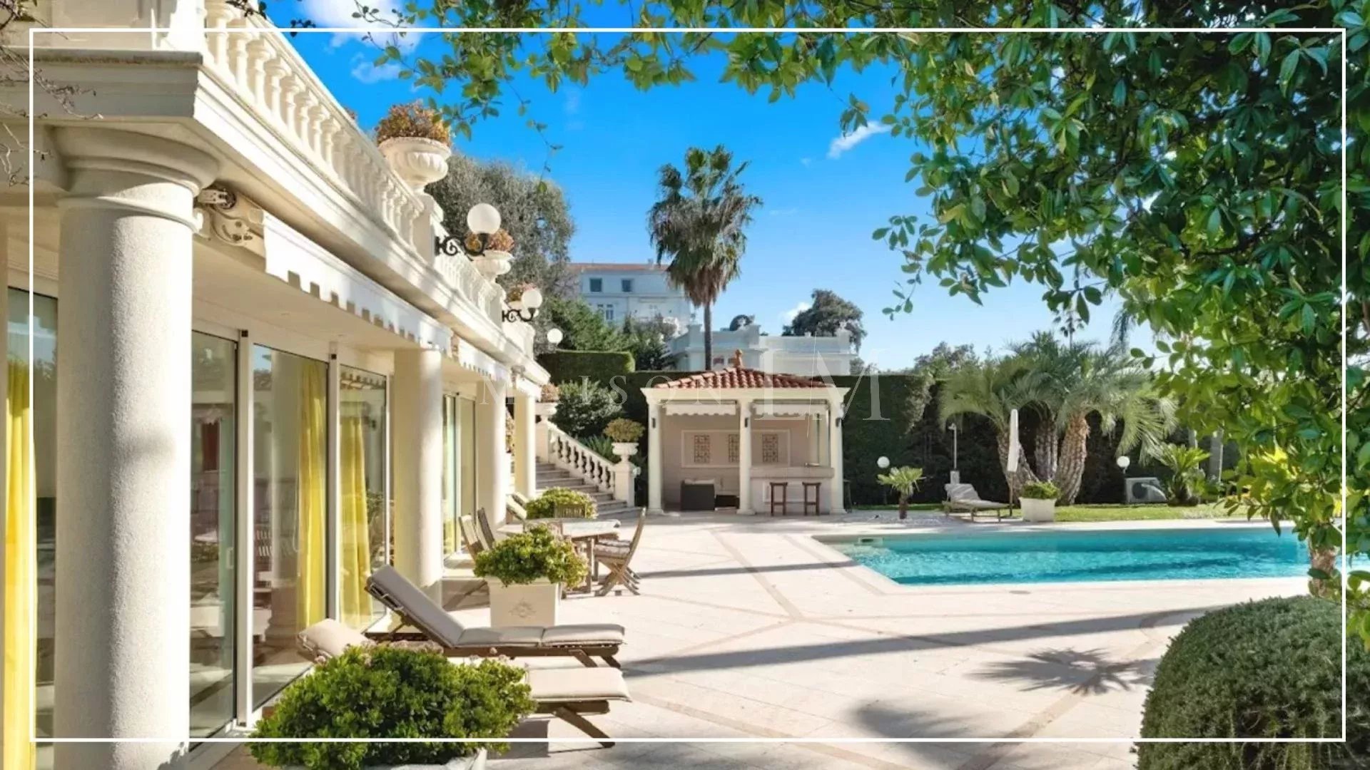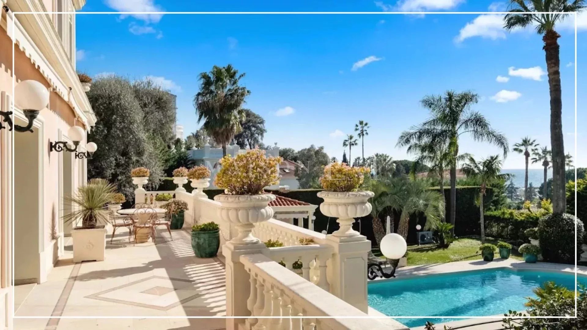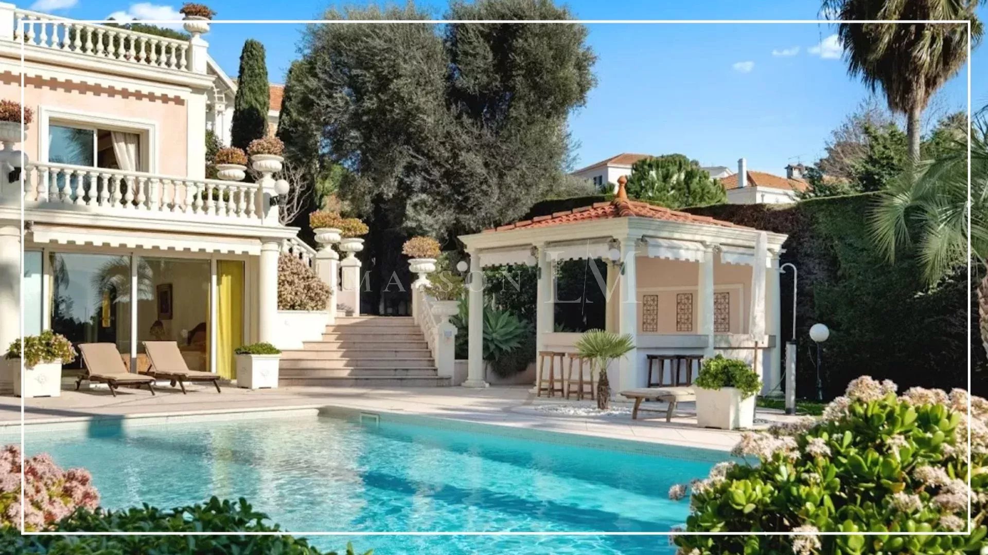 L'extérieur de la propriété dispose de vastes terrasses avec des espaces salons, une piscine chauffée et un bar d'été offrant une vue magnifique sur la baie d'Antibes. Parfait pour accueillir famille et amis dans un cadre convivial et spacieux.