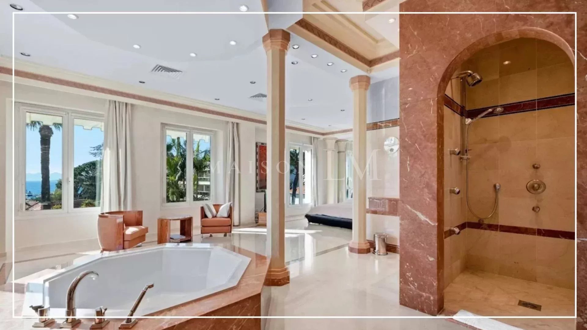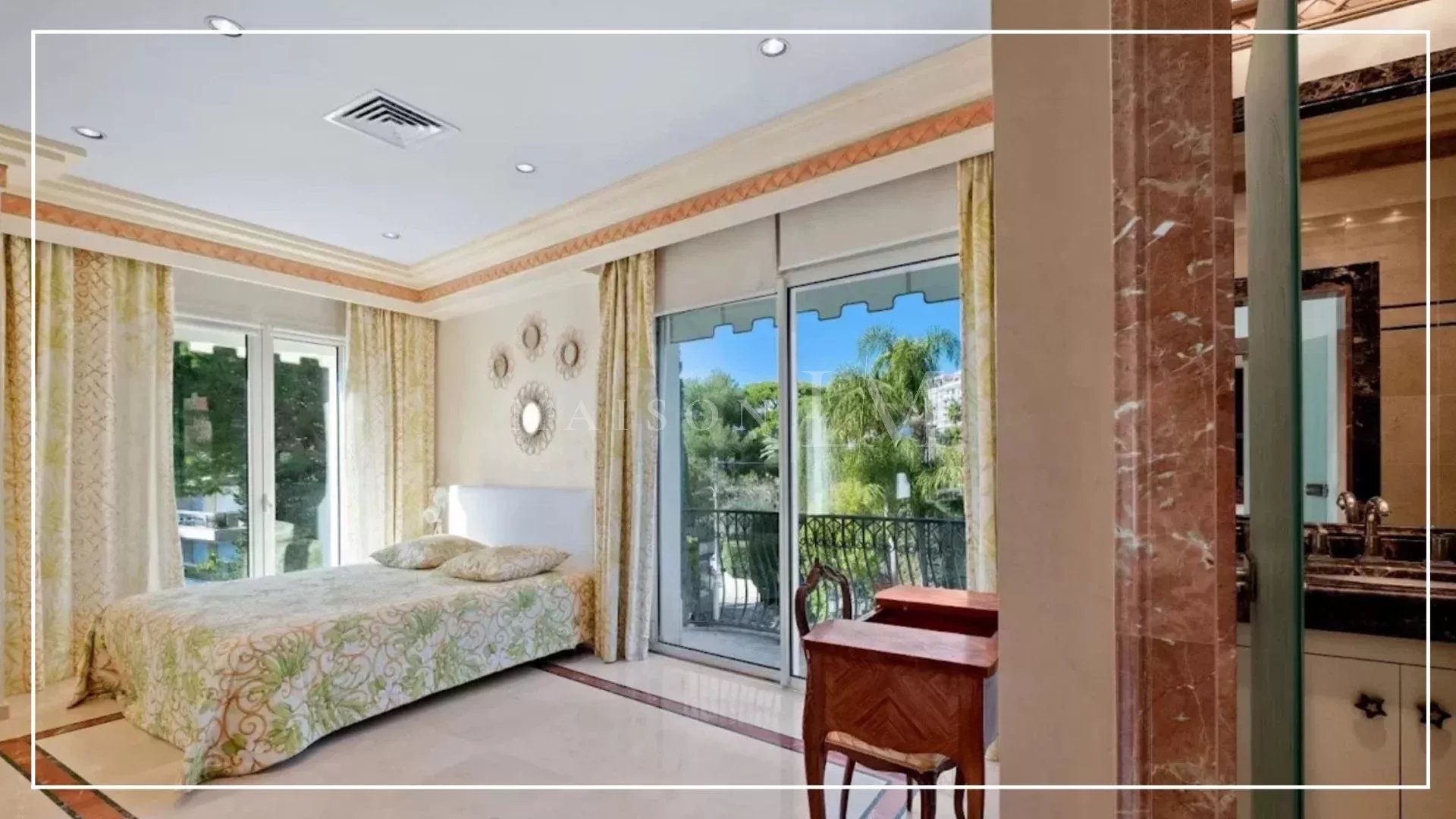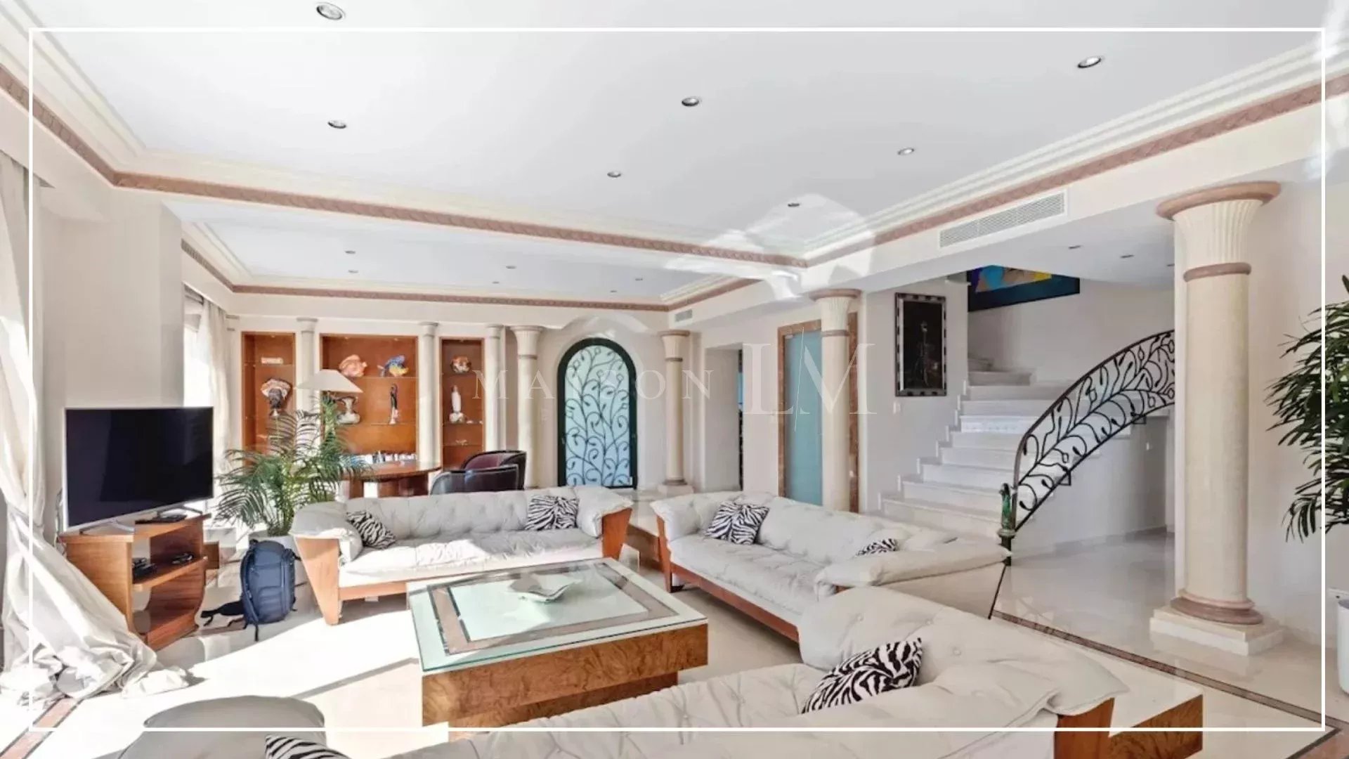 Dans un secteur prisé, à proximité des plages de sable fin, du Port Gallice et des célèbres restaurants de Juan-les-Pins, se trouve cette charmante villa Belle Époque de 363 m², comprenant 5 chambres et 5 salles de bains. Située dans une rue résidentielle paisible sur un terrain plat et paysagé de 2408 m², la propriété offre deux entrées distinctes : une entrée privative menant directement au bord de mer en quelques pas, et une entrée principale avec un majestueux escalier.