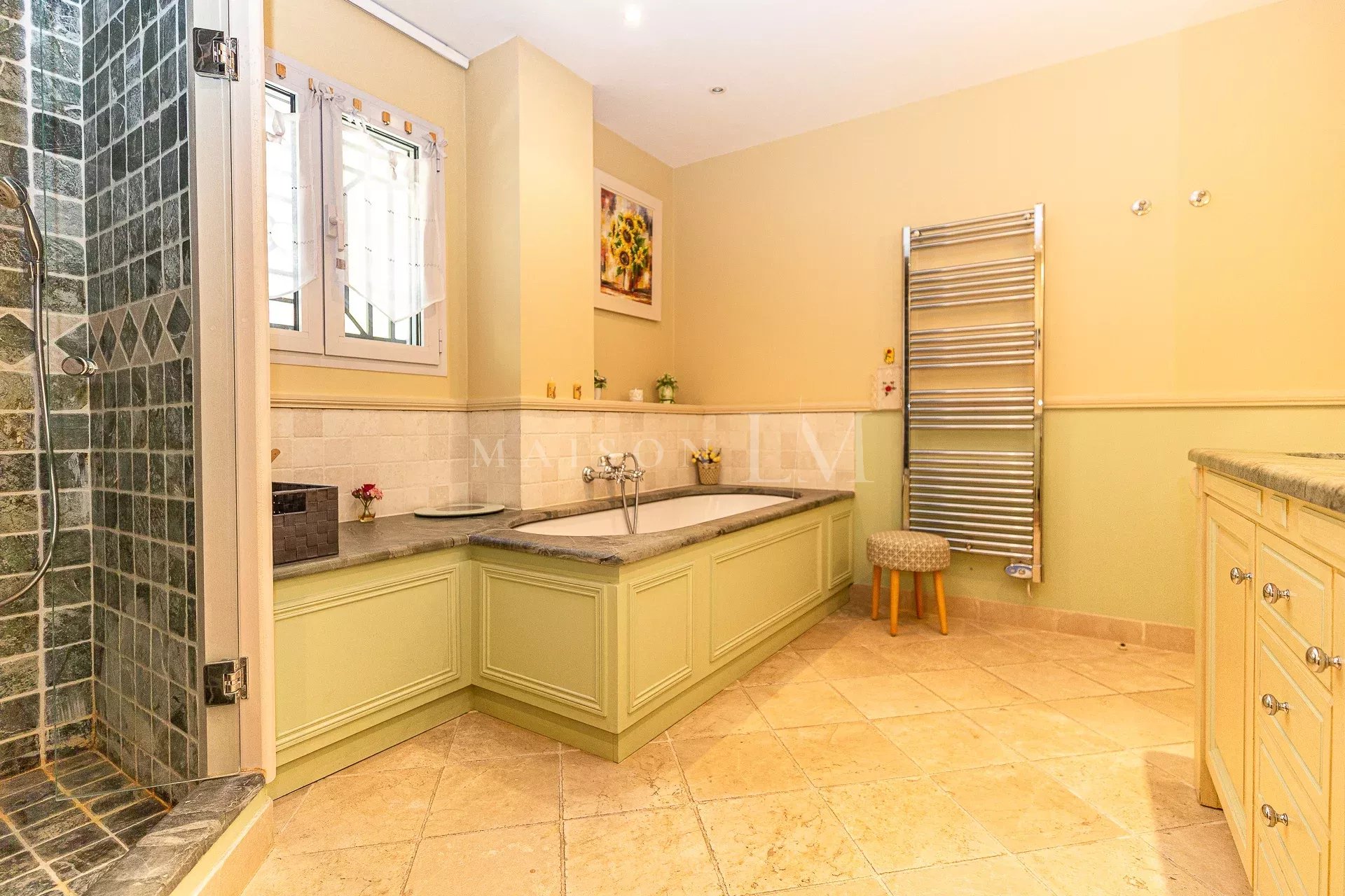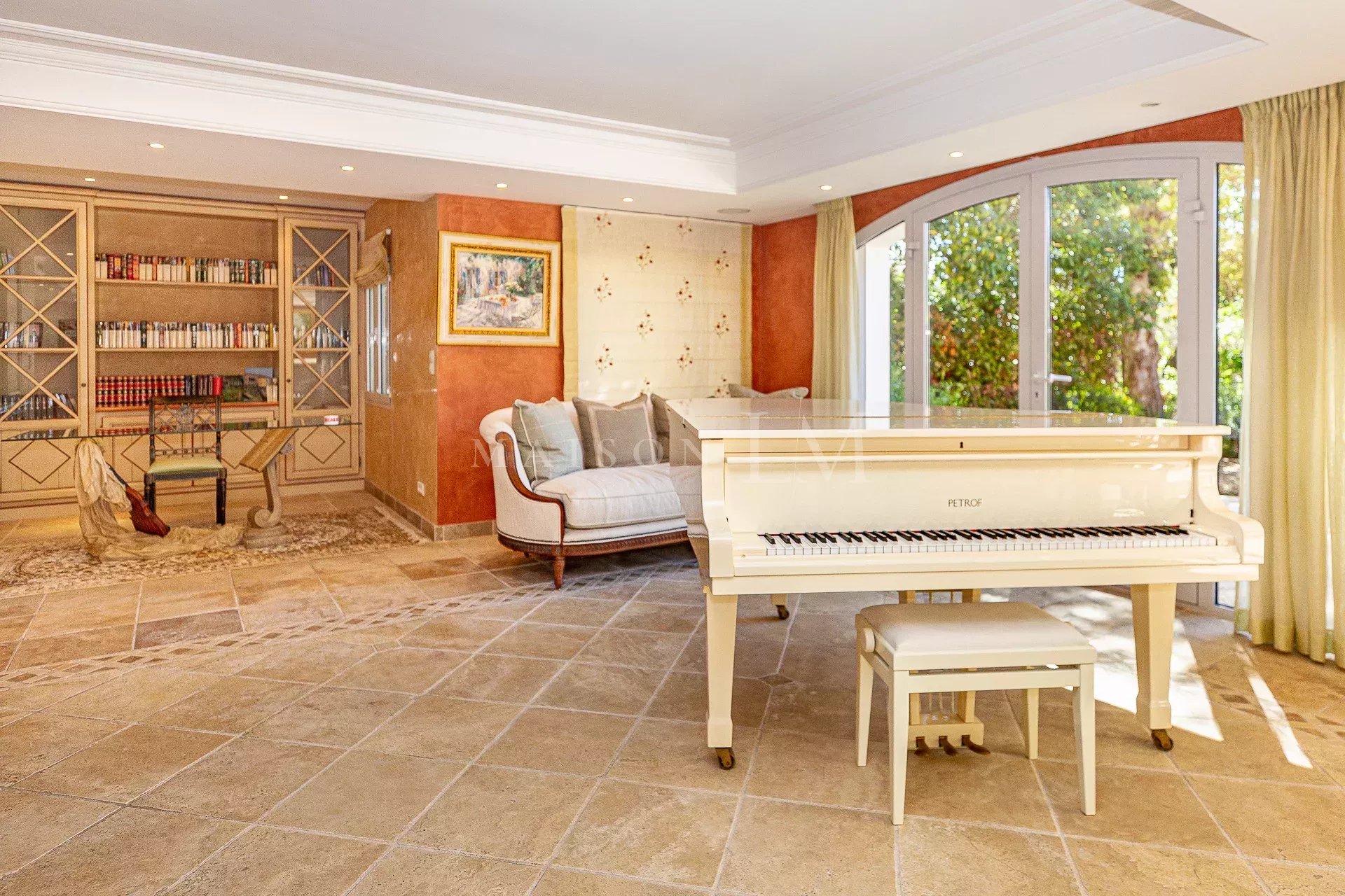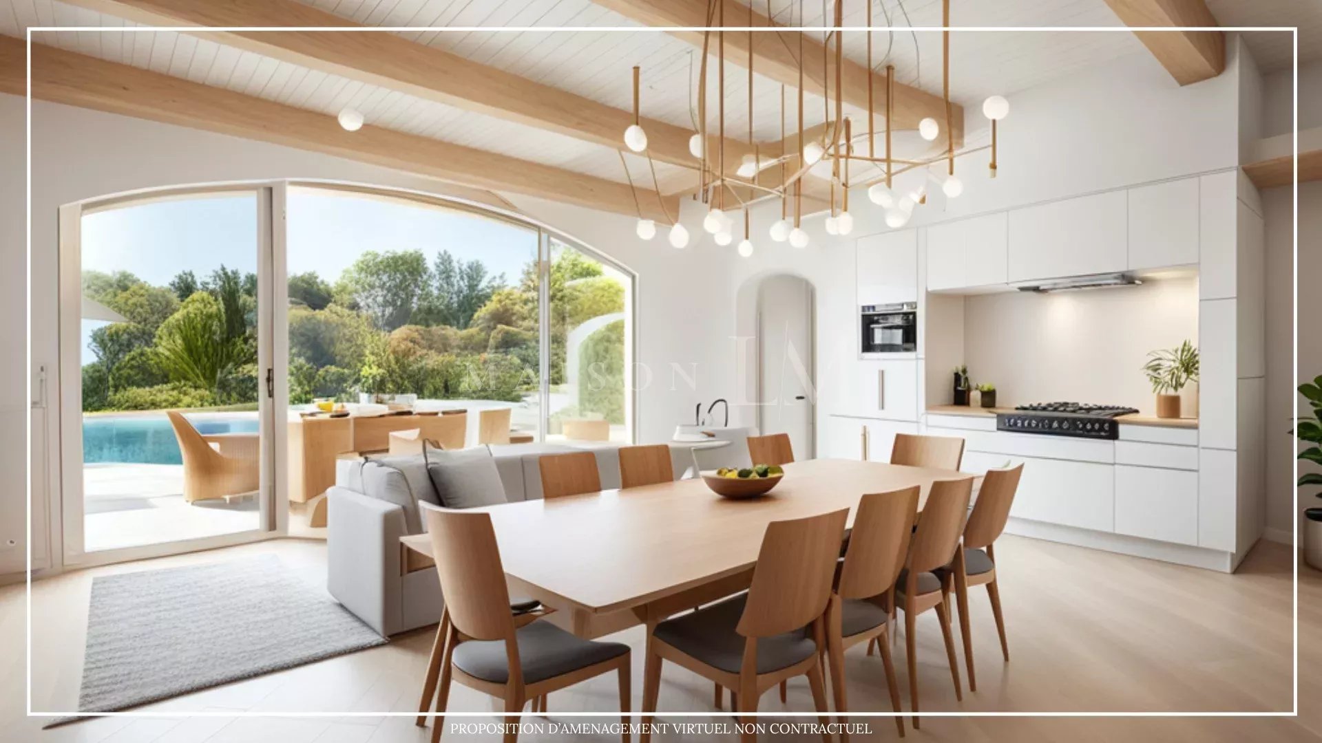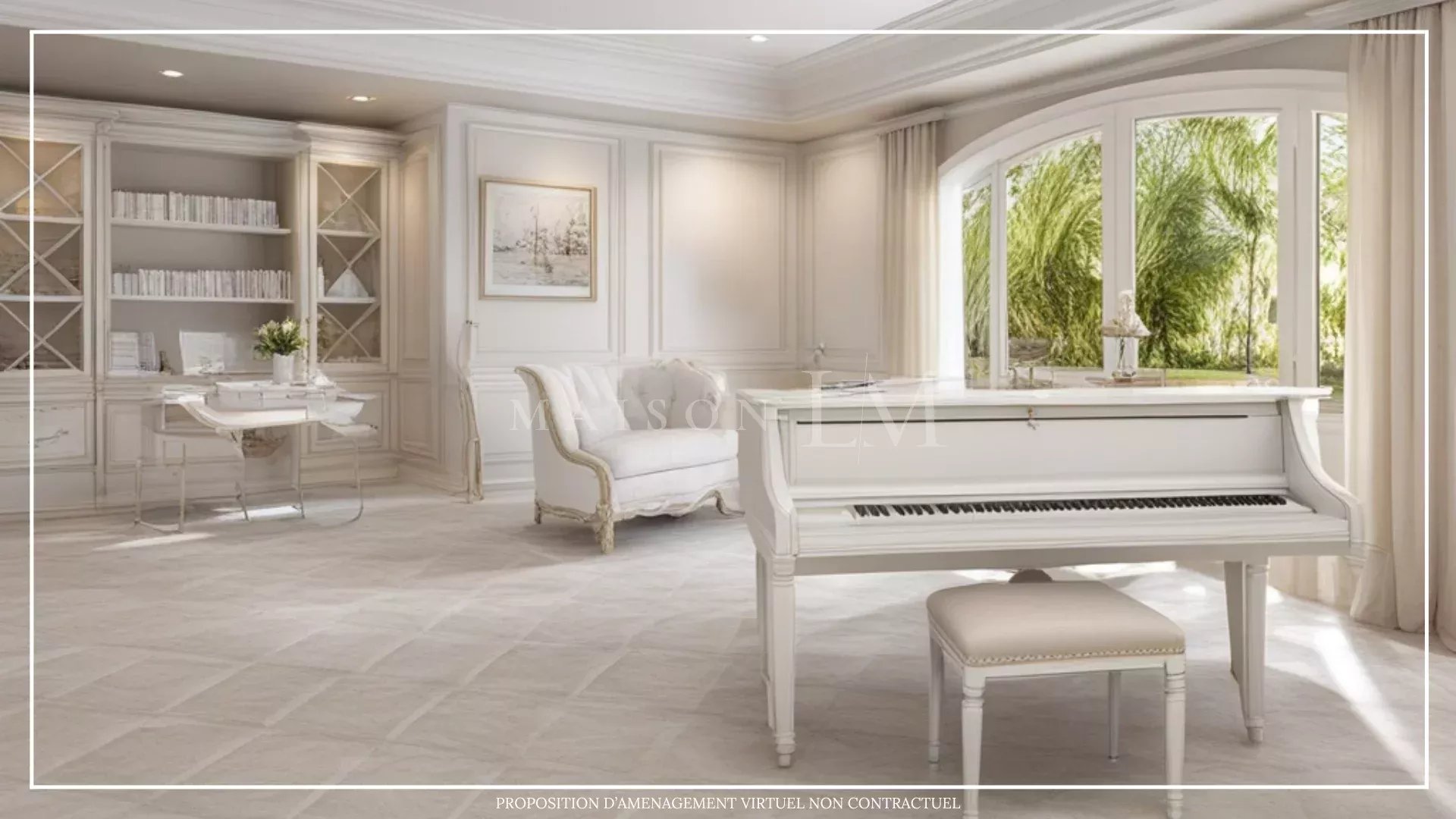 Dès l'entrée, un vaste séjour baigné de lumière vous accueille avec un piano, une cheminée et une bibliothèque, parfait pour des moments de détente ou de réception. Le salon, équipé d’un bar et d'une cheminée, s'ouvre sur une splendide terrasse prolongée par une piscine chauffée, invitant à la détente en plein air. La cuisine entièrement équipée avec sa salle à manger ravira les amateurs de gastronomie. Au rez-de-chaussée, trois chambres dont une suite parentale de 100 m² avec dressing et salle de bain privée offrent confort et intimité.