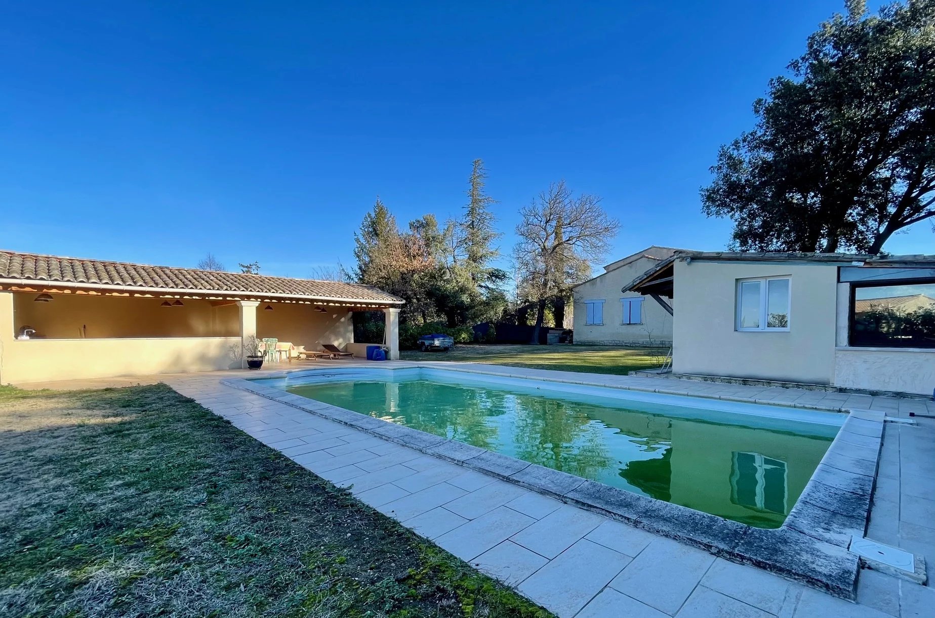 Piscine pool-house, plages carrelées, atelier et abri bois, l'ensemble sur un terrain clos et arboré d'environ 2000 m² en position dominante à l'Ouest.