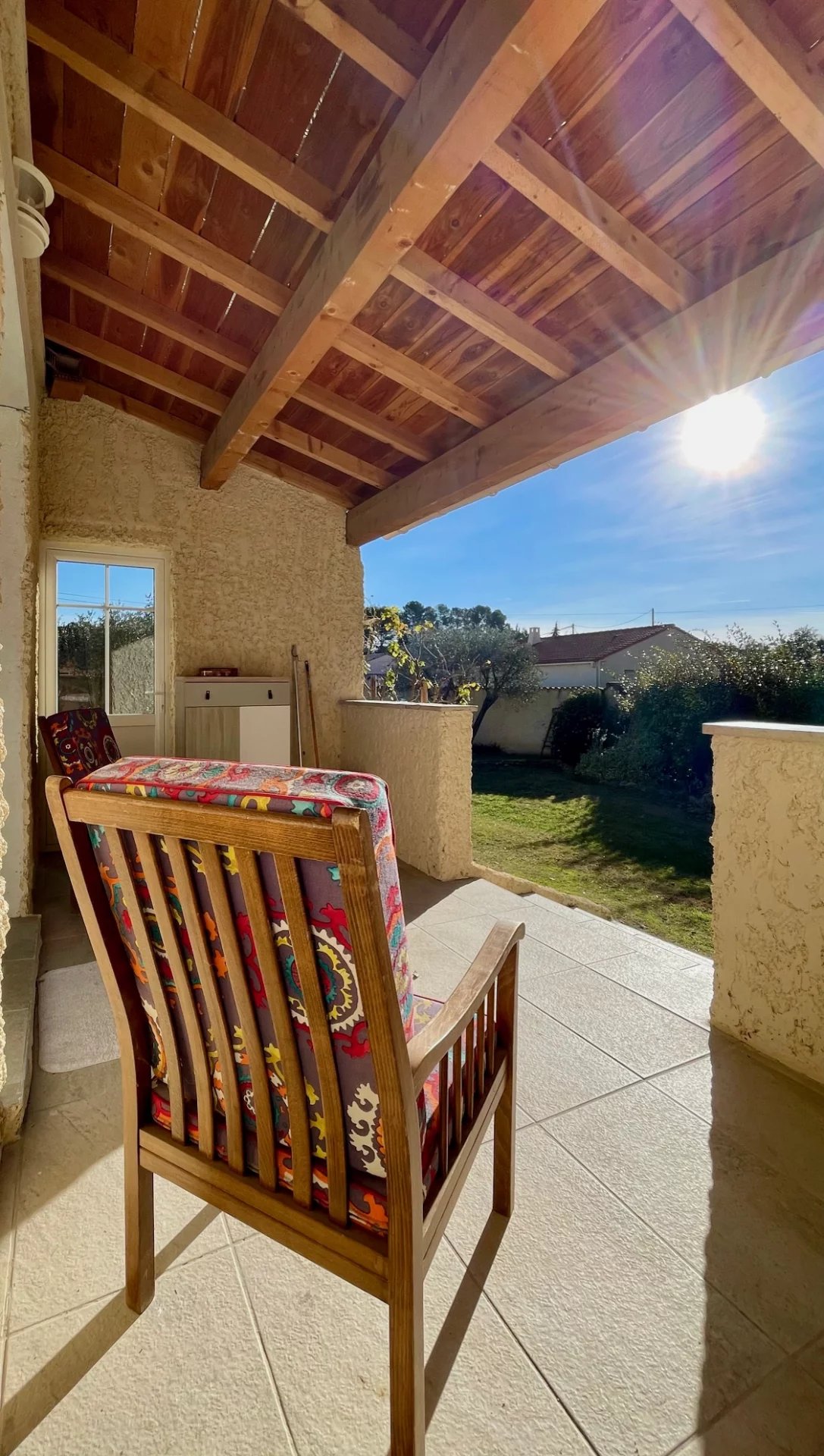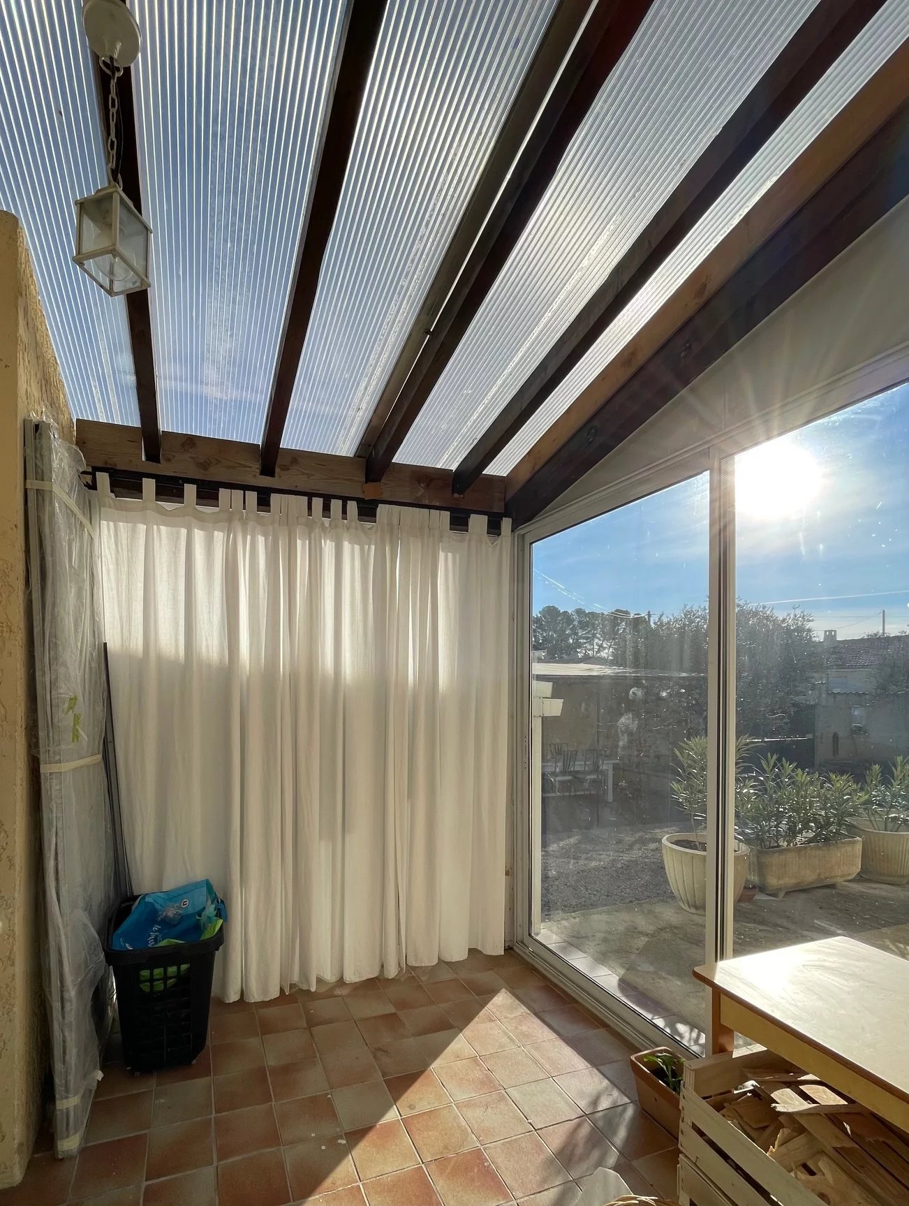 Dépendance attenante d'environ 37 m², terrasse avec pergola, véranda ouvrant sur le séjour cuisine, chambre et salle d'eau wc.