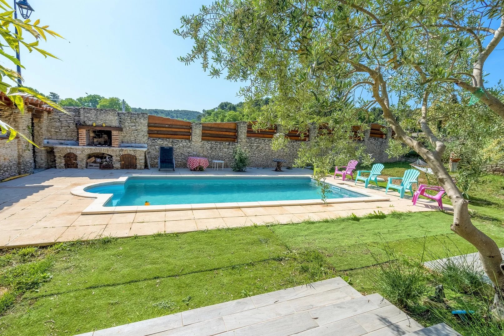 Le jardin est agrémenté d'une piscine béton (7x3,5) avec liner neuf + cuisine d'été.