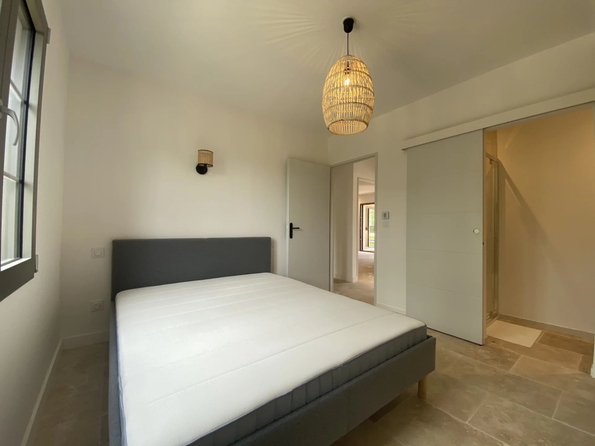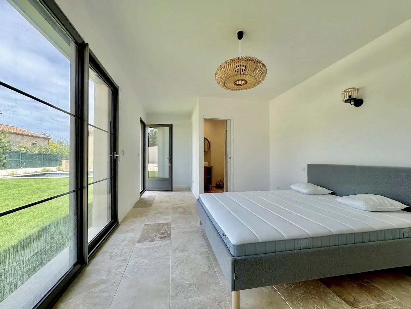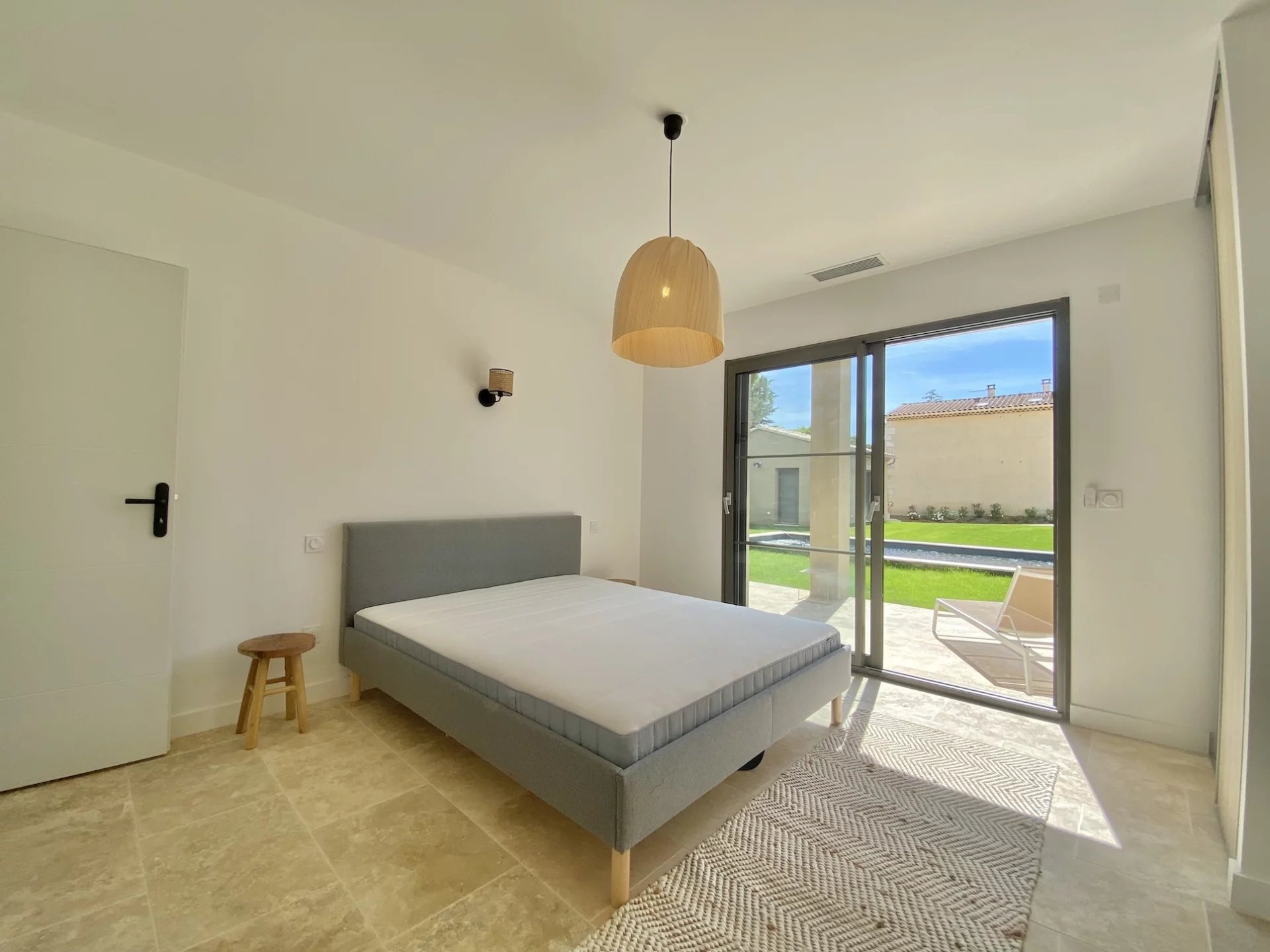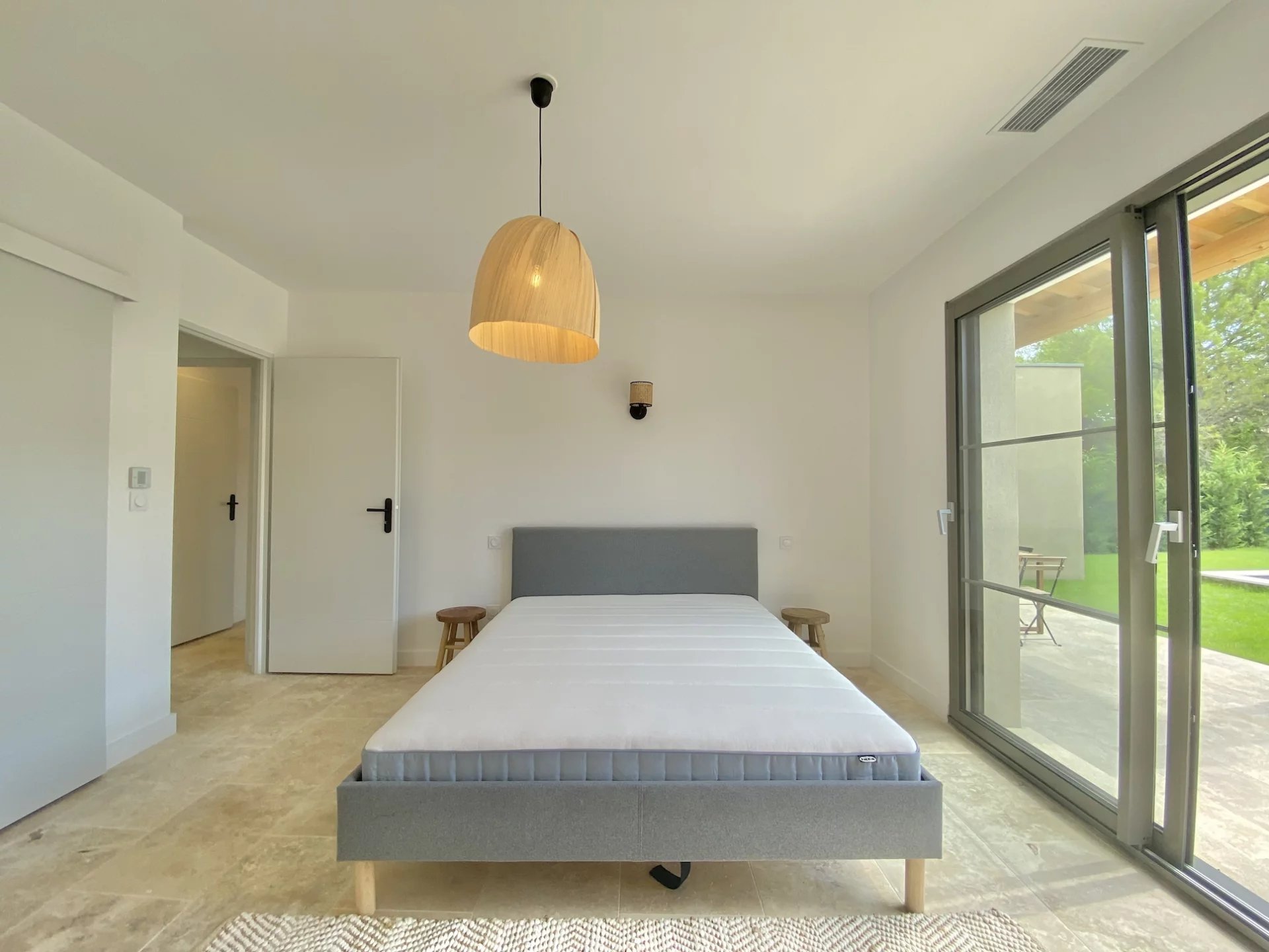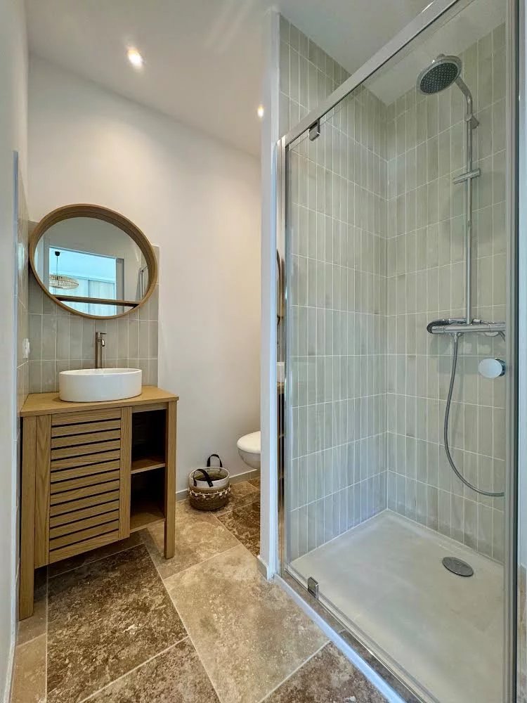Elle comprend trois chambres en suite dans la maison principale et une suite indépendante d'environ 20 m² ouvrant sur le jardin, parfaite pour accueillir famille et amis. La chambre principale bénéficie d'un accès direct à la terrasse. Toutes les chambres sont dotées de placards coulissants.