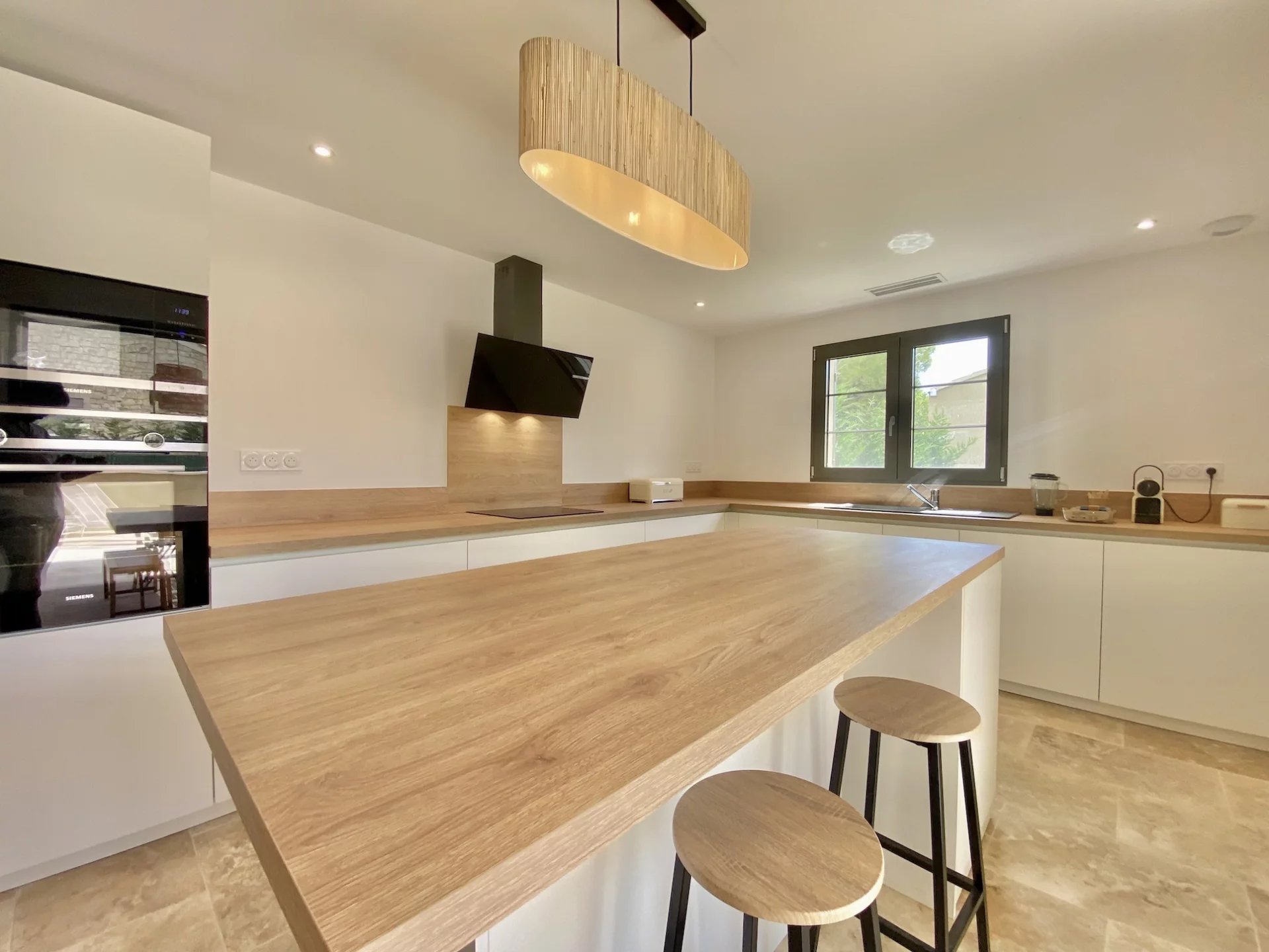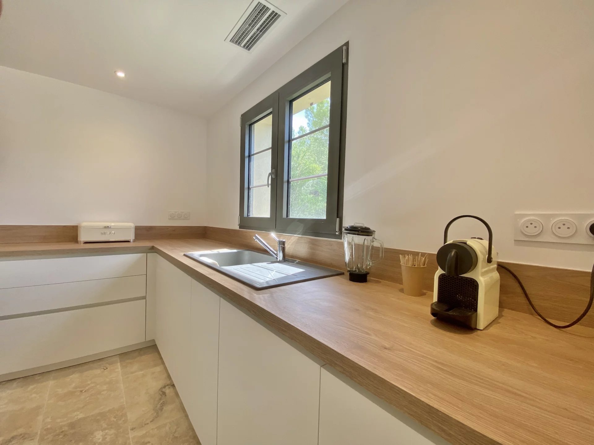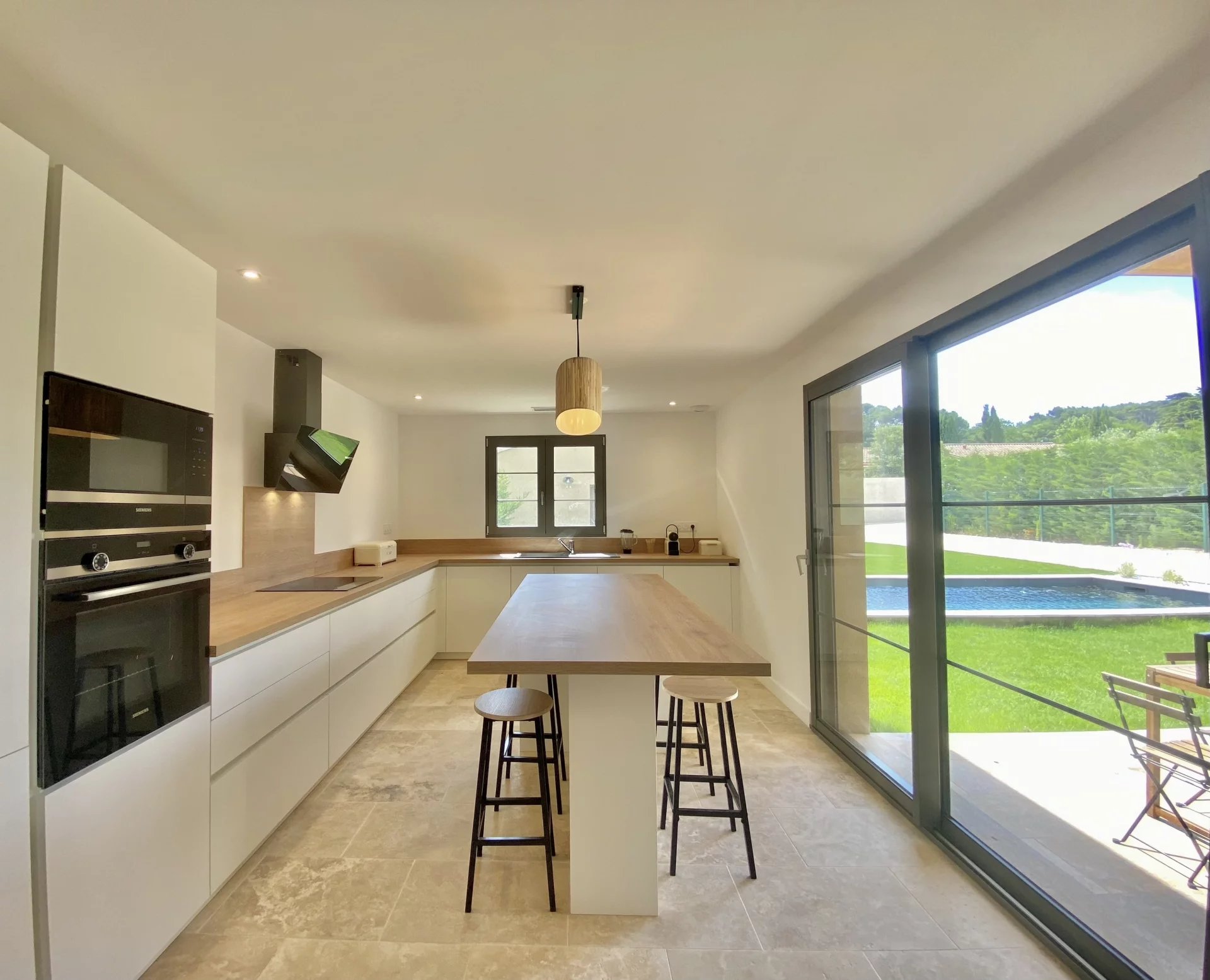 La villa offre des volumes généreux et ses pièces sont inondées de lumière. La cuisine moderne, entièrement équipée (four, micro-ondes, réfrigérateur-congélateur, lave-vaisselle), s'accompagne d'une buanderie et de toilettes.