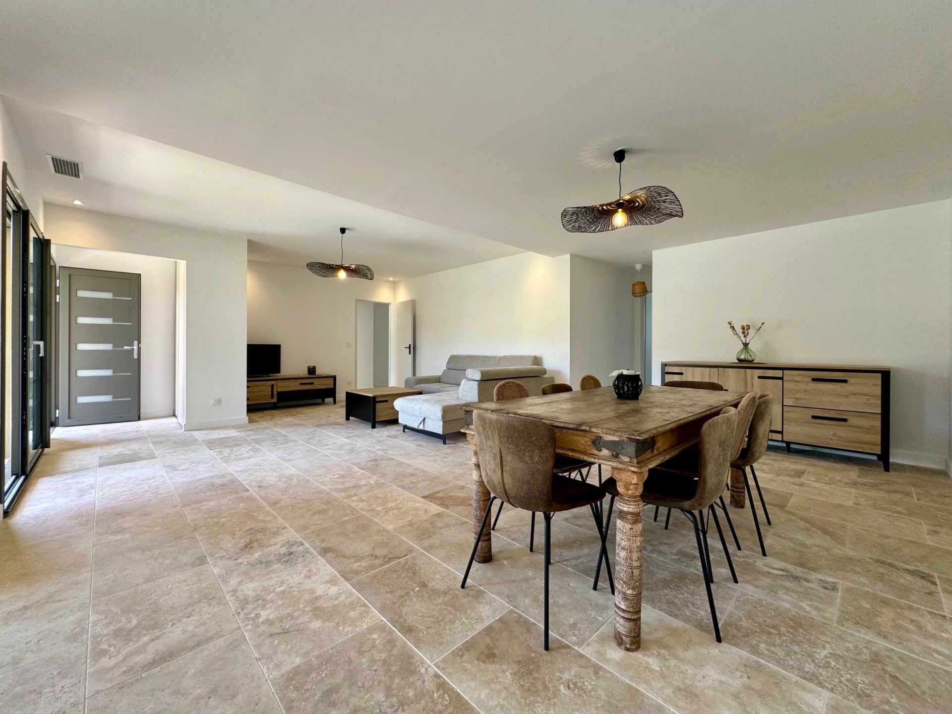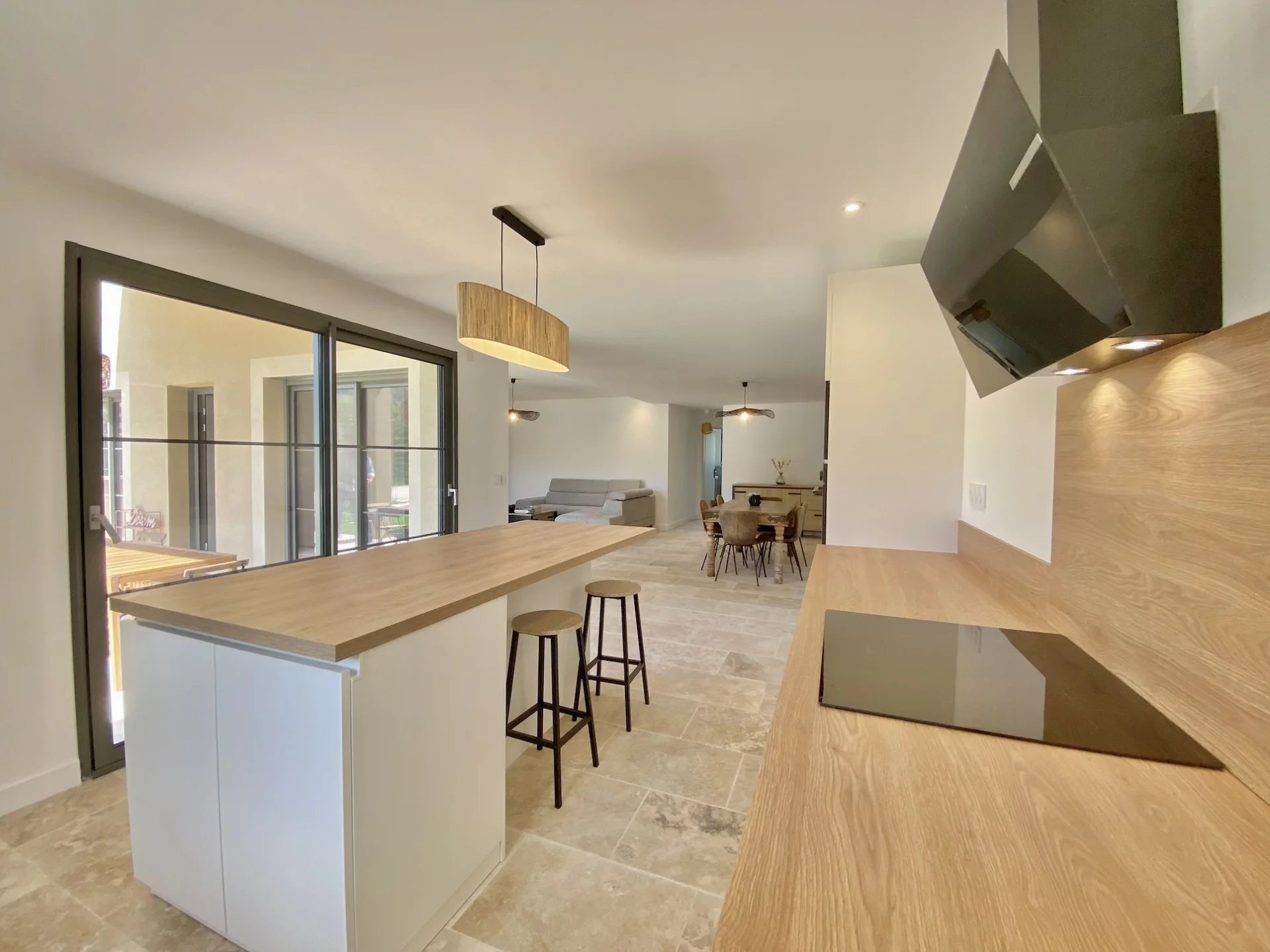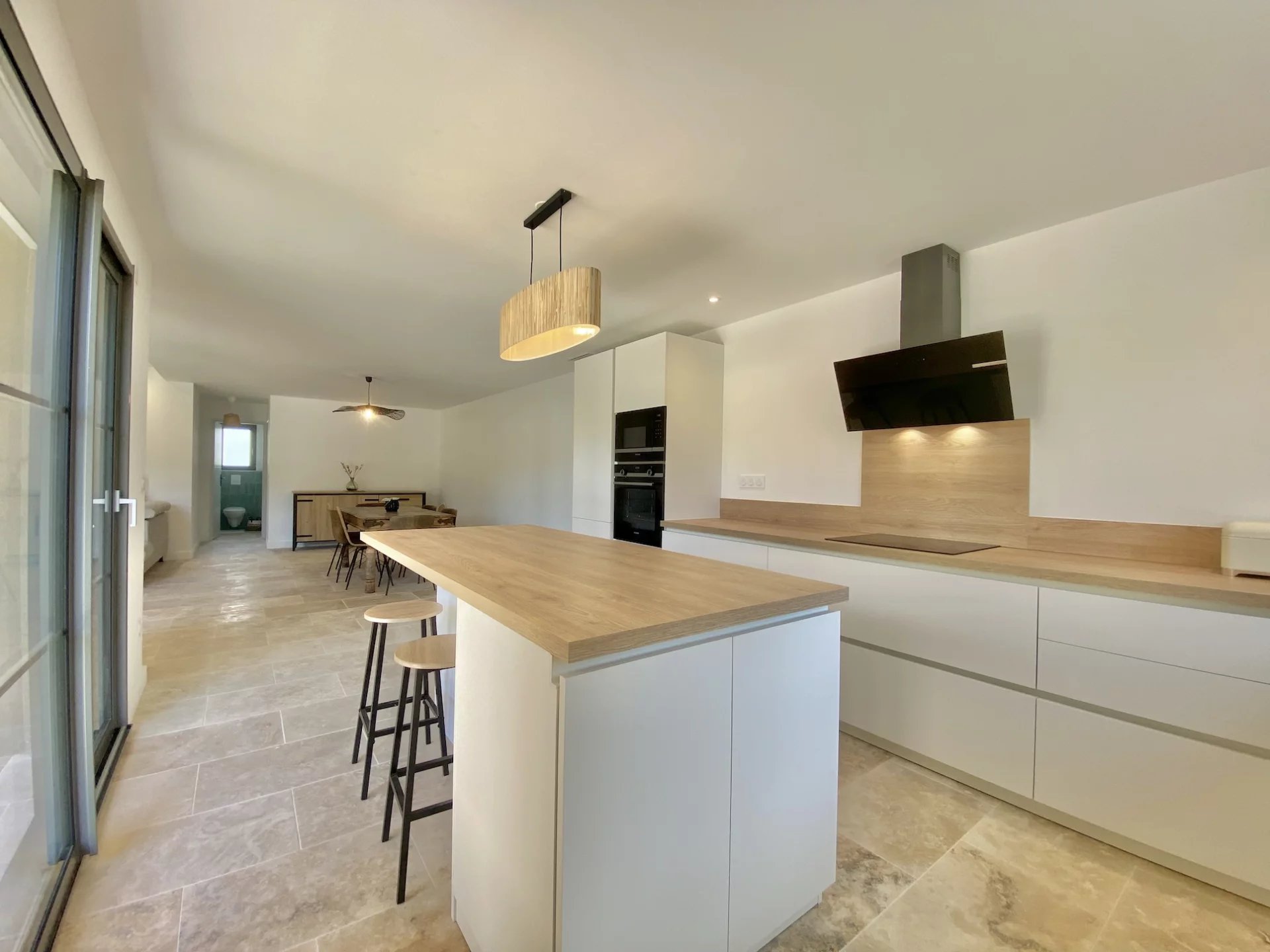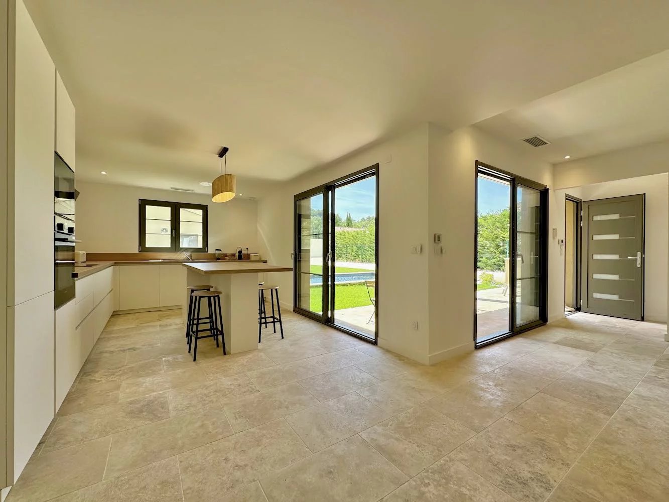 La villa offre des volumes généreux et ses pièces sont inondées de lumière. La cuisine moderne, entièrement équipée (four, micro-ondes, réfrigérateur-congélateur, lave-vaisselle), s'accompagne d'une buanderie et de toilettes.