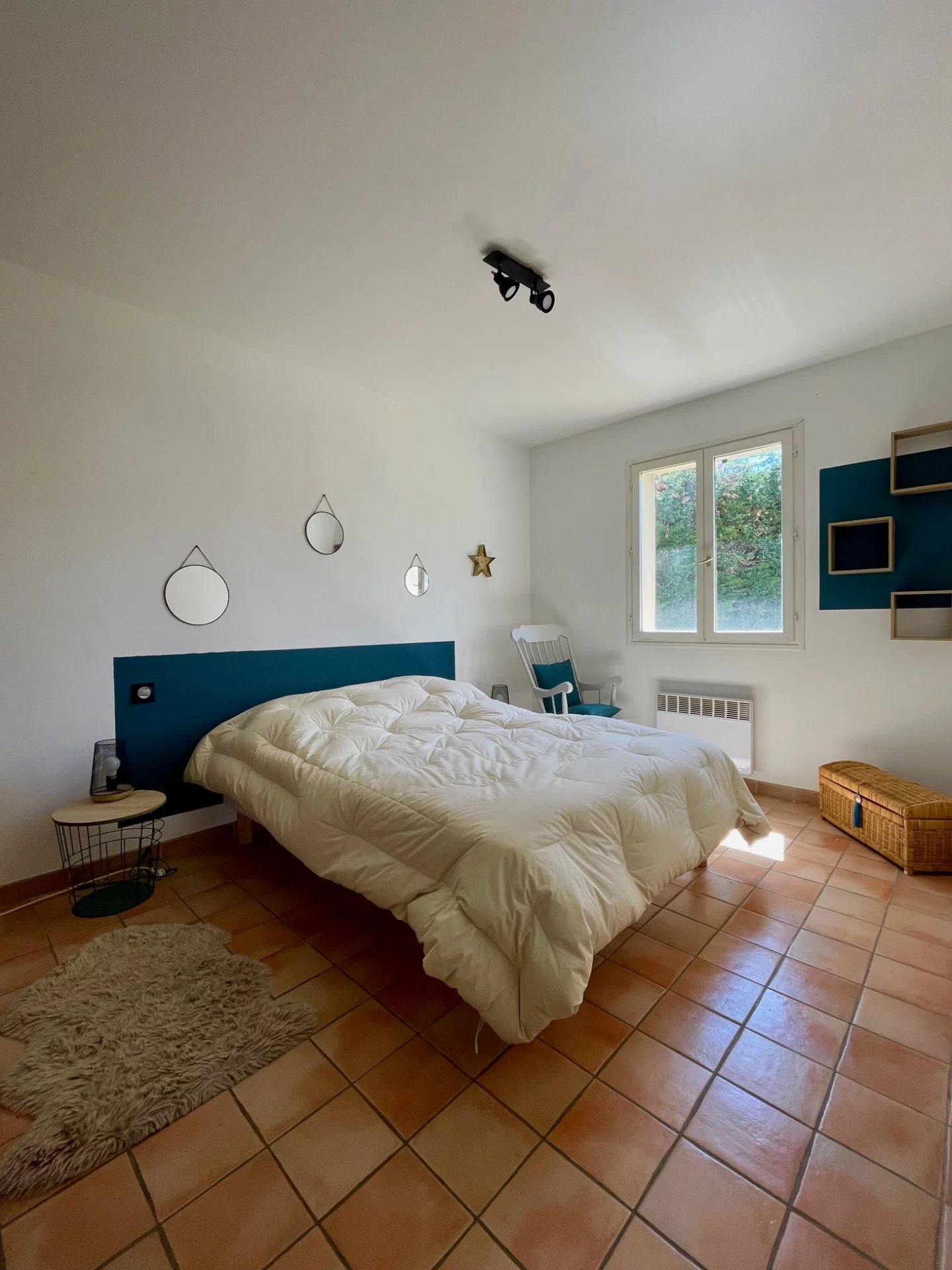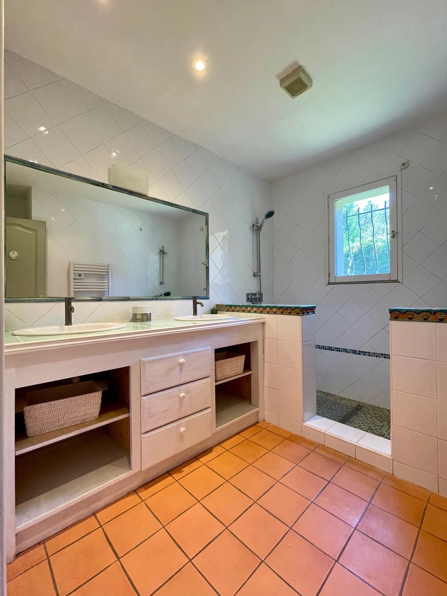 Premier étage : accessible par deux escaliers indépendants dont un pour la chambre parentale avec douche et terrasse , et par le second escalier d'un espace bureau avec salle d'eau (chambre).