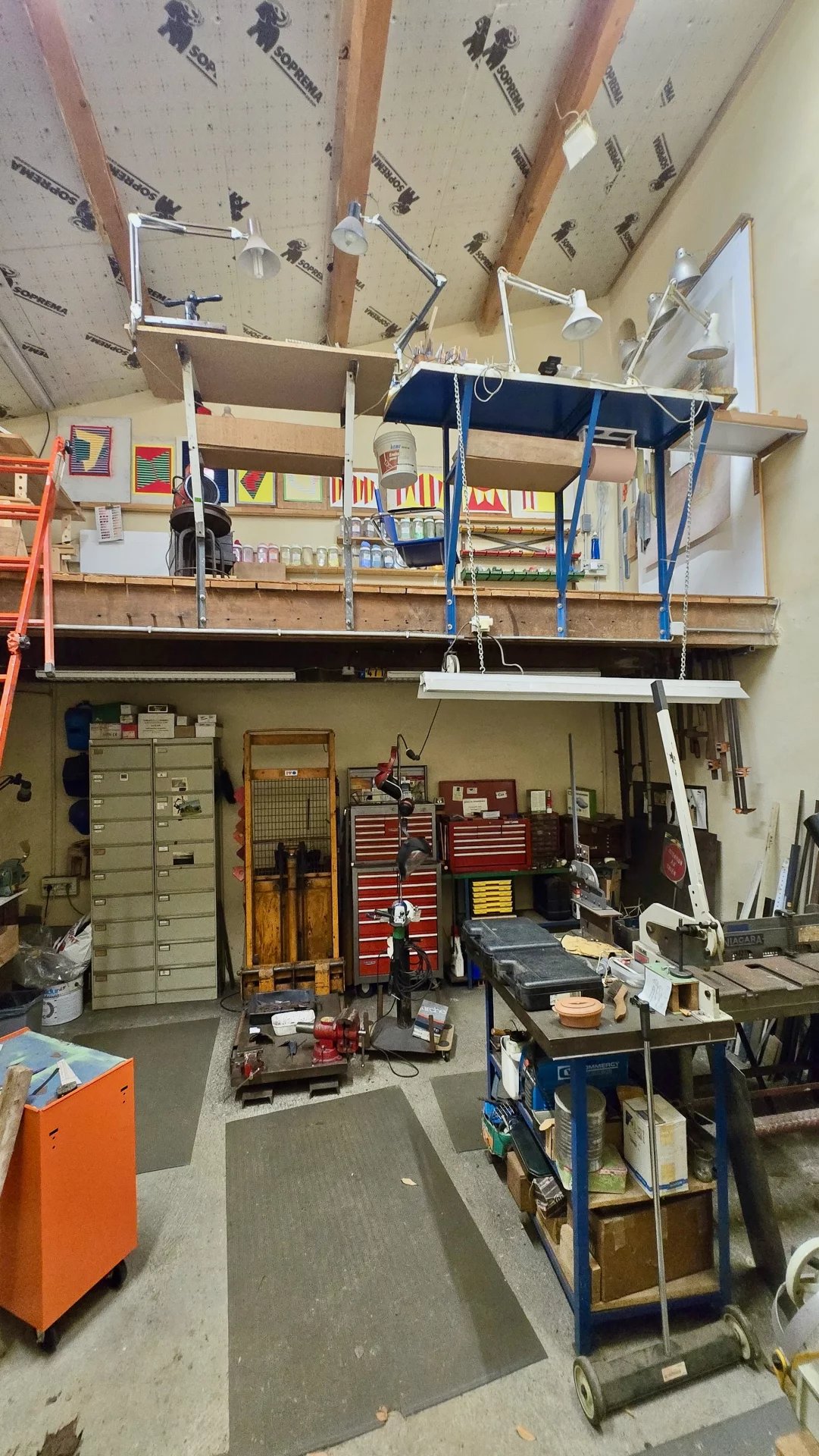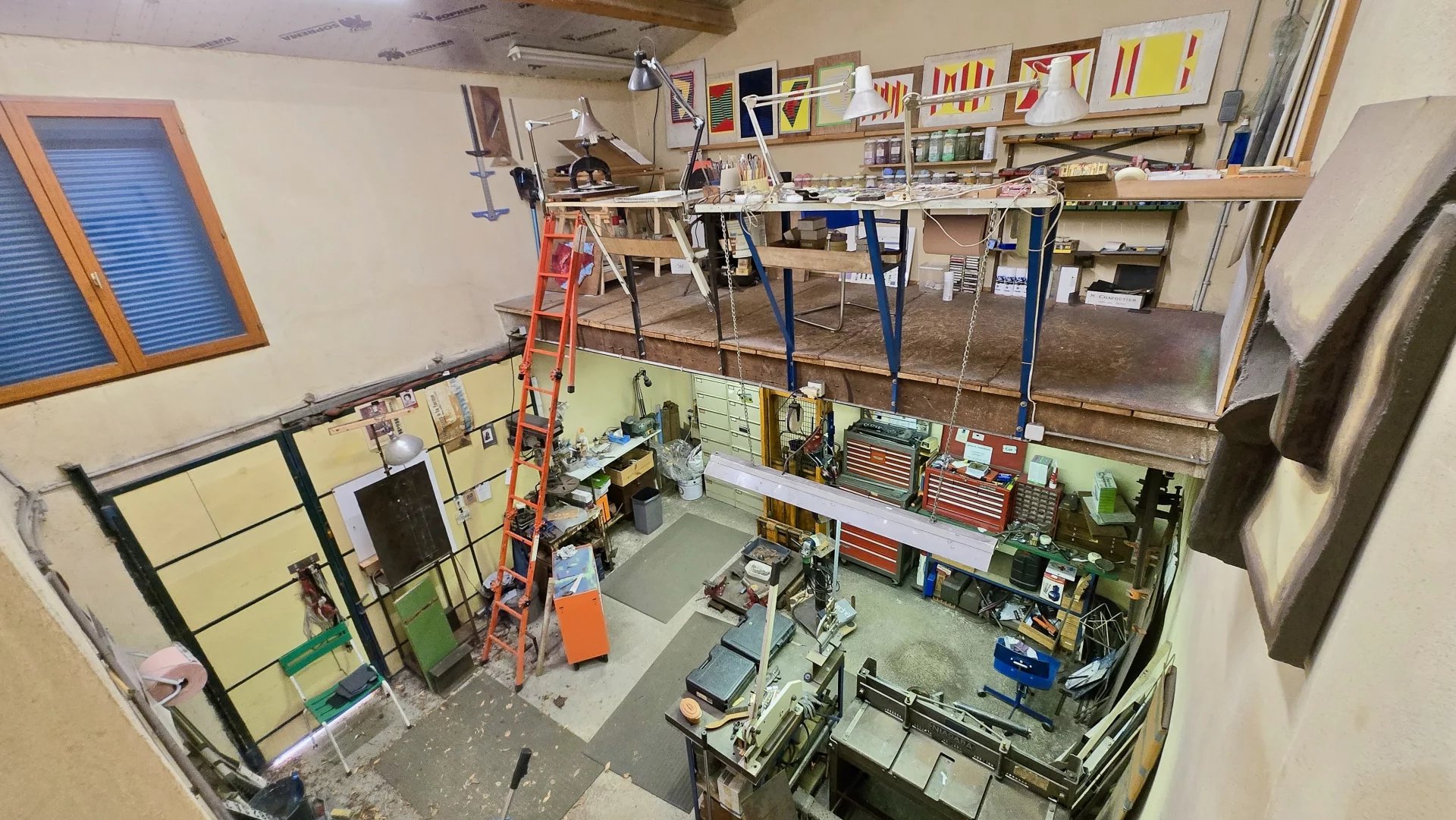 Garage (23 m²) et atelier (14 m²) avec hauteurs sous plafond impressionnantes (plus de 5 m)