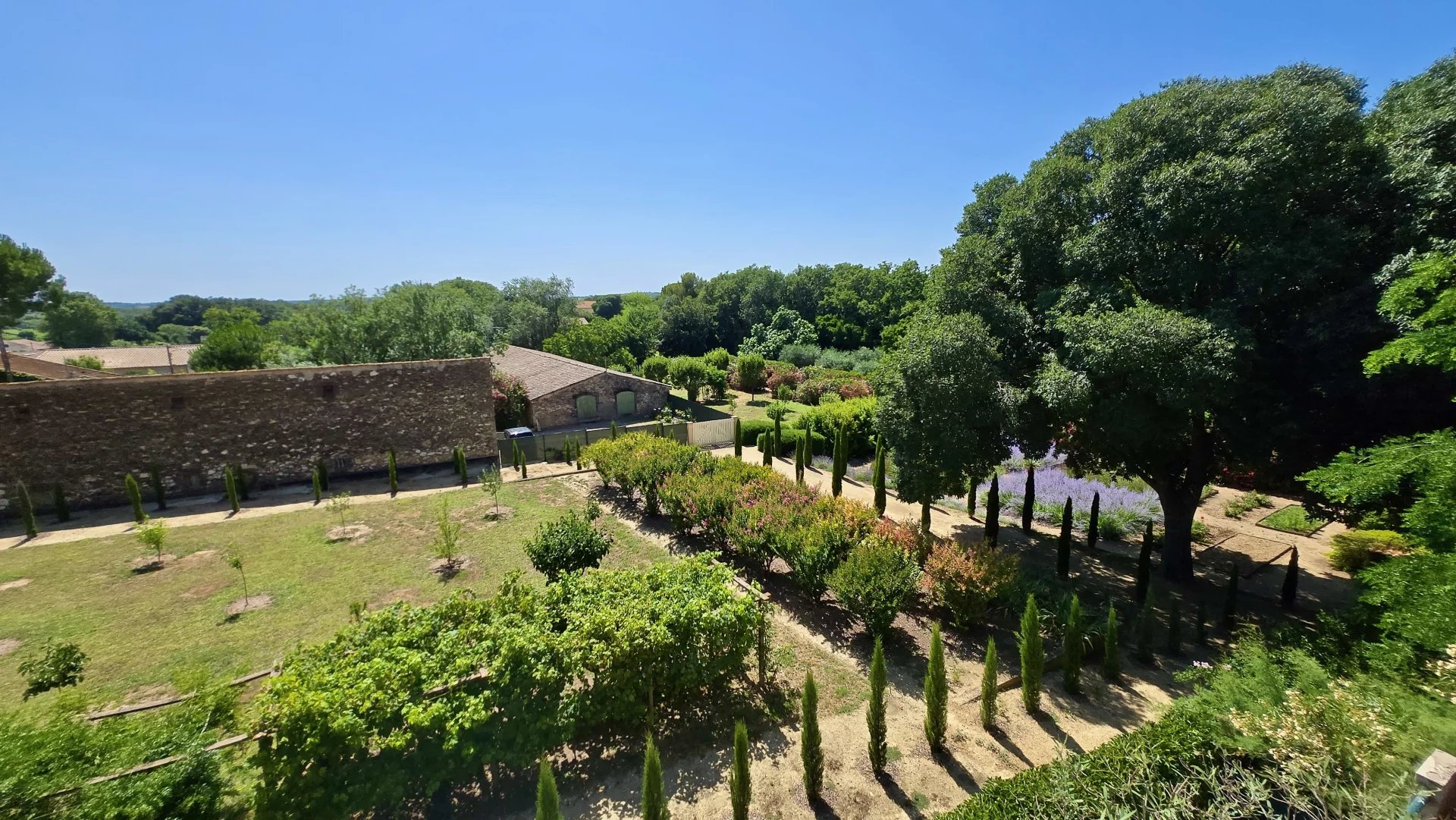 Vue exceptionnelle sur les jardins du château depuis la terrasse – un luxe rare dans un village