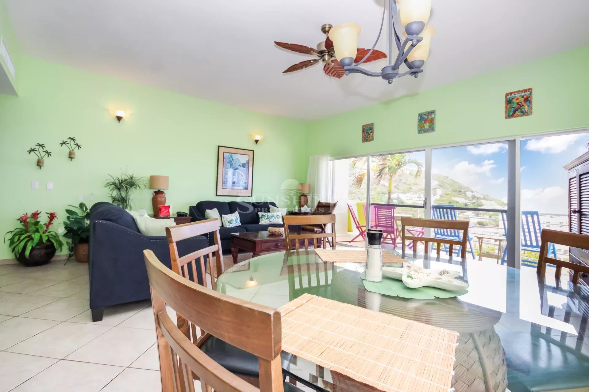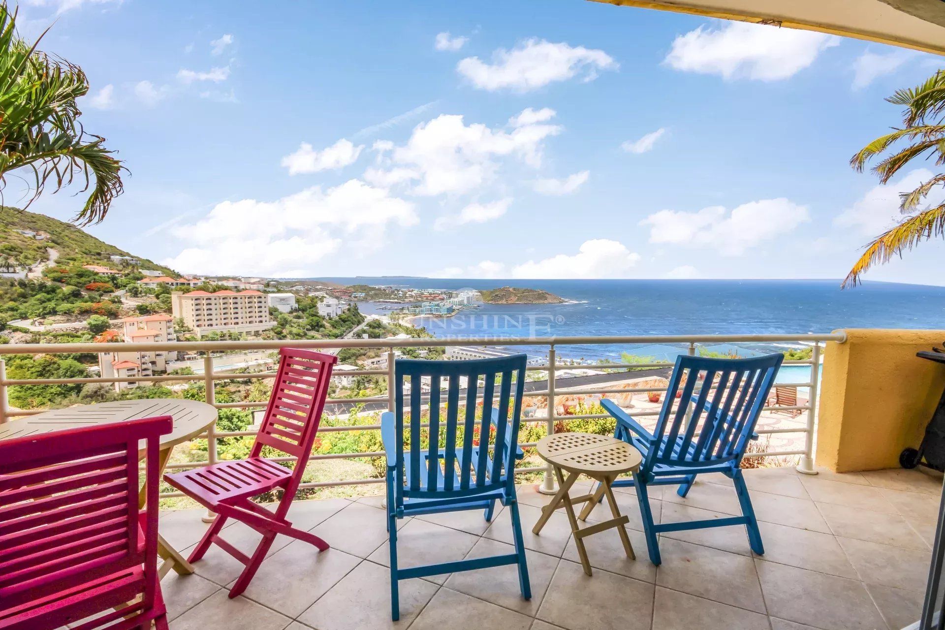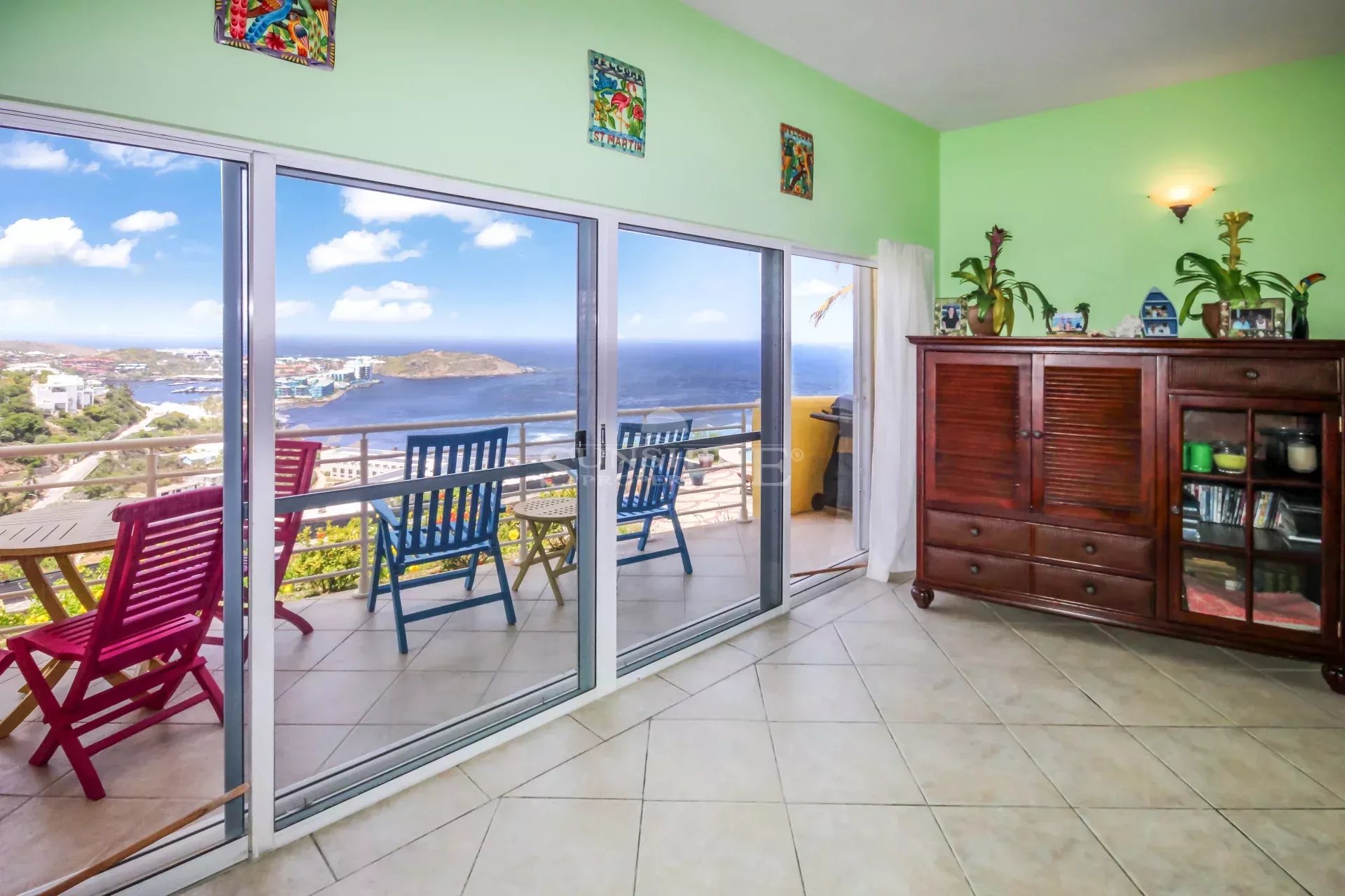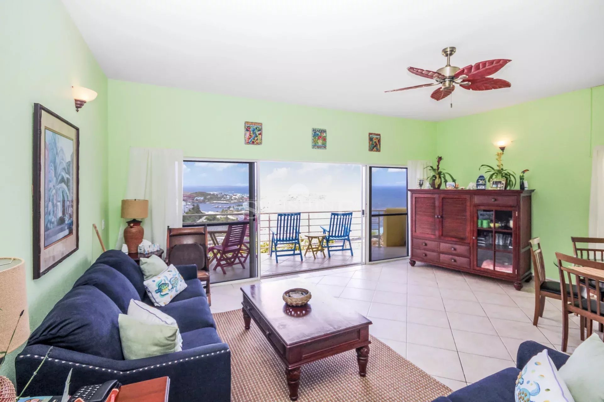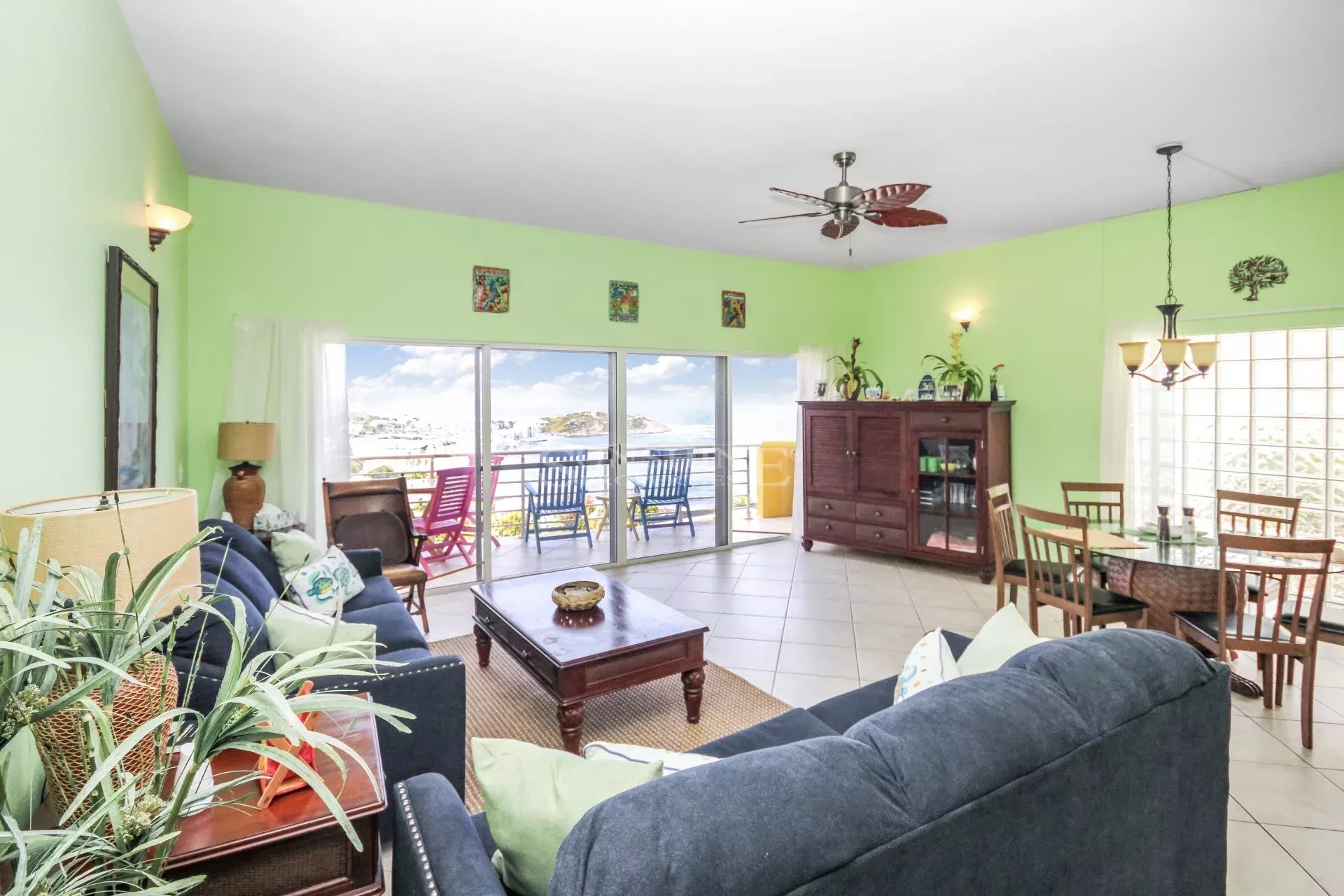 This condo is easy to access with only a few steps down towards the entrance door after you park your car at the common parking lot right in front building. Once you enter the property, you will be confronted with the amazing views towards the ocean and the Oyster Pond area. Views will be enjoyed from the kitchen, living room, balcony, and master bedroom. The master bedroom has an ensuite bathroom, and the remaining 2 bedrooms have a full bath in the middle. There is a powder room located in the hallway as well. The condo is offered fully furnished.