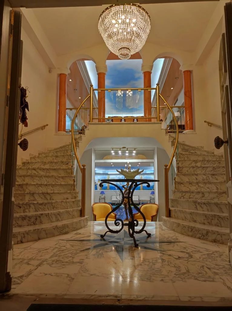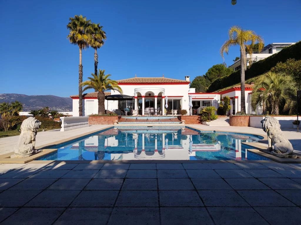A l’étage : un hall, une triple réception de plus de 70 m², une salle à manger donnant sur le terrasse vue piscine, une cuisine haut de gamme donnant sur la terrasse plein sud, une chambre de maître principale (jacuzzi, salle d’eau, garde-robes, WC, terrasse vue mer), 3 chambres de maître avec salle d’eau et WC attenants, une salle de bains, une véranda.