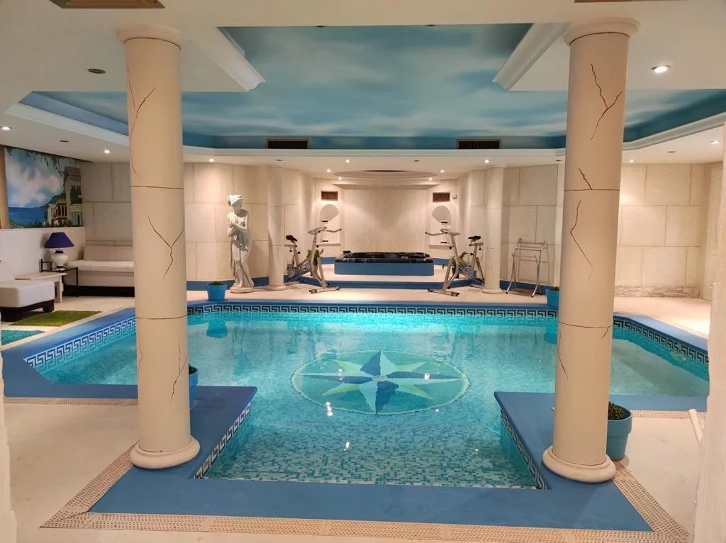 Au rez-de-chaussée : entrée avec deux escaliers de part et d'autre du hall, une piscine intérieure chauffée, un sauna, un hammam, une salle d’eau, WC, une buanderie, une salle de sport avec salle home cinéma, deux chambres avec garde-robes et salles d’eau et WC en suite, un bureau, une loge de gardien (3 pièces), une cave à vin, une cave.