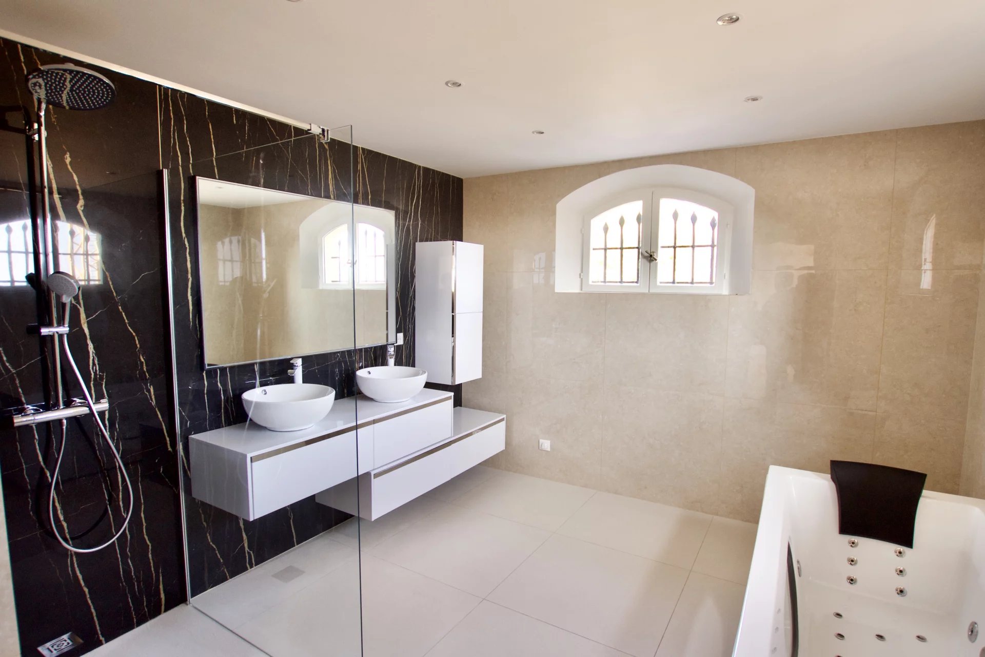 REVENU A LE VENTE Entre Cannes et Antibes, villa d'environ 300m2 habitable avec piscine et vue mer panoramique dominant Vallauris. Edifiée sur un terrain en restanques de 1500m2, la maison sur deux niveaux comprends une vaste entrée de 30m2, une grande piece a vivre avec cheminée d'environ 100m2, 4 chambres, 3 salles de bain, cuisine entièrement équipée avec ilot central, sauna infrarouge, piscine avec plage en bois exotique, garage fermé Villa entièrement climatisée et rénové.