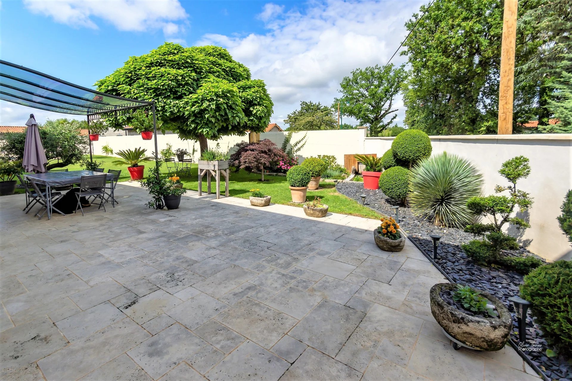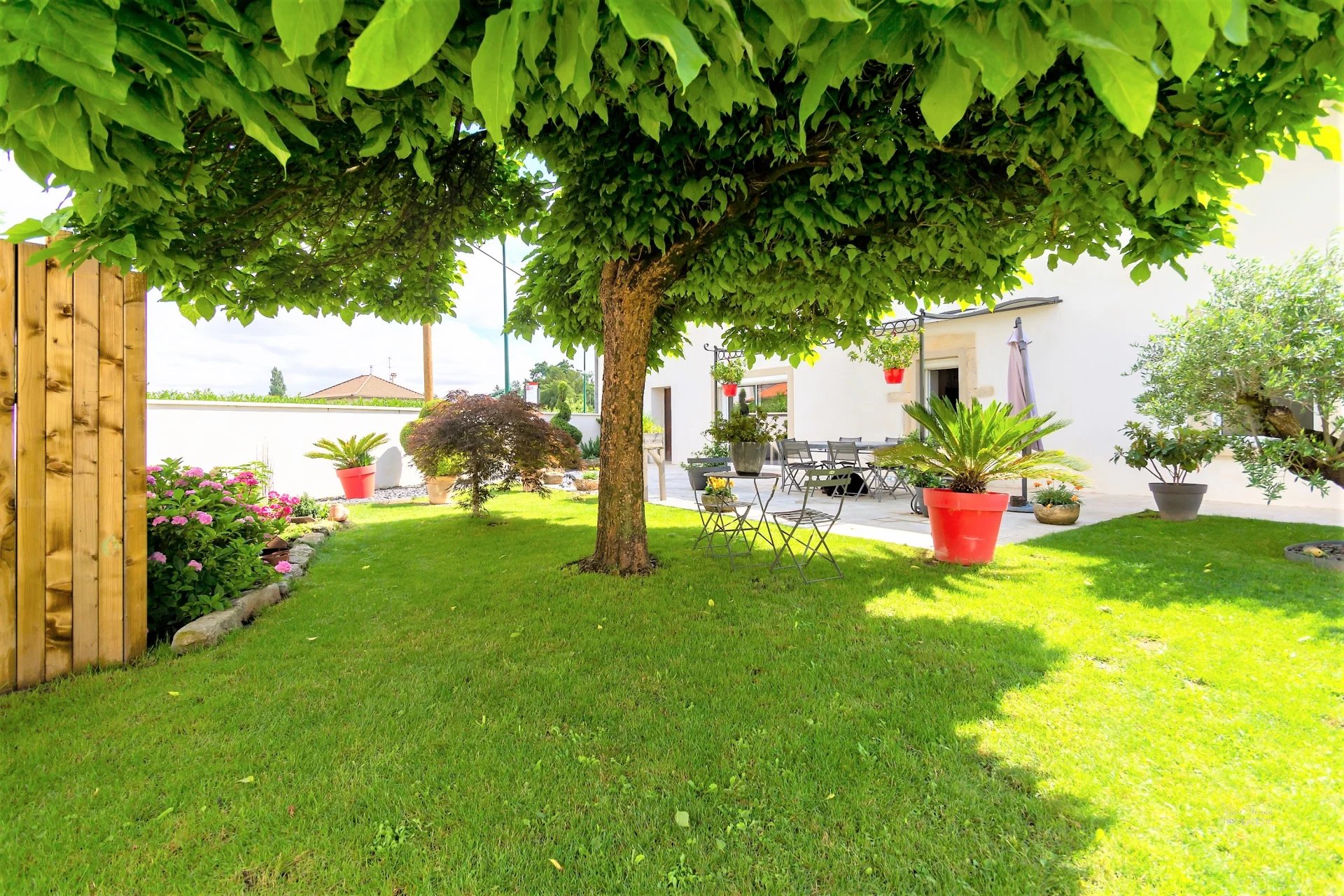 Le jardin "piscinable" se prête complètement aux moments de détente et de convivialité tant recherchés! par son alternance entre une grande terrasse en pierres naturelles, un bassin à poisson et un sublime décor végétal...