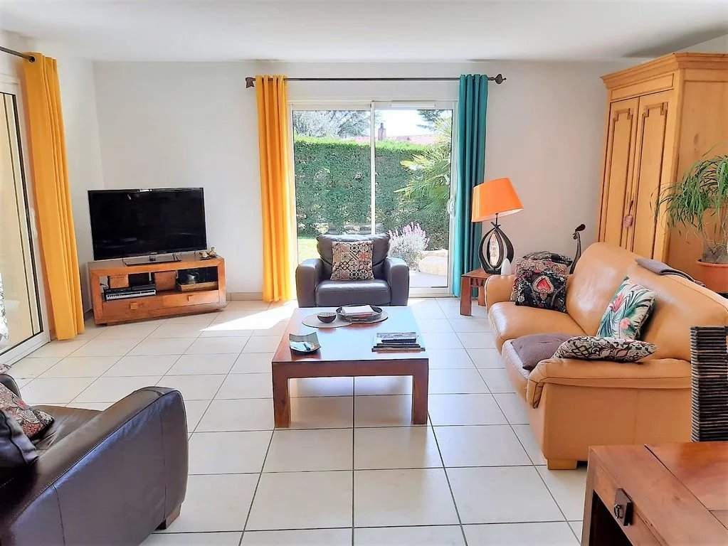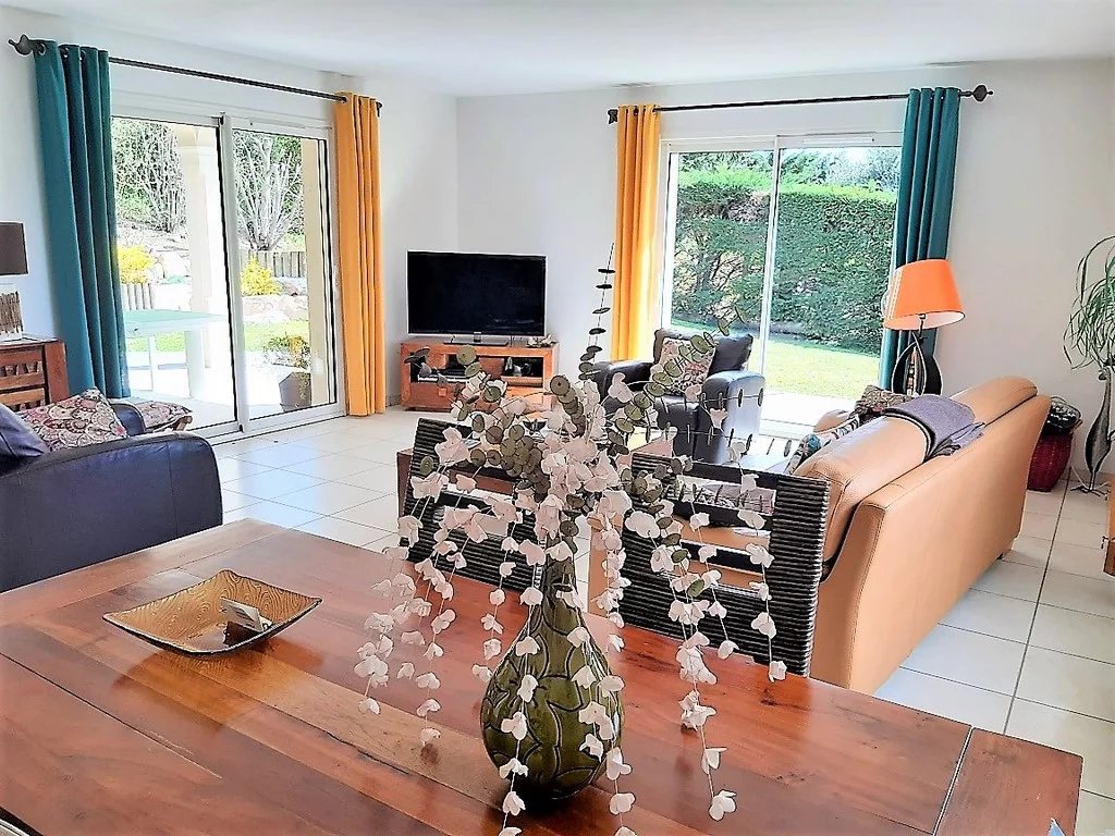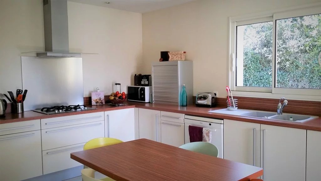 Une cuisine équipée ouvrant sur une grande terrasse couverte, un salon séjour lumineux, 4 chambres (de 13 à 15m²) dont une avec une salle d'eau attenante, une salle de bains, un cellier buanderie, 2 WC et un grand garage (40m²) carrelé et isolé.