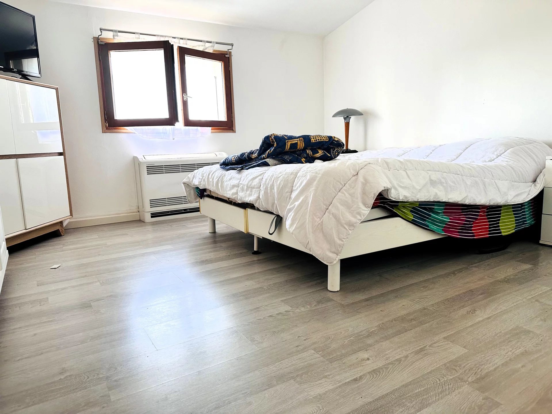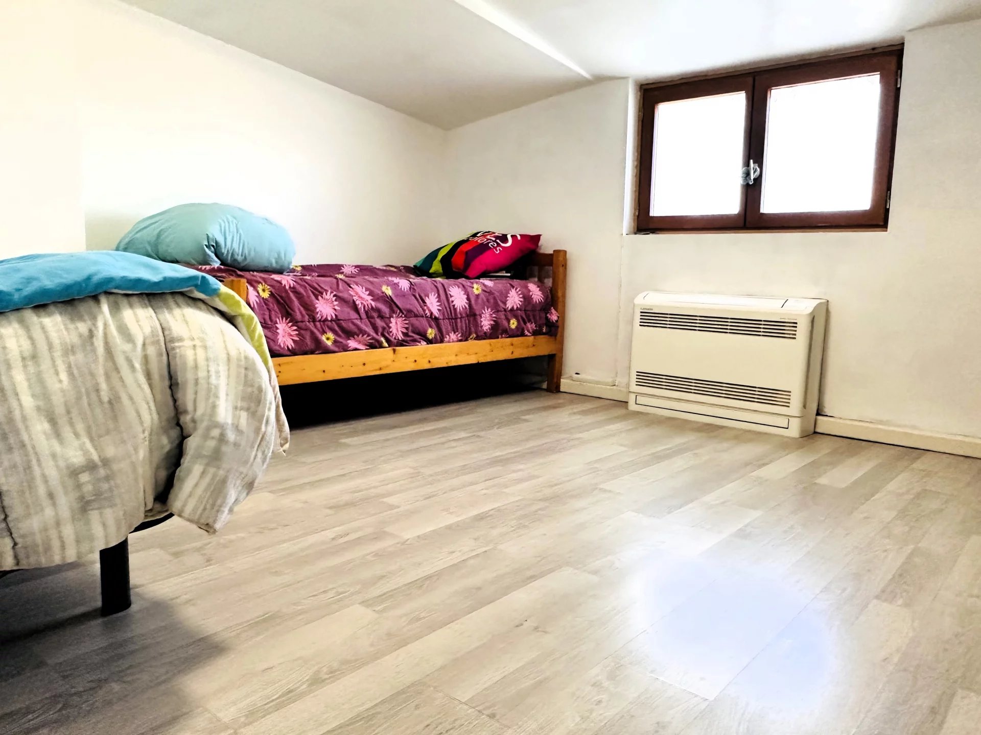 L'étage comprend 2 chambres et un espace bureau, une salle d'eau et des WC séparés.